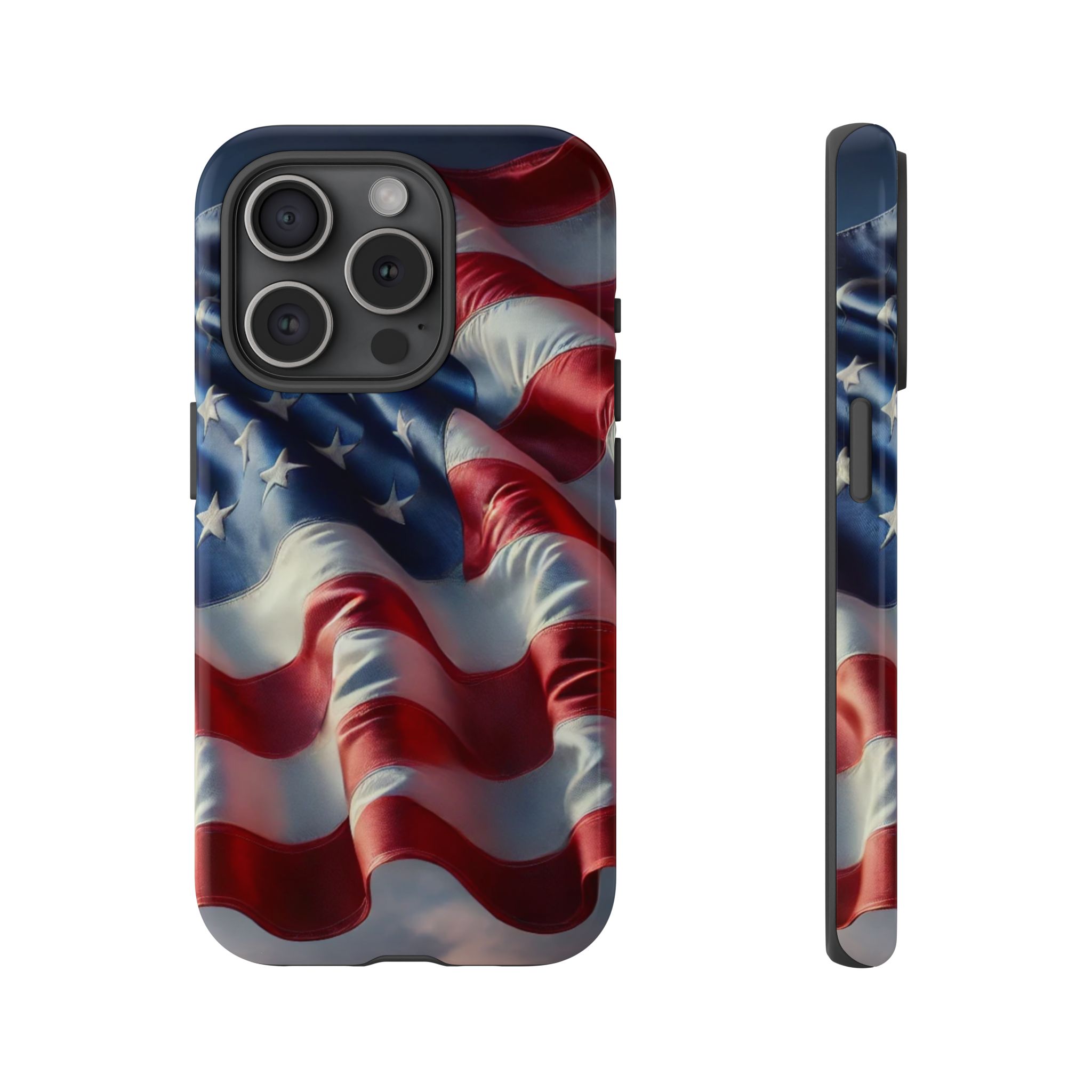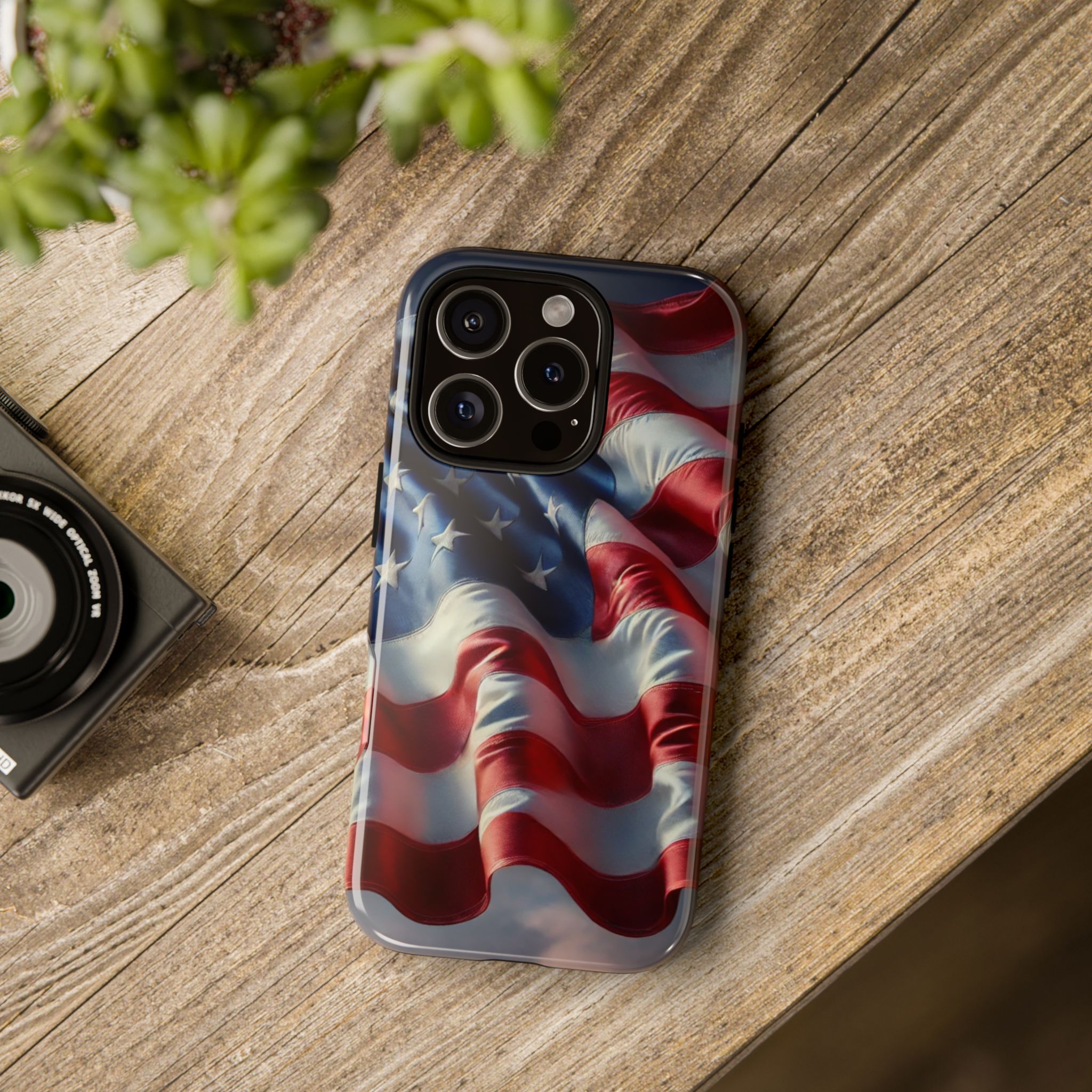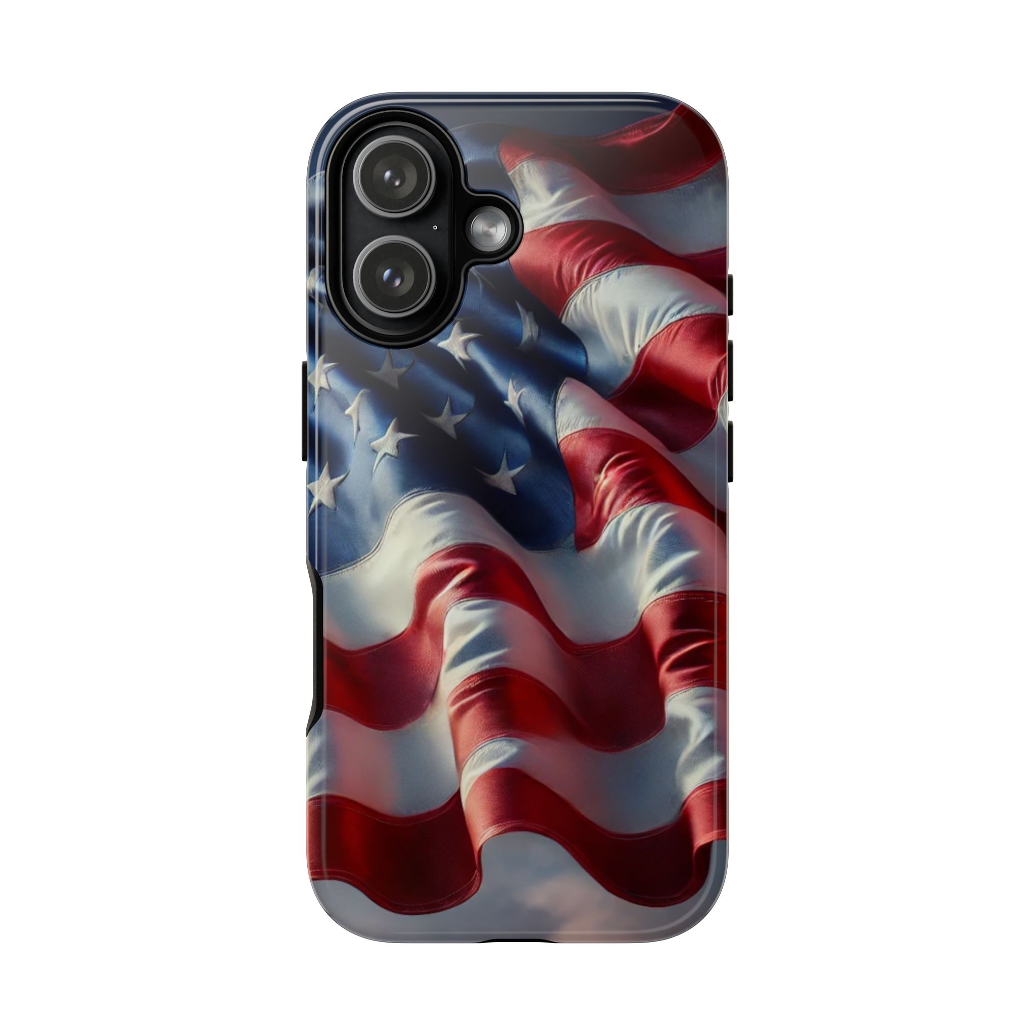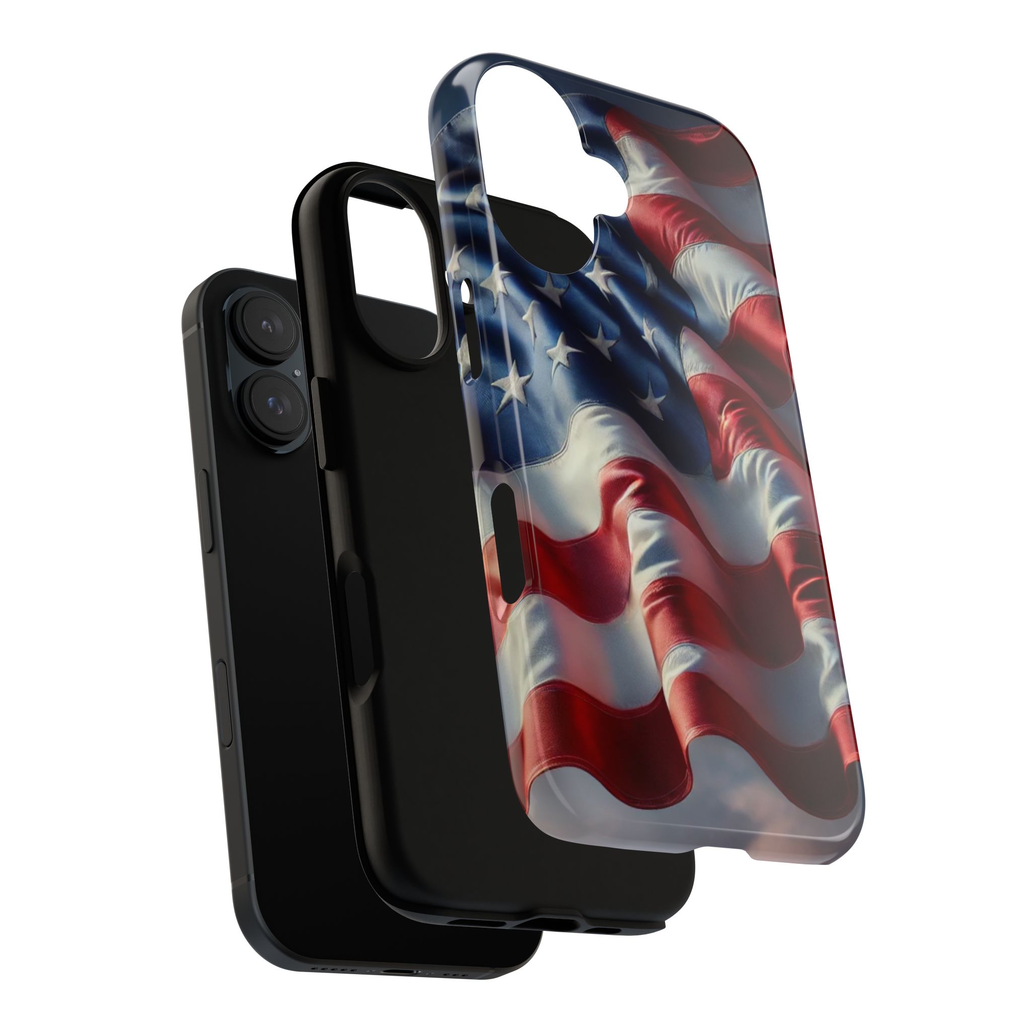 American Flag Phone Case with bold stars and stripes, tough dual-layer build, UV-protected finish, and wireless charging support. Durable pride meets everyday use.