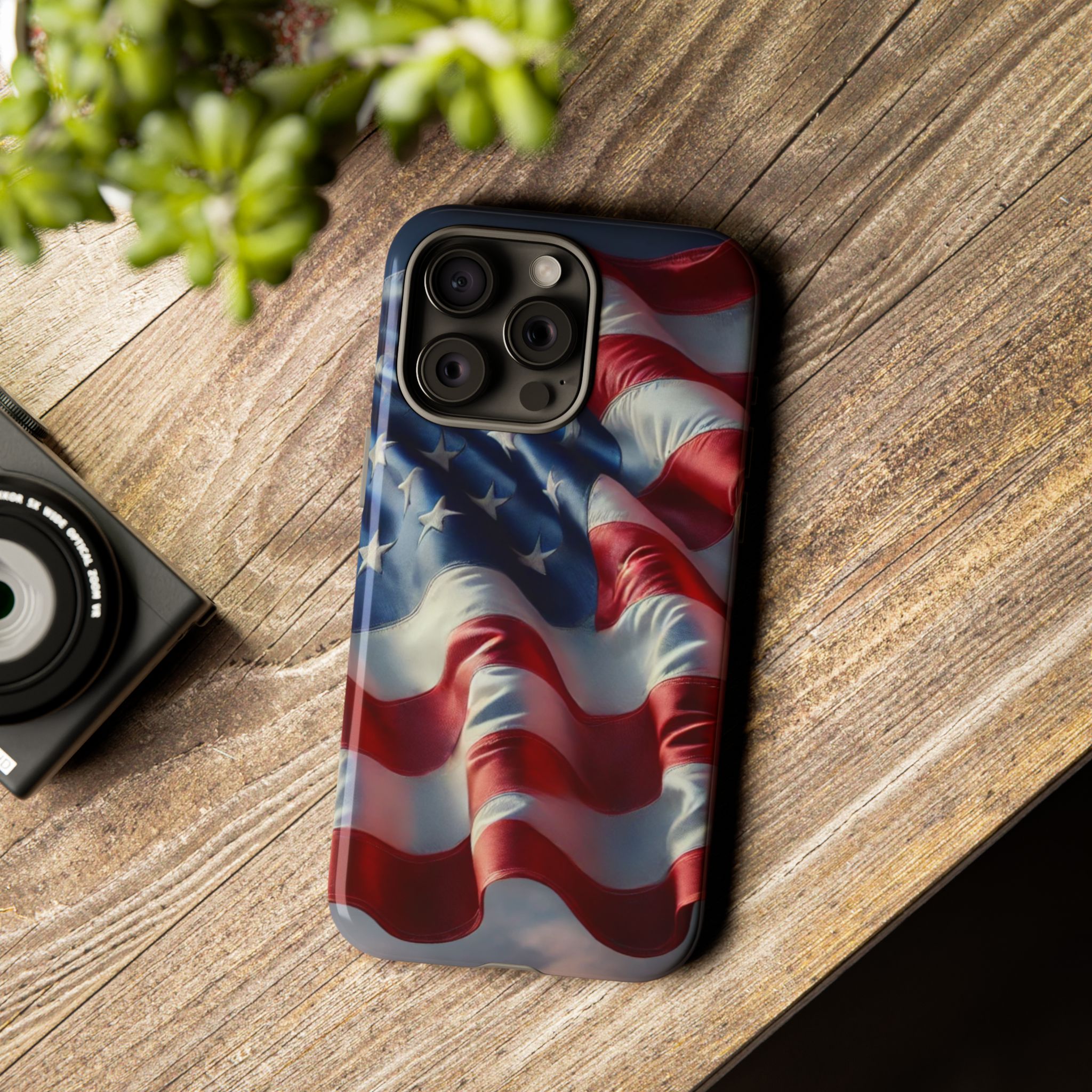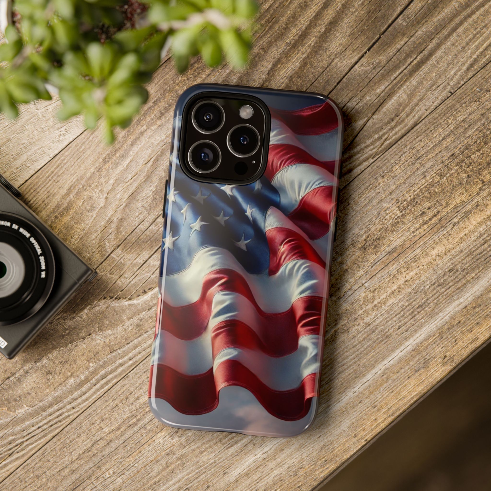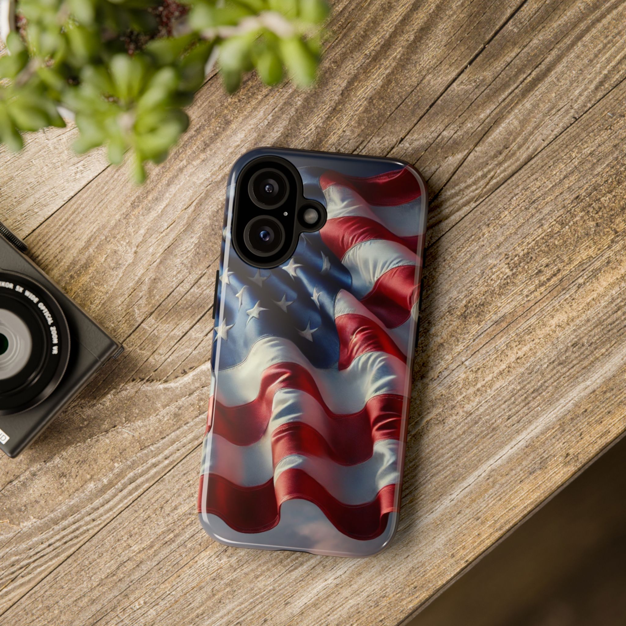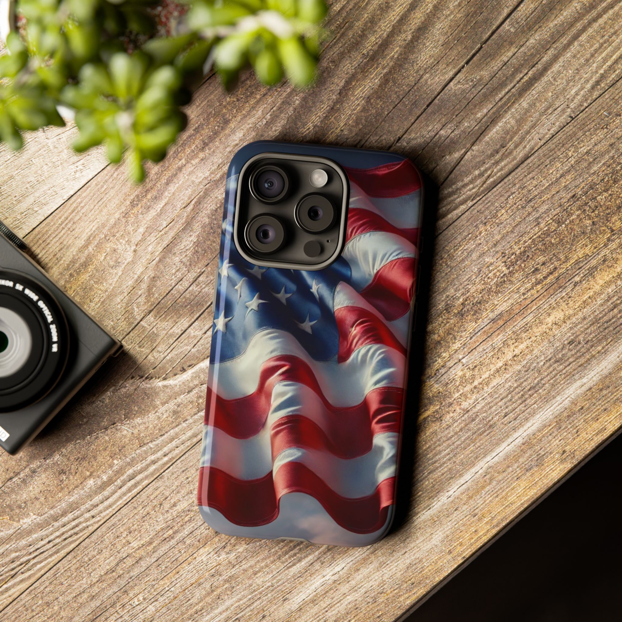 American Flag Phone Case with bold stars and stripes, tough dual-layer build, UV-protected finish, and wireless charging support. Durable pride meets everyday use.