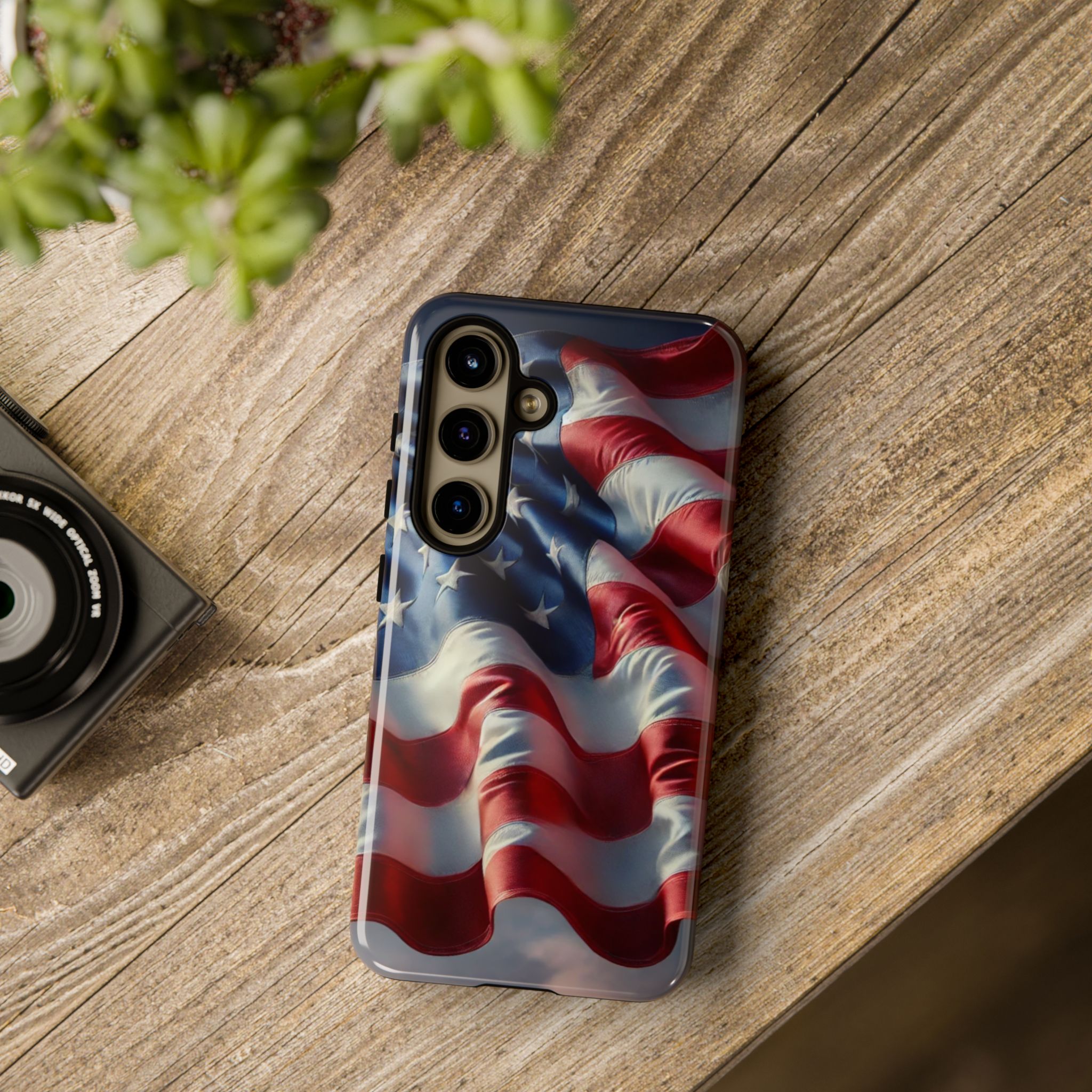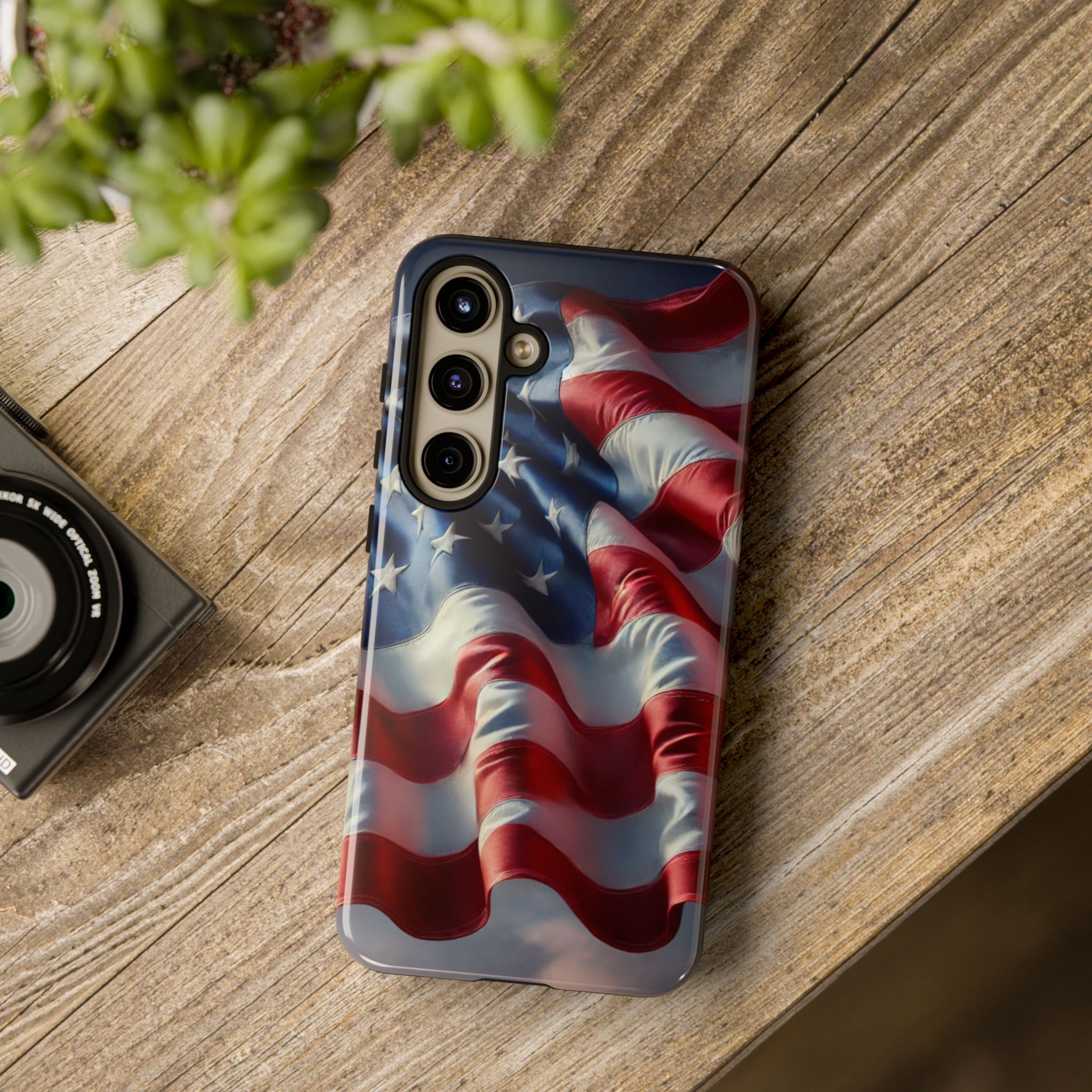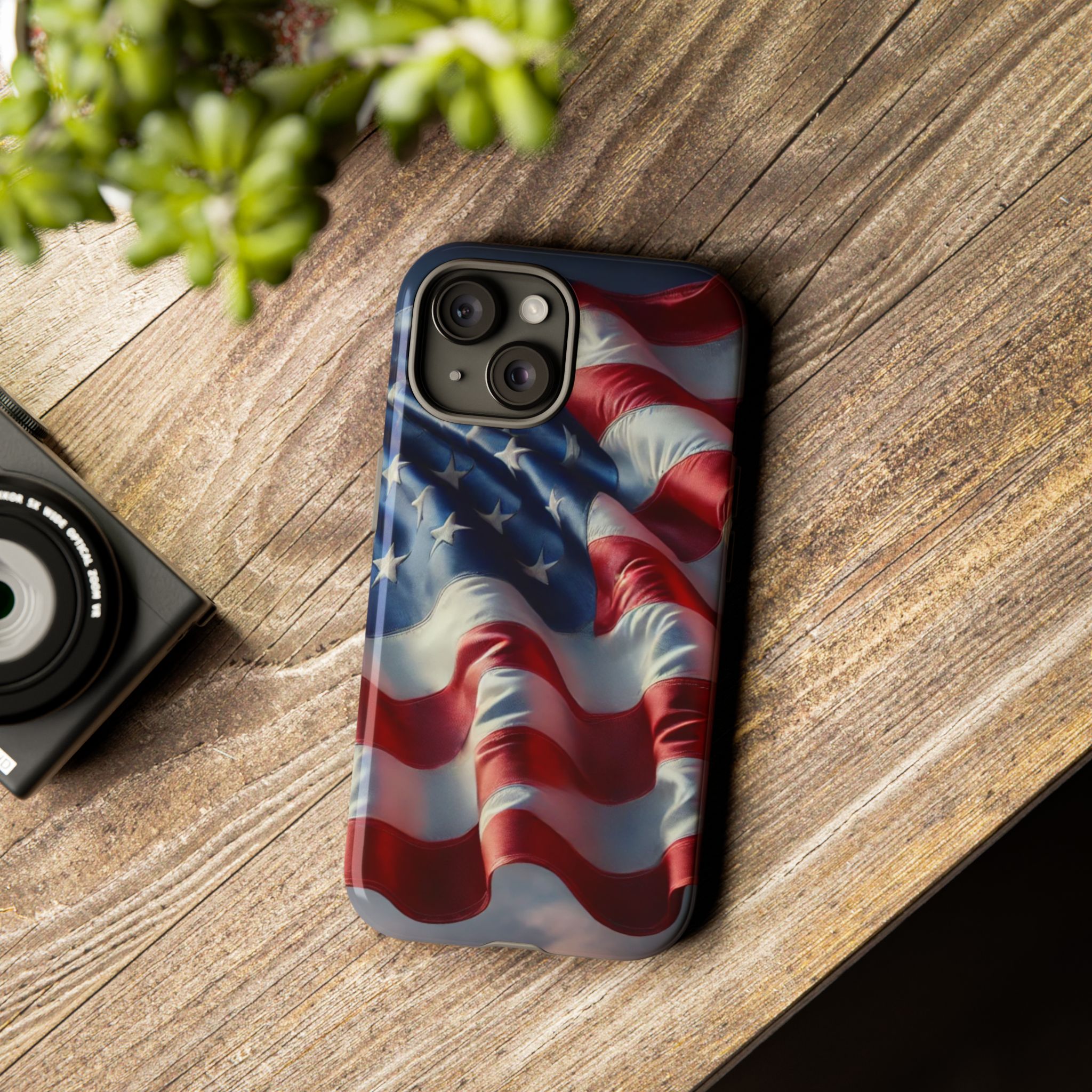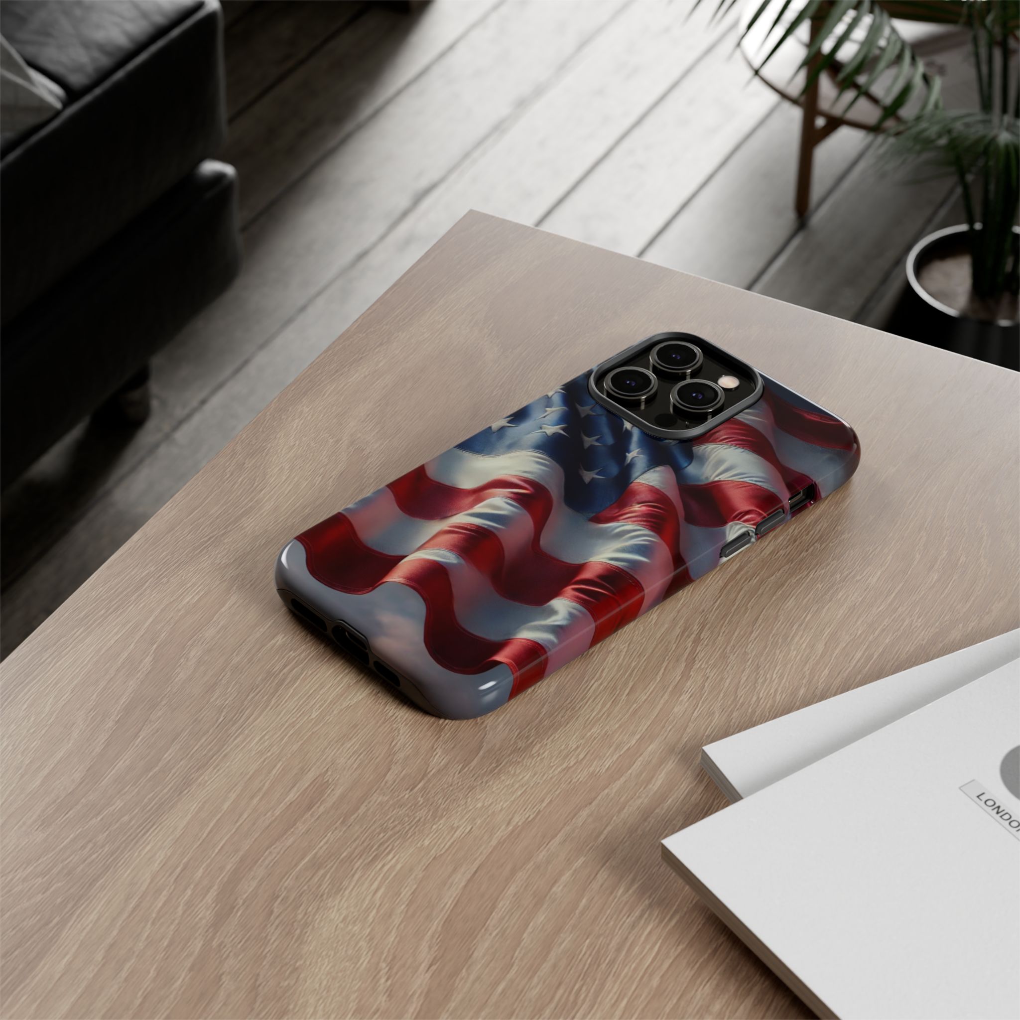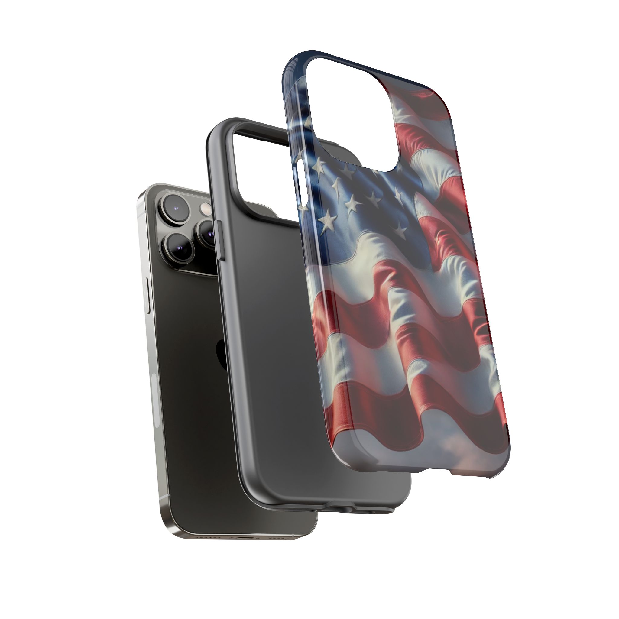 American Flag Phone Case with bold stars and stripes, tough dual-layer build, UV-protected finish, and wireless charging support. Durable pride meets everyday use.