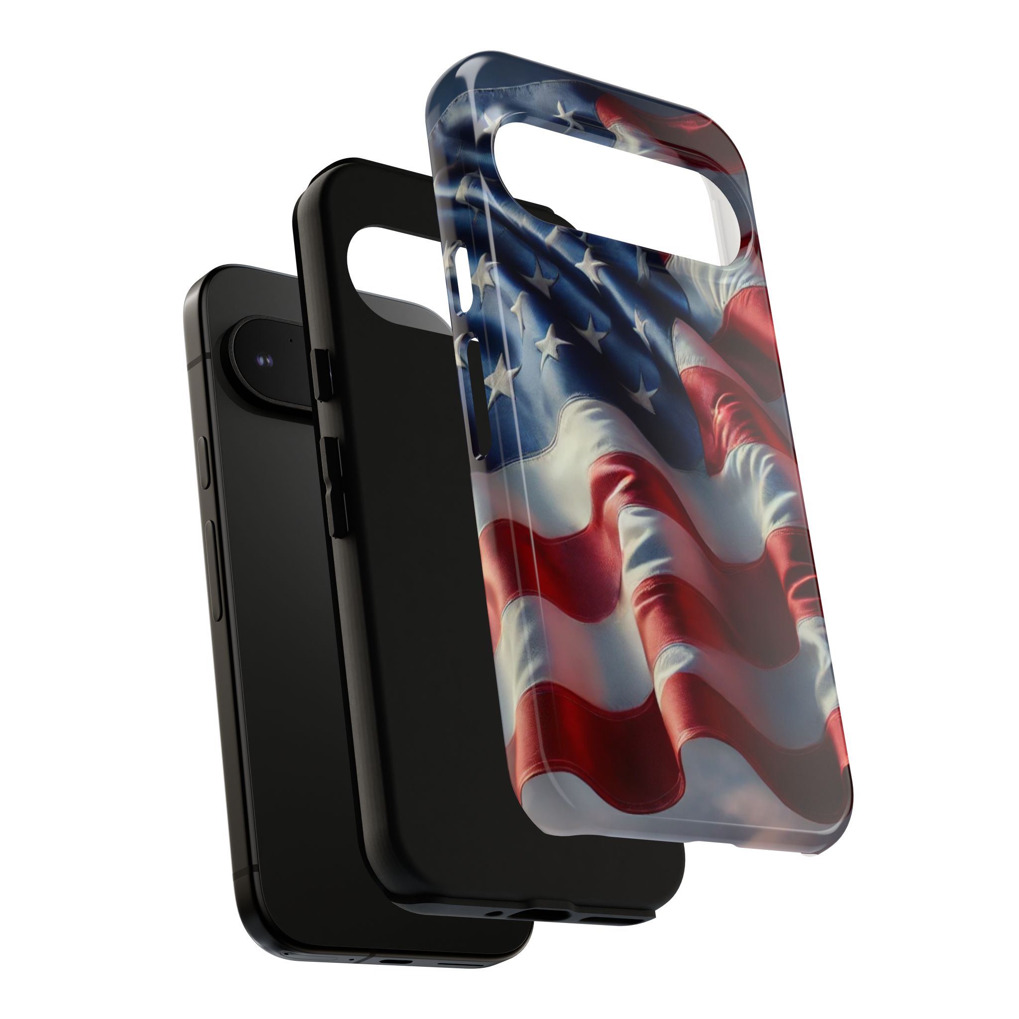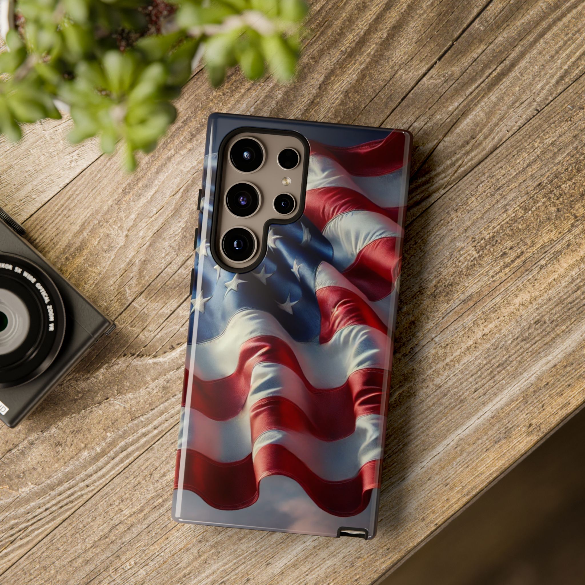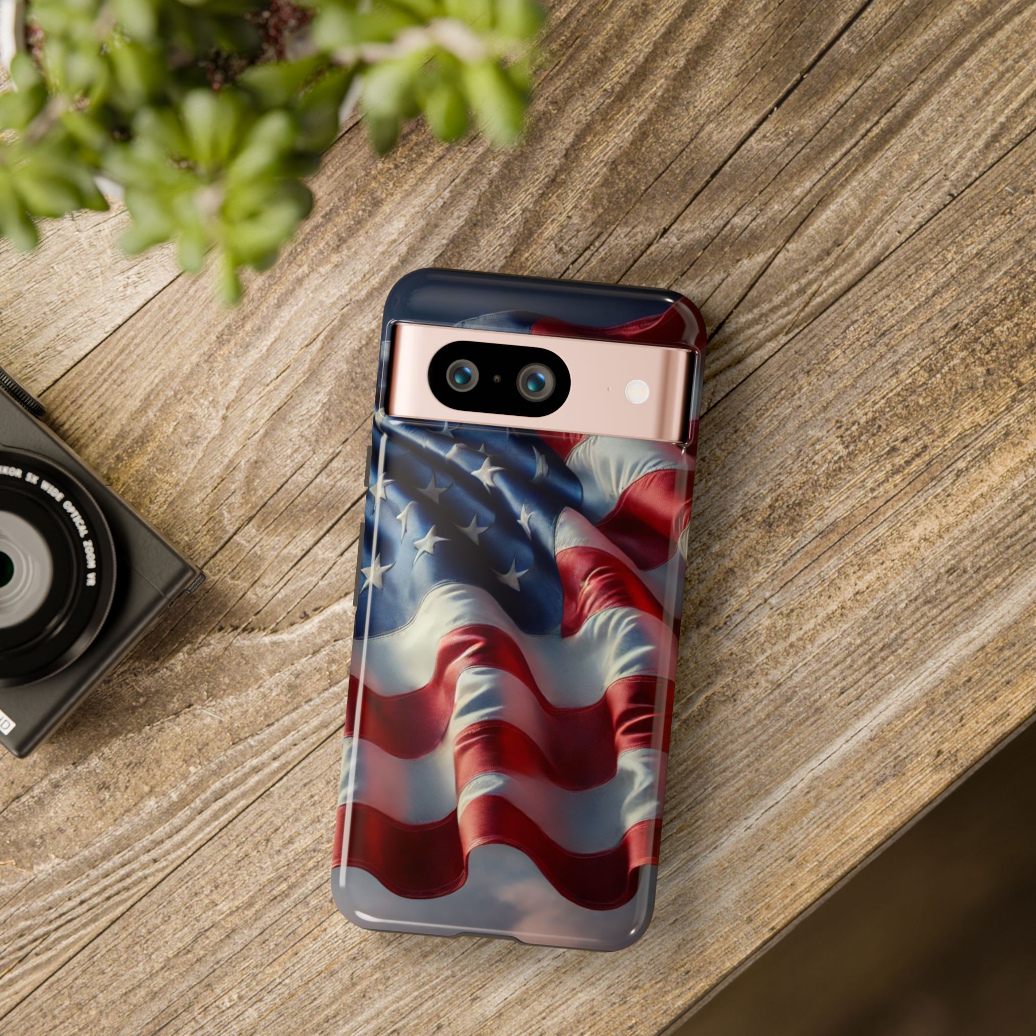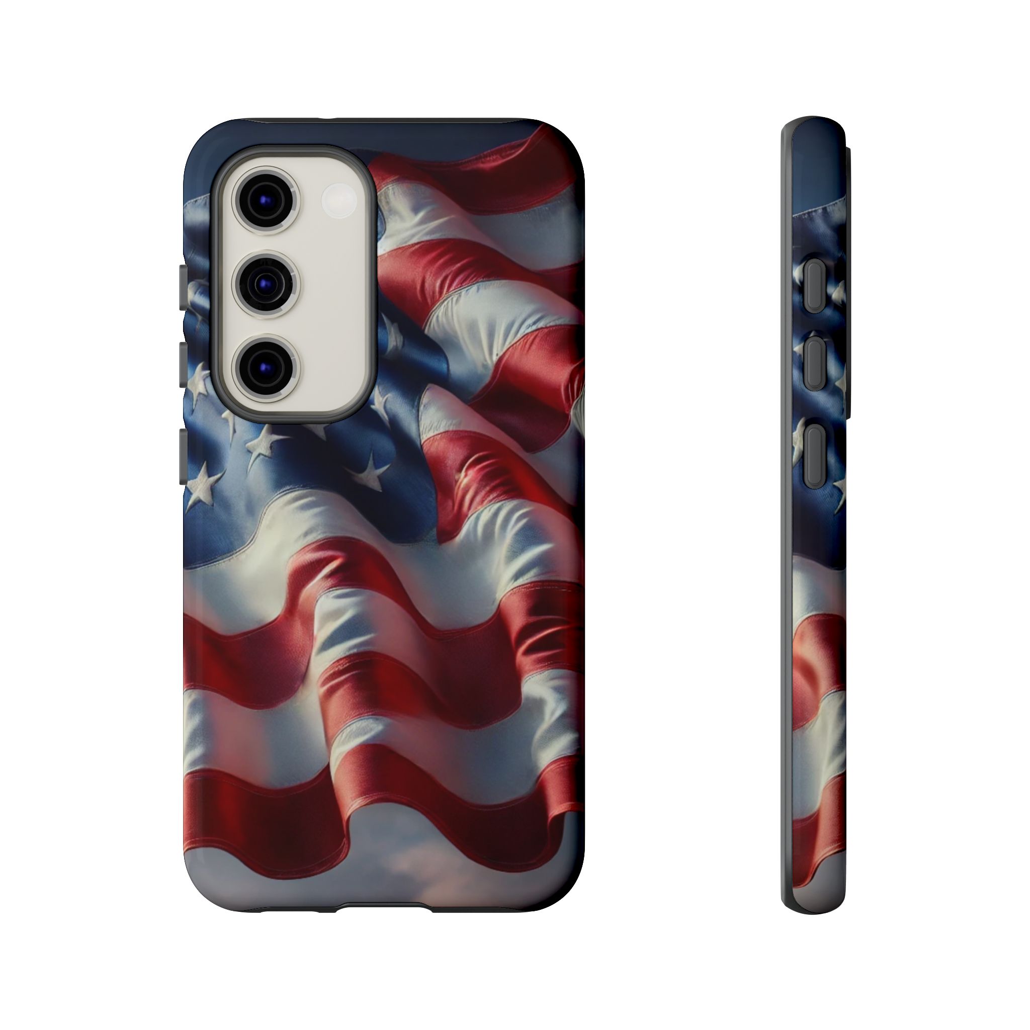American Flag Phone Case with bold stars and stripes, tough dual-layer build, UV-protected finish, and wireless charging support. Durable pride meets everyday use.