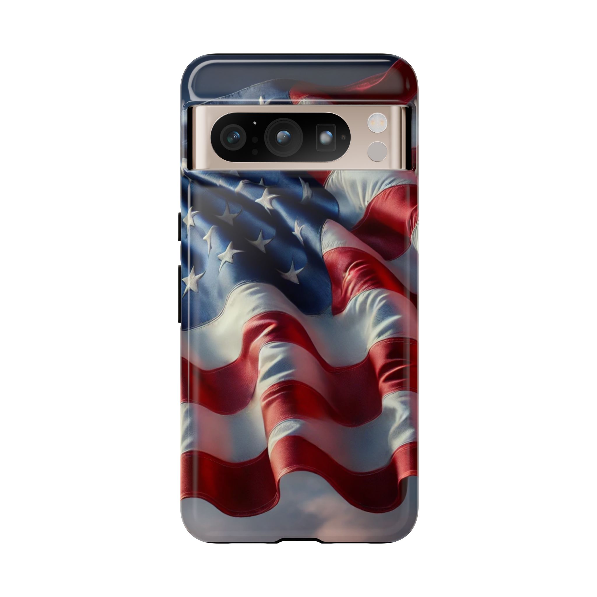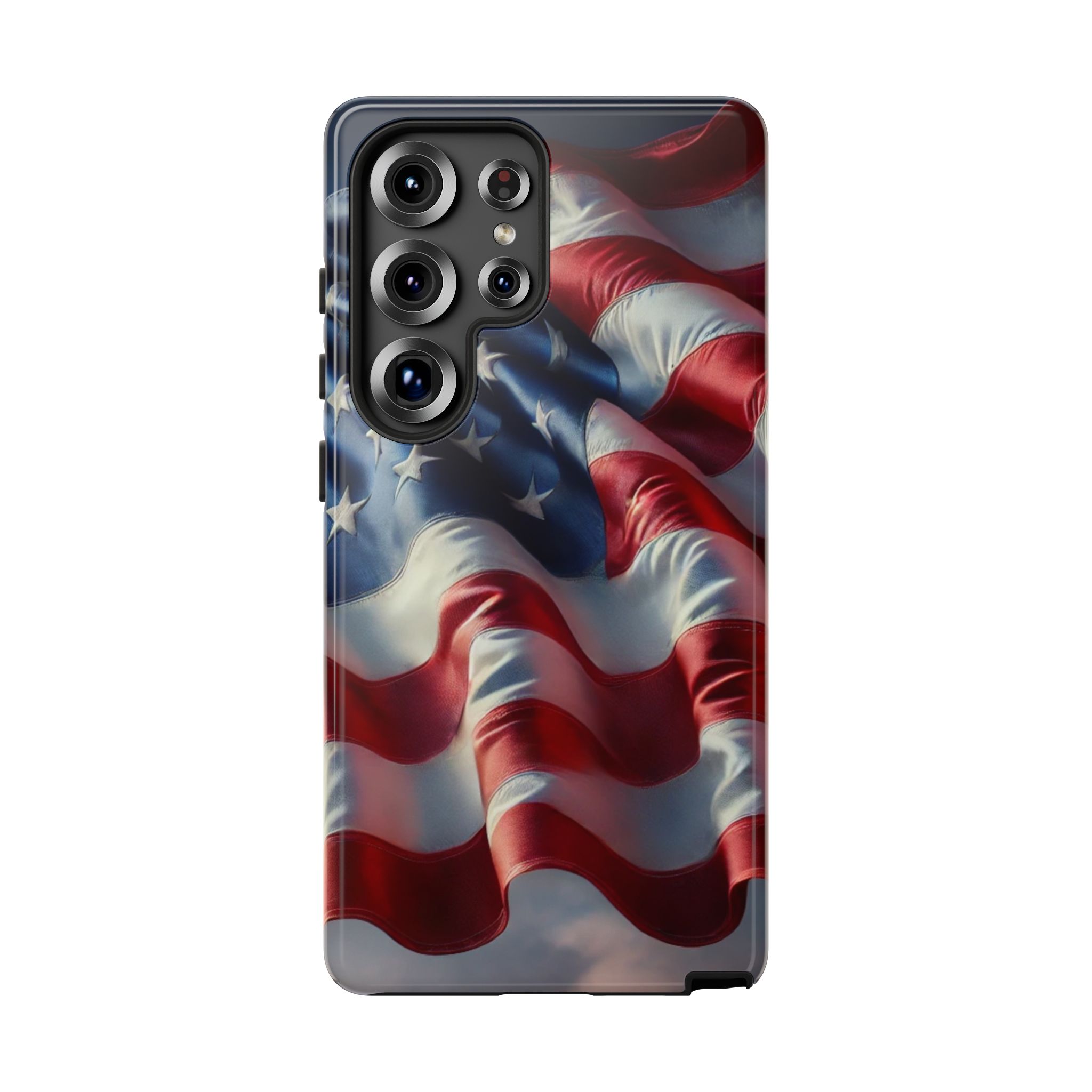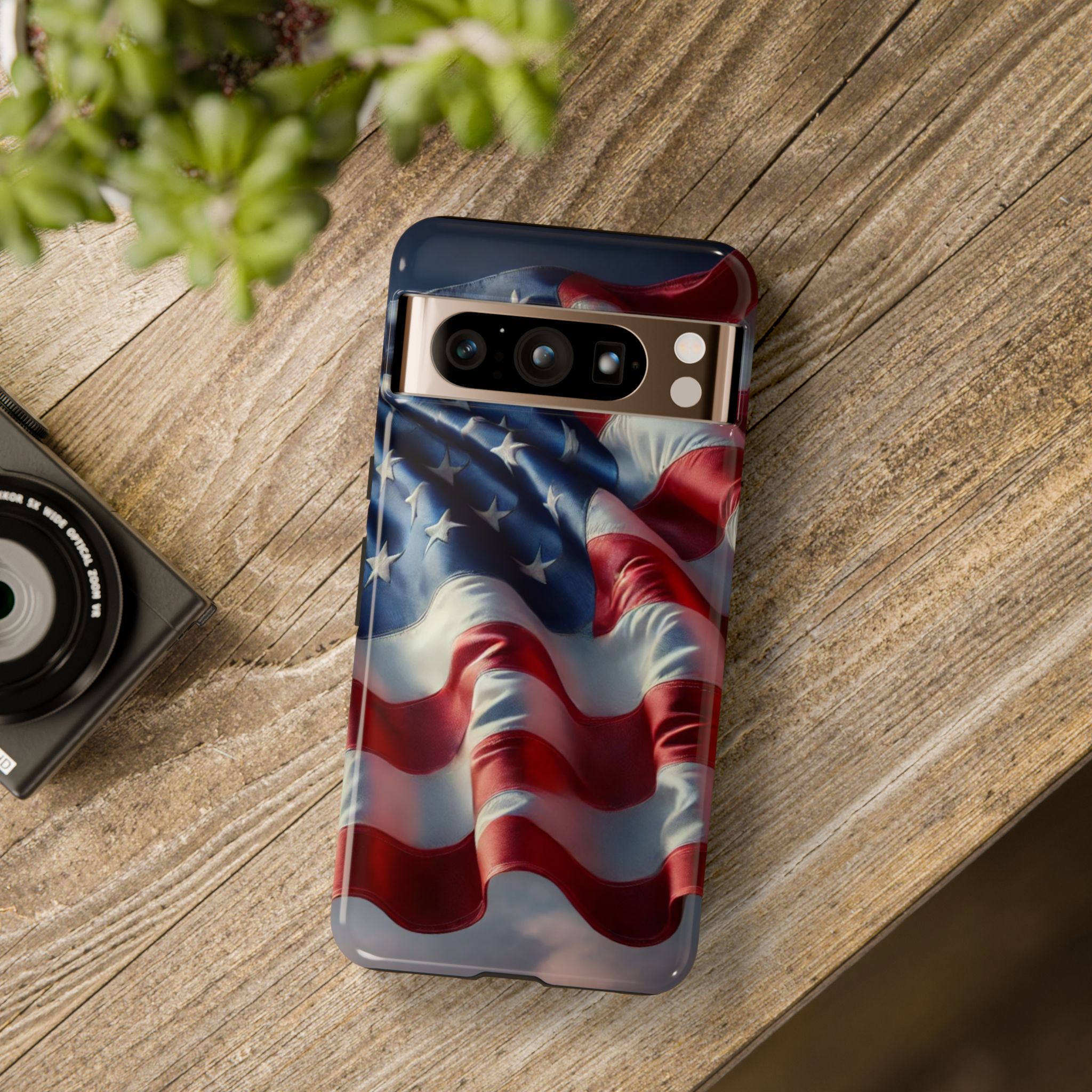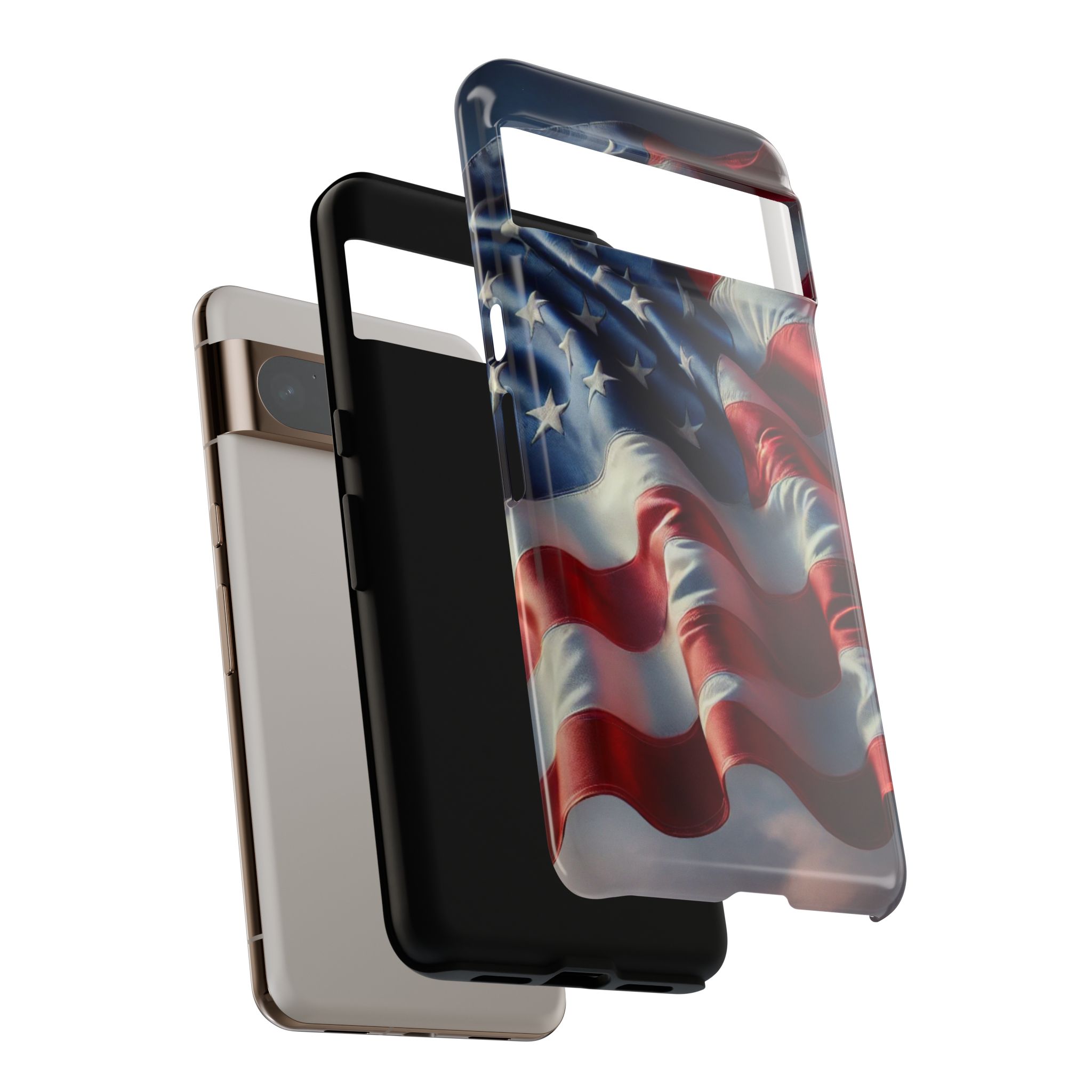 American Flag Phone Case with bold stars and stripes, tough dual-layer build, UV-protected finish, and wireless charging support. Durable pride meets everyday use.