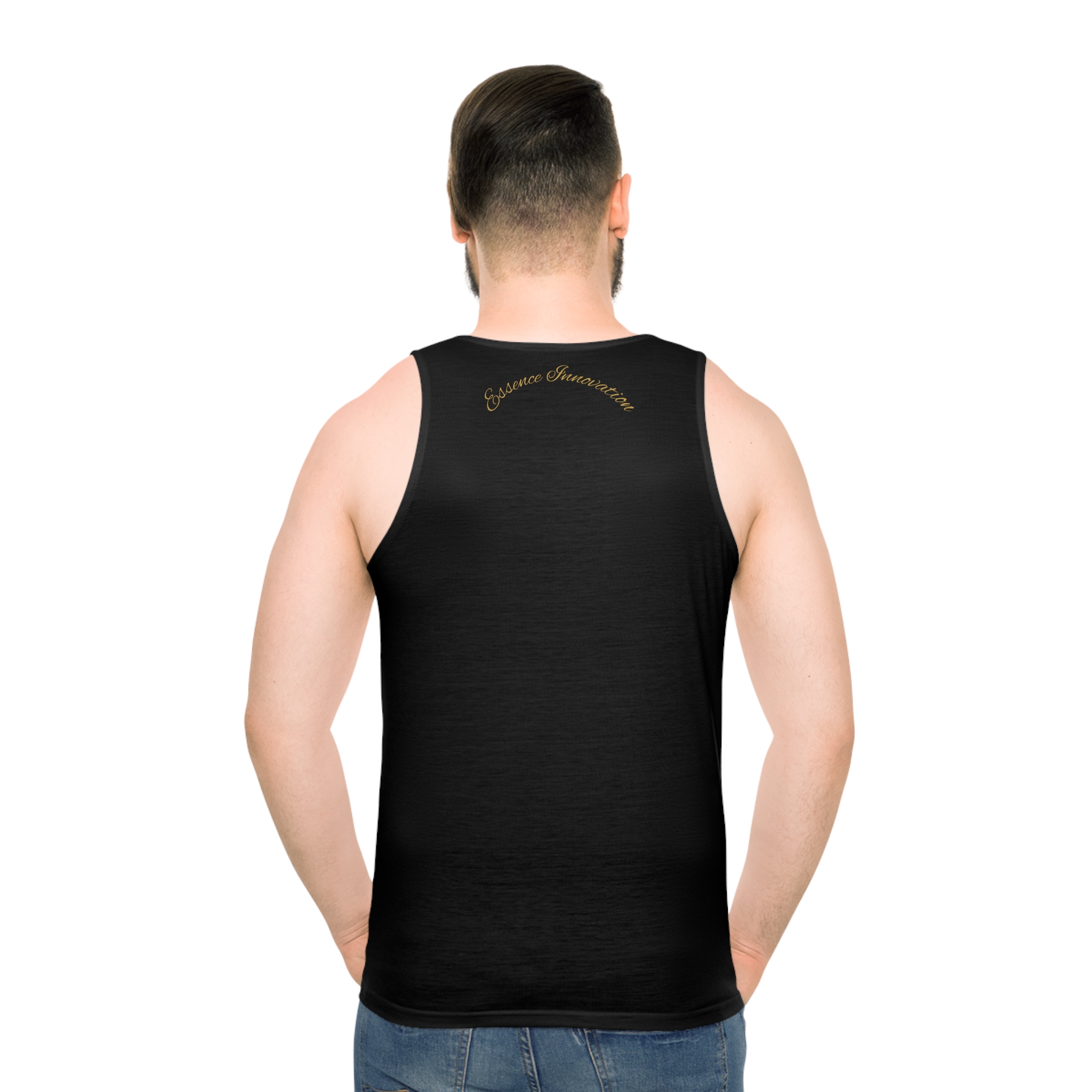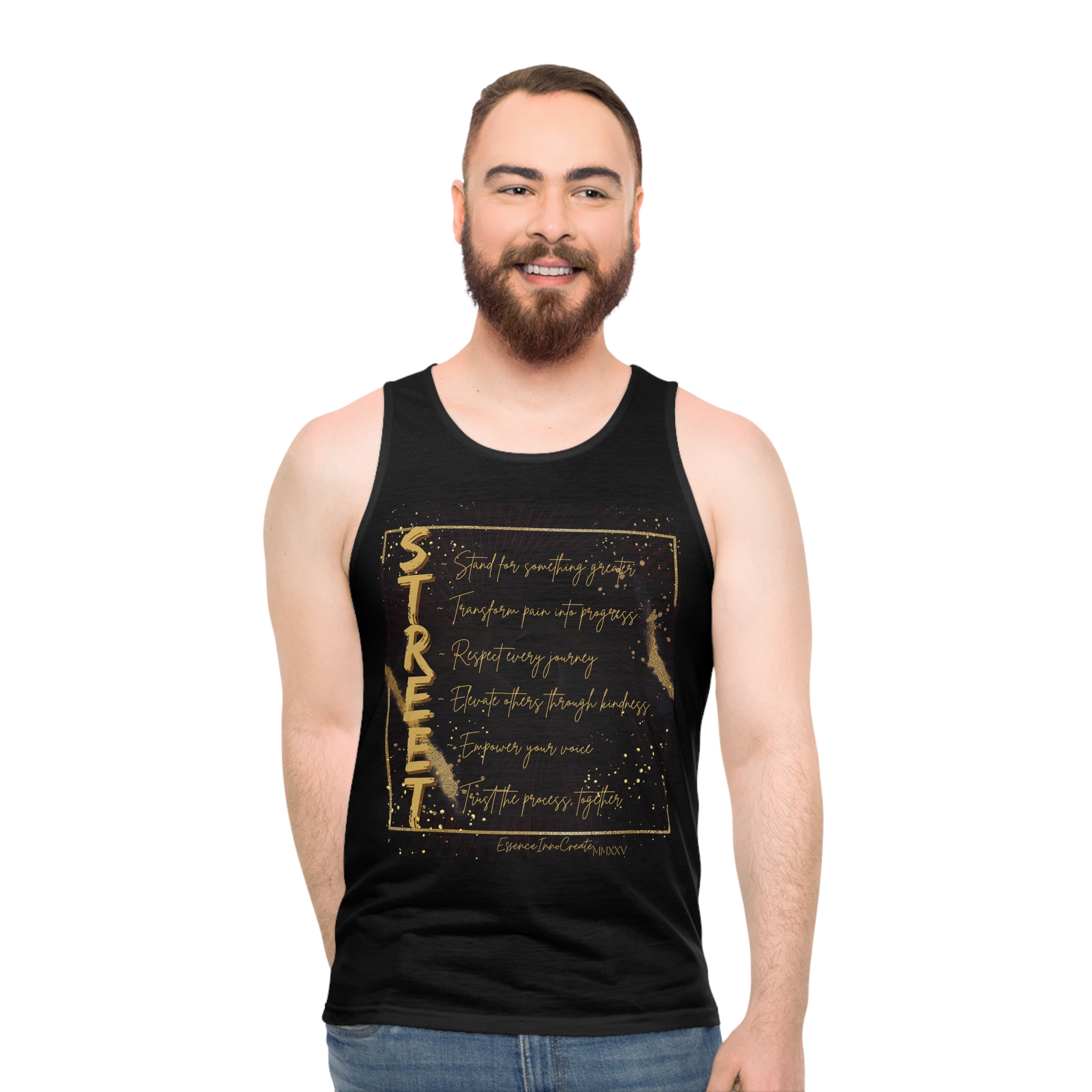 The Black STREET Signature Tank | EssenceInnoCreate | MMXXV is a direct statement piece. Unlike other editions in the Street Wear series, this design brings the six defining STREET values forward—literally. Printed boldly across the chest in distressed gold, the message is unmissable: