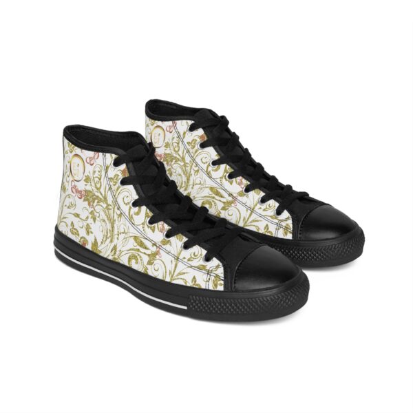 Bohemian Butterfly Hightops VI feature white canvas, black sole and tongue, and golden Butterfly Heart detailing—symbolic high-tops for bold, grounded feminine expression.