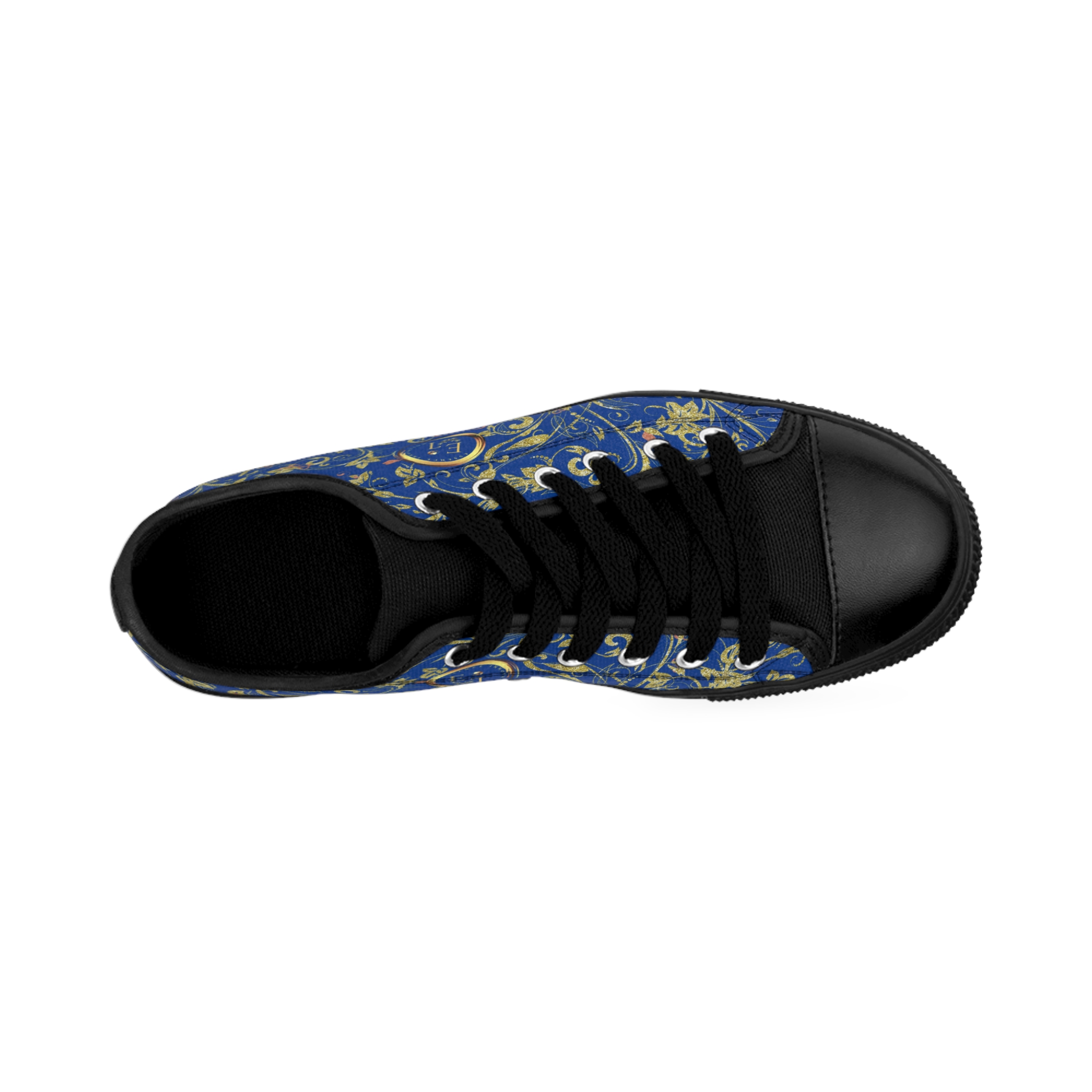 The Bohemian Butterfly Lowtops XIII | Black Sole | Dark Blue reflect quiet depth and elevated design. Wrapped in a rich navy-blue canvas, this low-top silhouette features a deep black sole and black tongue, framing the elegant Butterfly Heart motif in glowing gold and soft green.