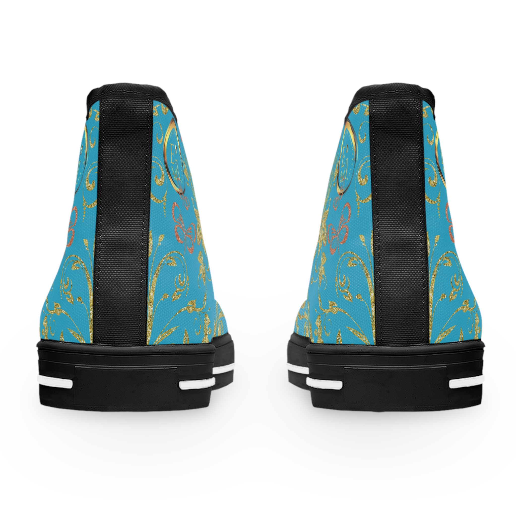 The Boho Hightop Sneakers XV | Butterfly Heart | Turquoise are made for the woman who brings light, color, and creativity to everything she does. Cloaked in vibrant turquoise canvas, these sneakers are an instant statement—offering the perfect balance of energy and elegance. The Butterfly Heart print winds its way across the shoe in soft gold and green, adding a layer of nature-inspired beauty to this bold colorway.