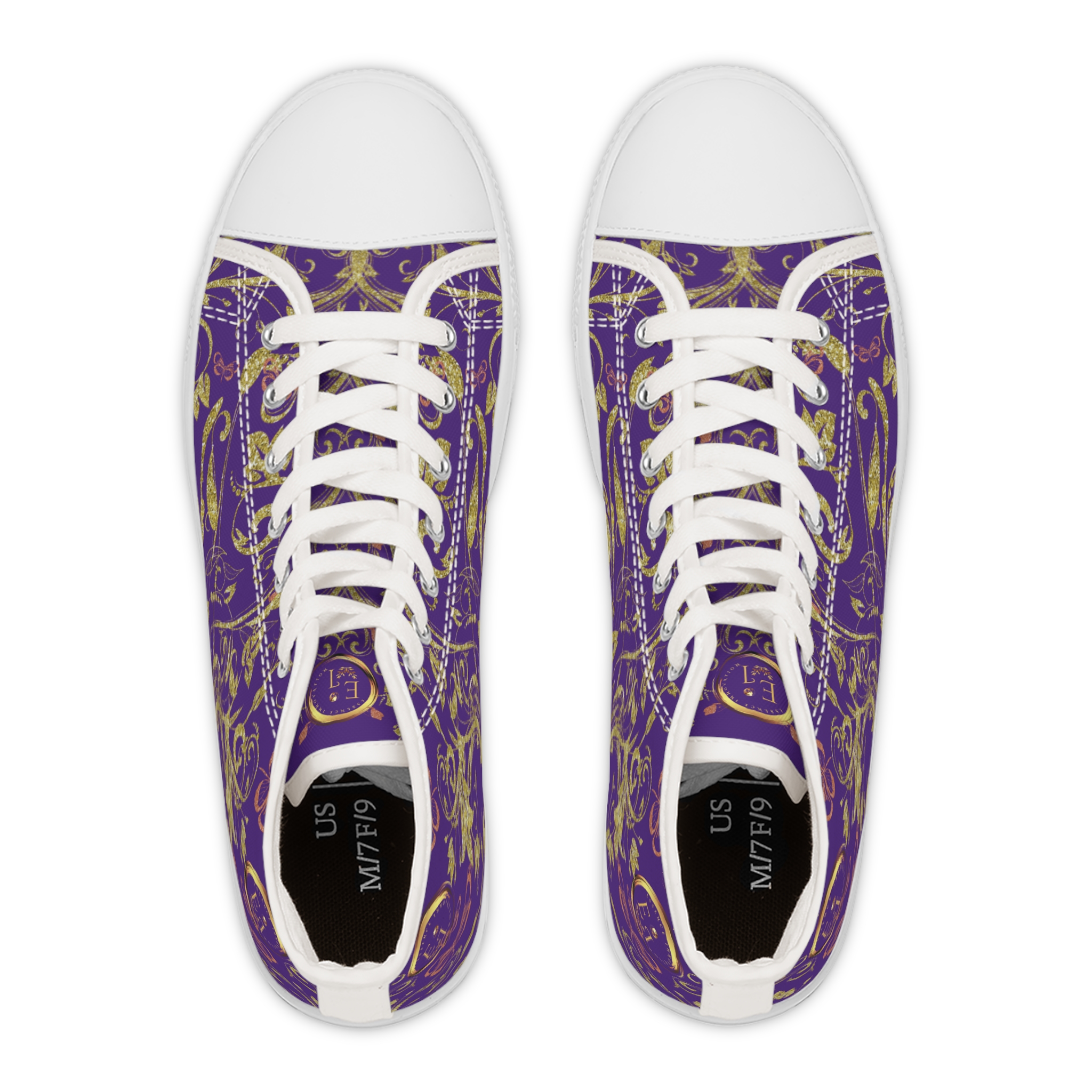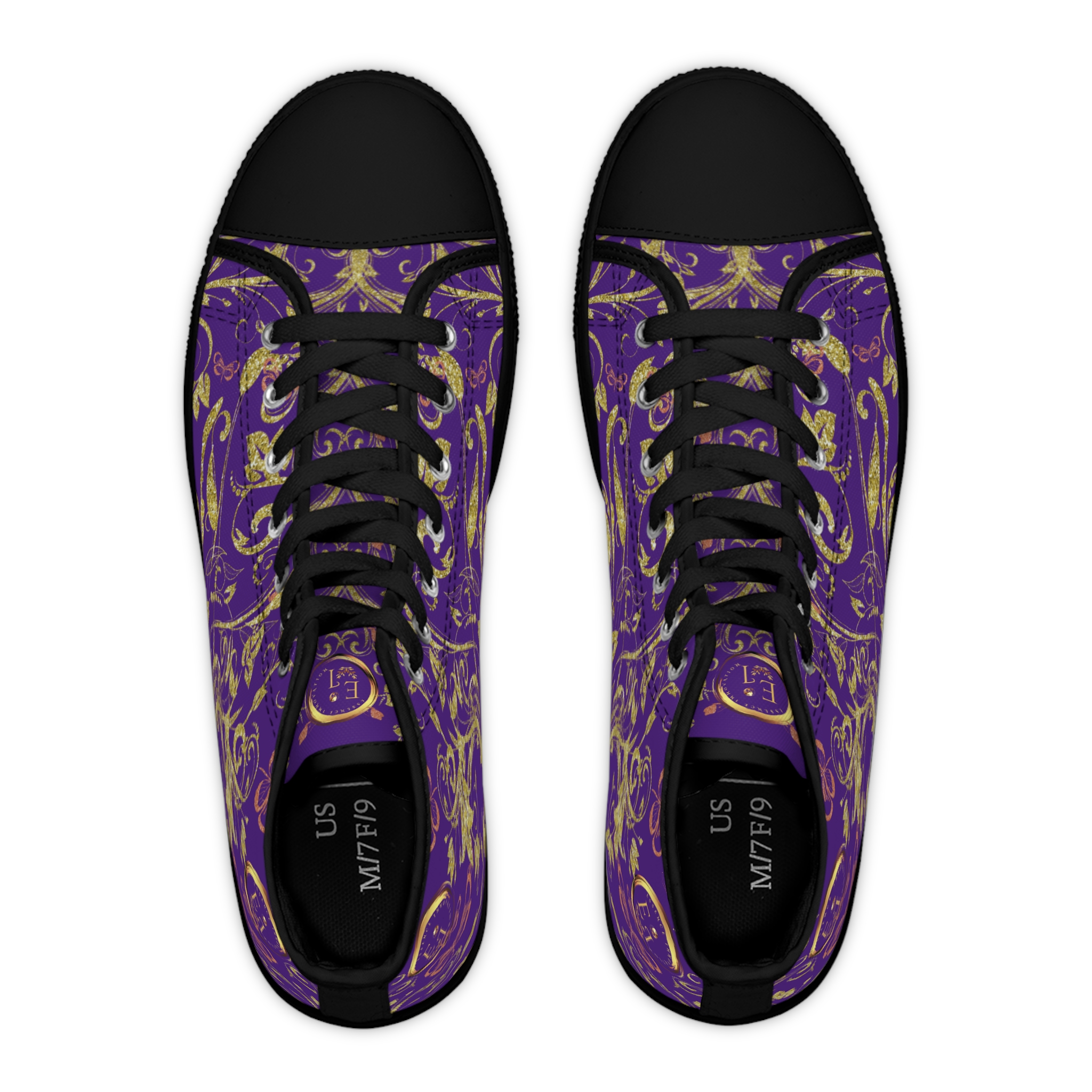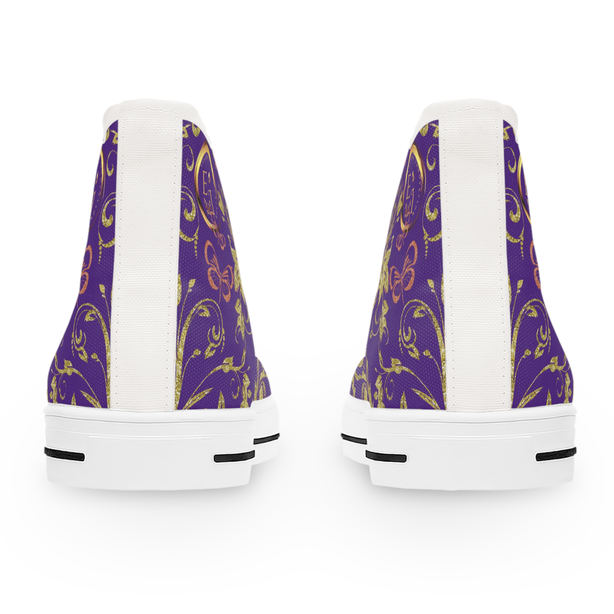 Silver eyelets complement the purple canvas with a cool-toned shine, giving the sneaker a polished yet creative edge. The high-top silhouette adds subtle height and ankle support while enhancing the elegant flow of the butterfly and vine detailing. These boho hightop sneakers are made to move through days filled with color, curiosity, and confidence.