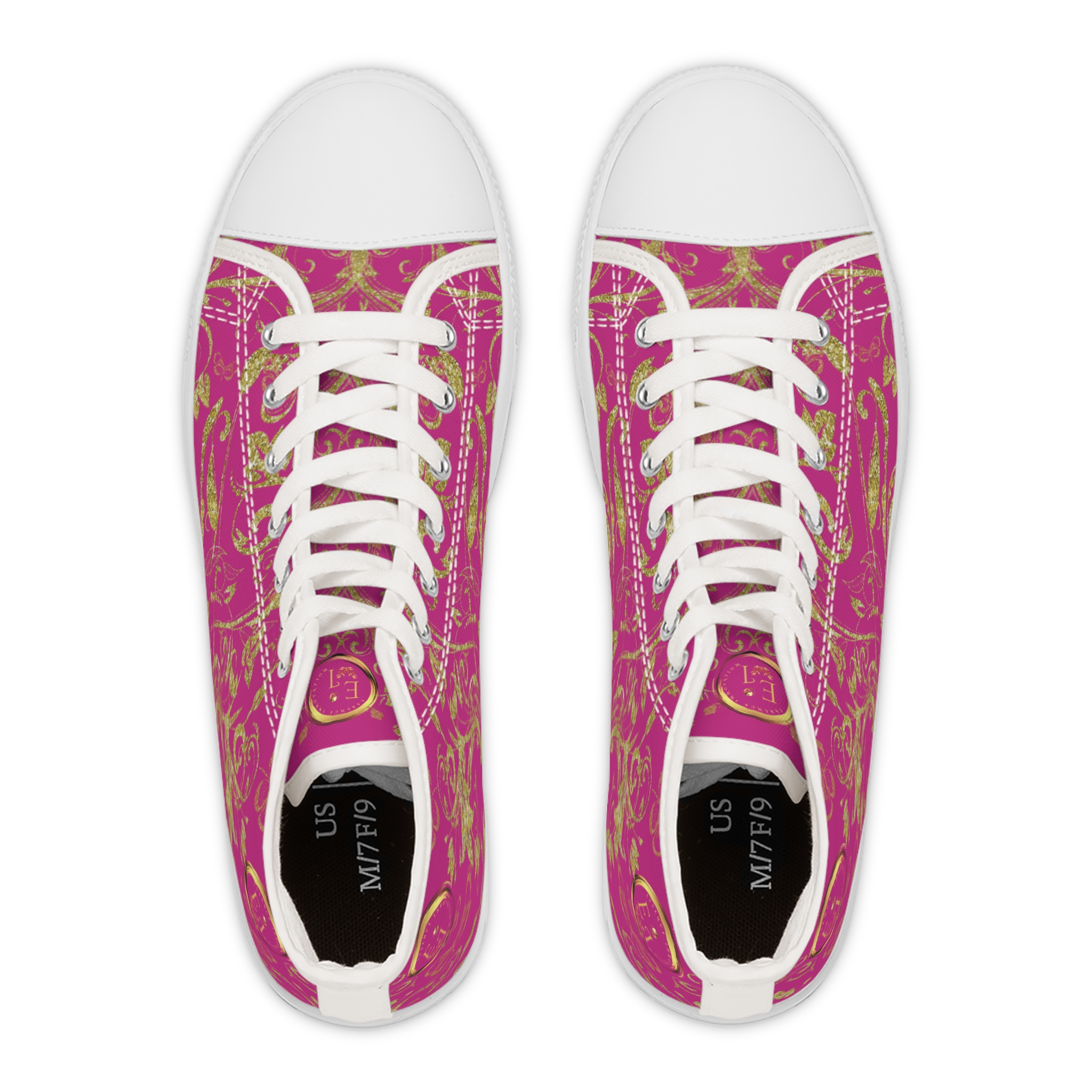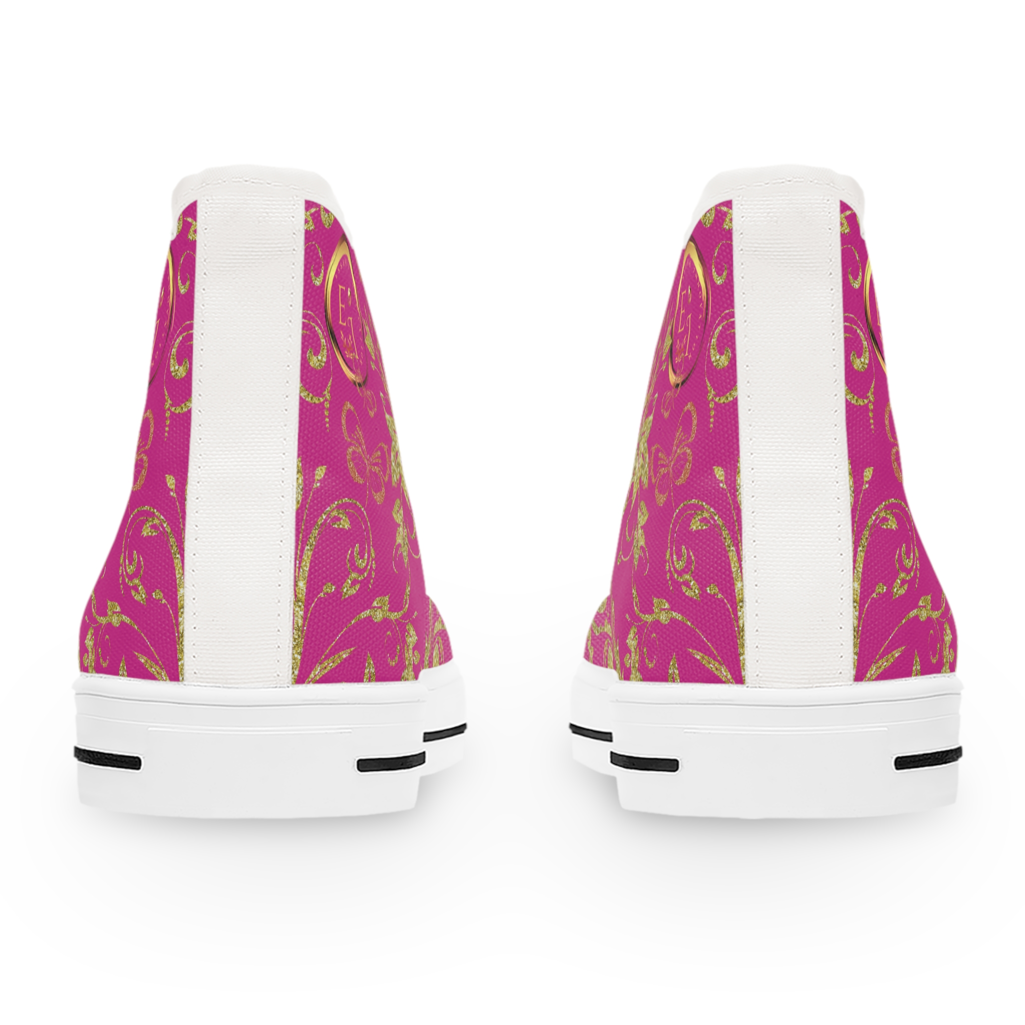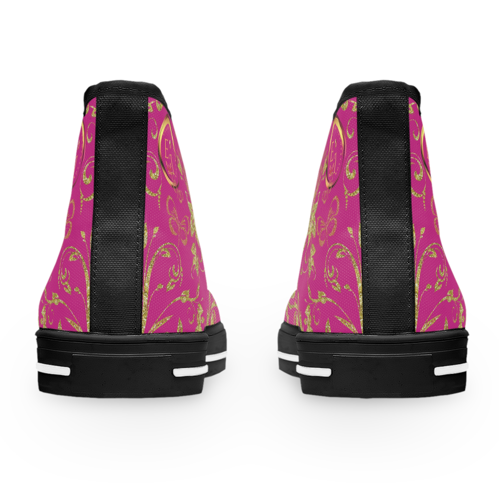 The Boho Hightop Sneakers XVIII | Butterfly Heart | Pink embody feminine energy with gentle confidence. Crafted in a soft blush pink canvas, these high-top sneakers celebrate elegance, beauty, and transformation through the delicate gold and green Butterfly Heart print. They reflect the kind of strength that moves with grace, empowering women who express themselves through color, care, and creativity.