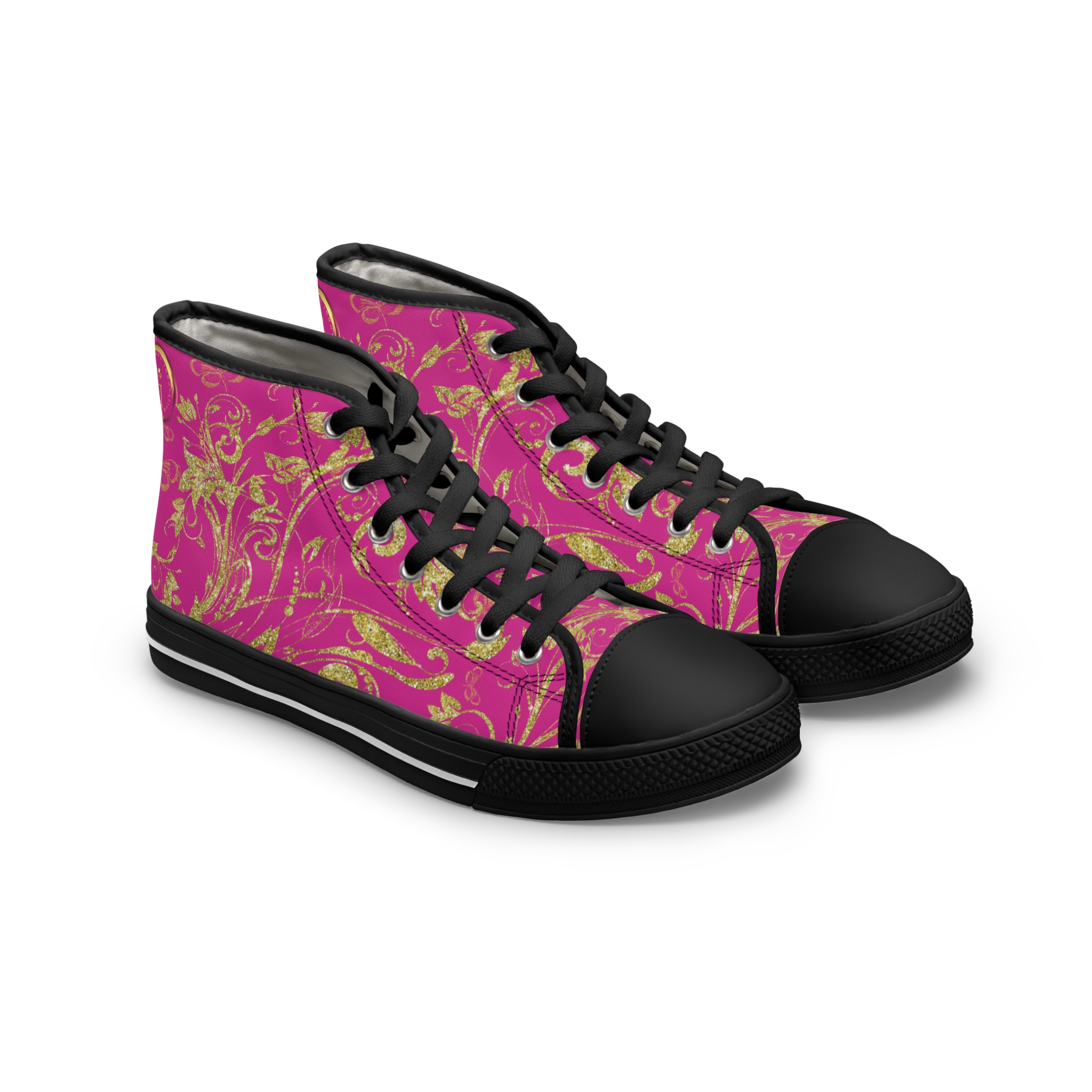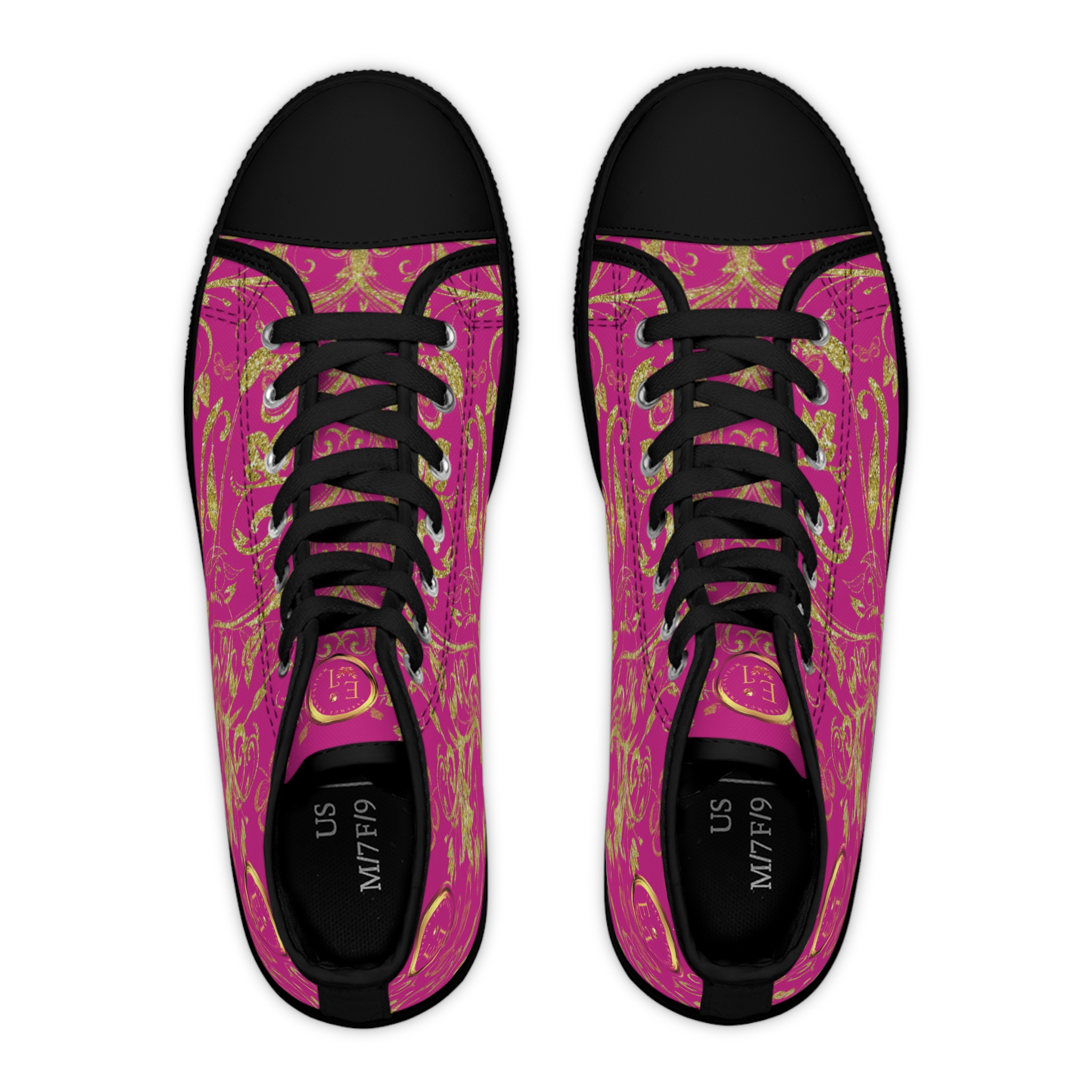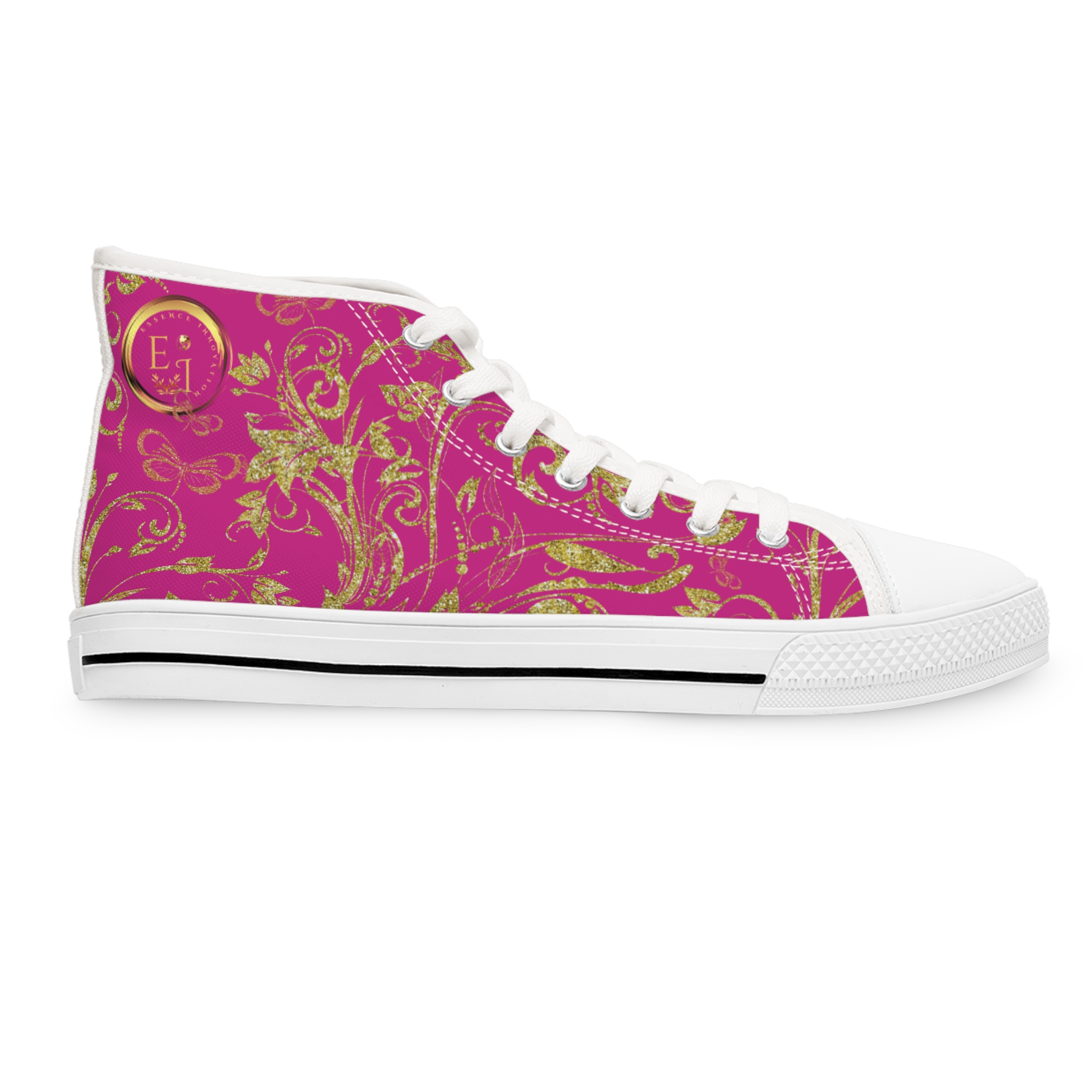 The Boho Hightop Sneakers XVIII | Butterfly Heart | Pink embody feminine energy with gentle confidence. Crafted in a soft blush pink canvas, these high-top sneakers celebrate elegance, beauty, and transformation through the delicate gold and green Butterfly Heart print. They reflect the kind of strength that moves with grace, empowering women who express themselves through color, care, and creativity.
