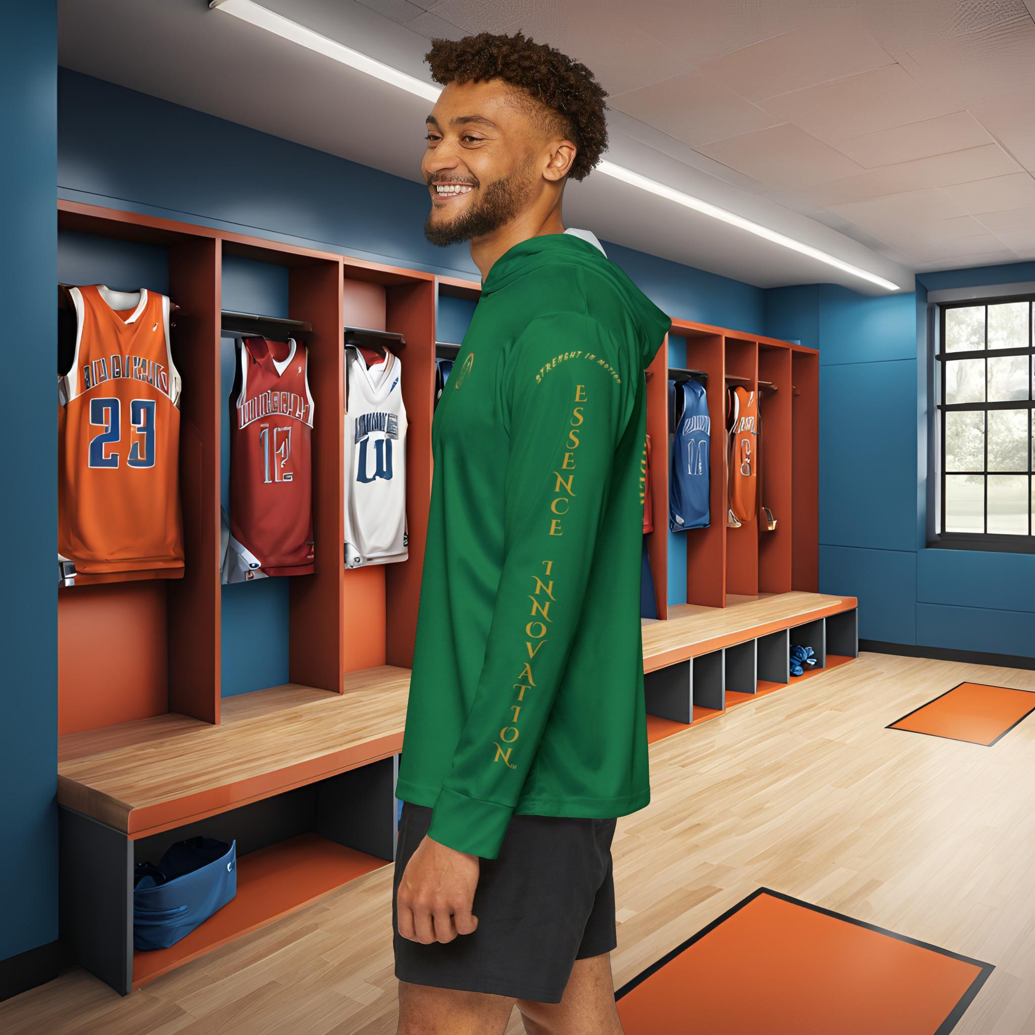 Essence Momentum XII in dark green delivers UPF 50+ sun protection, breathable fit, and versatile style. A Roman Numeral hoodie symbolizing growth, resilience, and balanced strength.