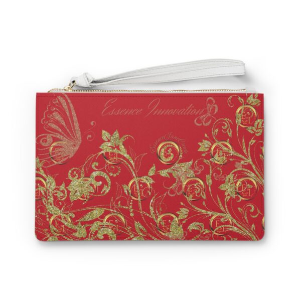 The Floral Clutch Bag X radiates strength, warmth, and artistic charm. Its bold red base provides a striking backdrop for golden-green floral accents, creating a look that feels confident and timeless. Enhanced with the Essence Innovation Boho emblem, this clutch celebrates individuality and the freedom of expressive style.