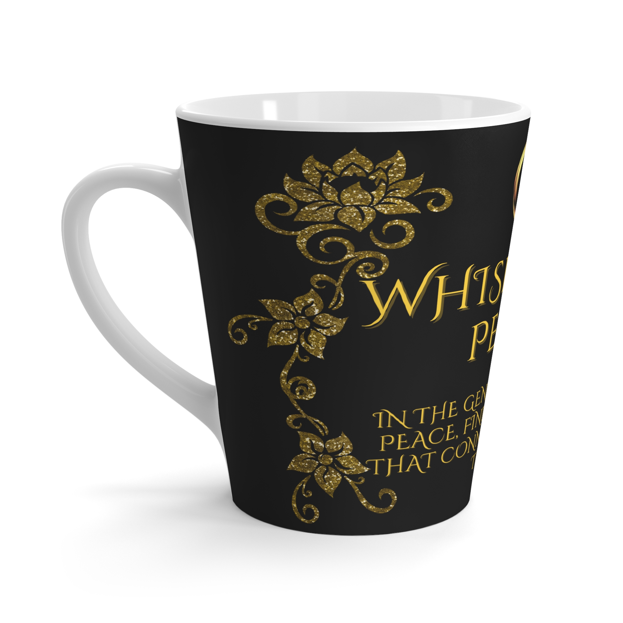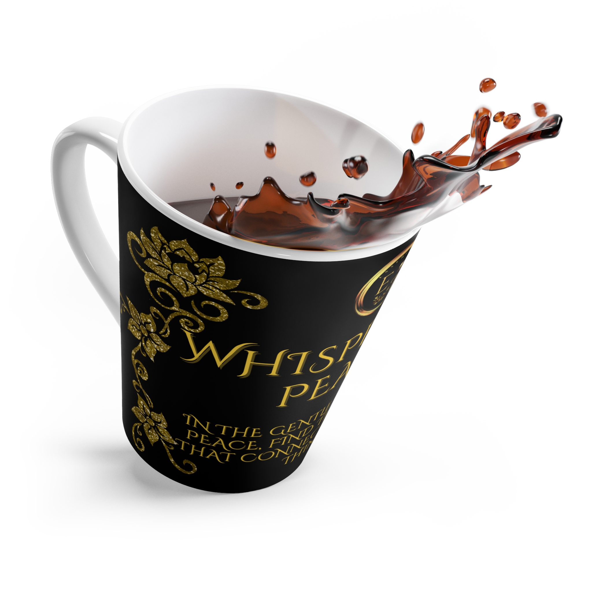 The Her Whispers Peace Black luxury ceramic mug offers 12oz of bold elegance with golden floral accents, crafted for strength and serenity.