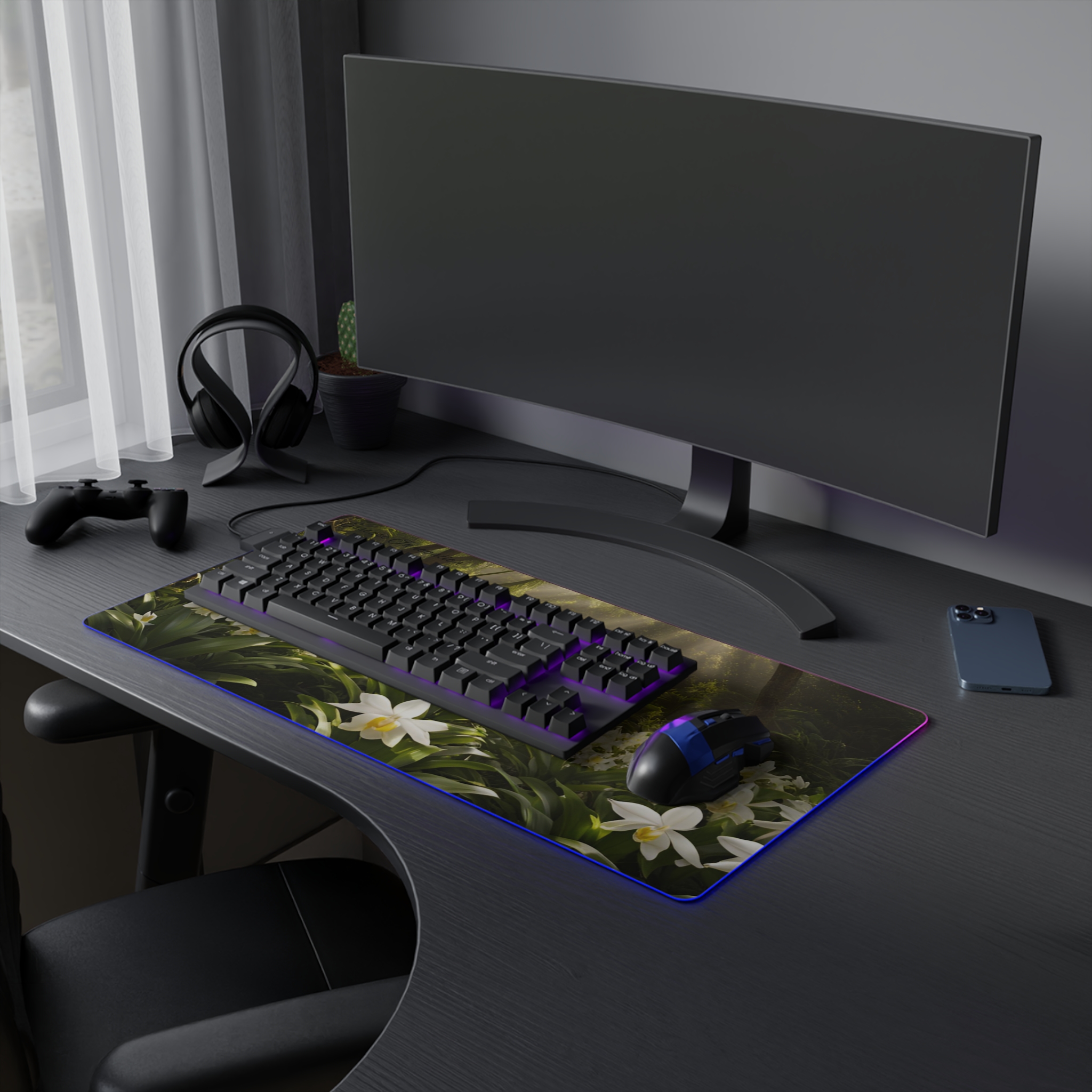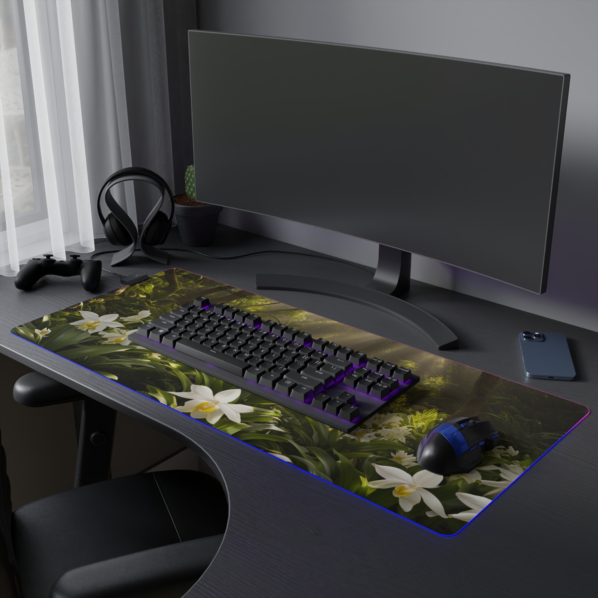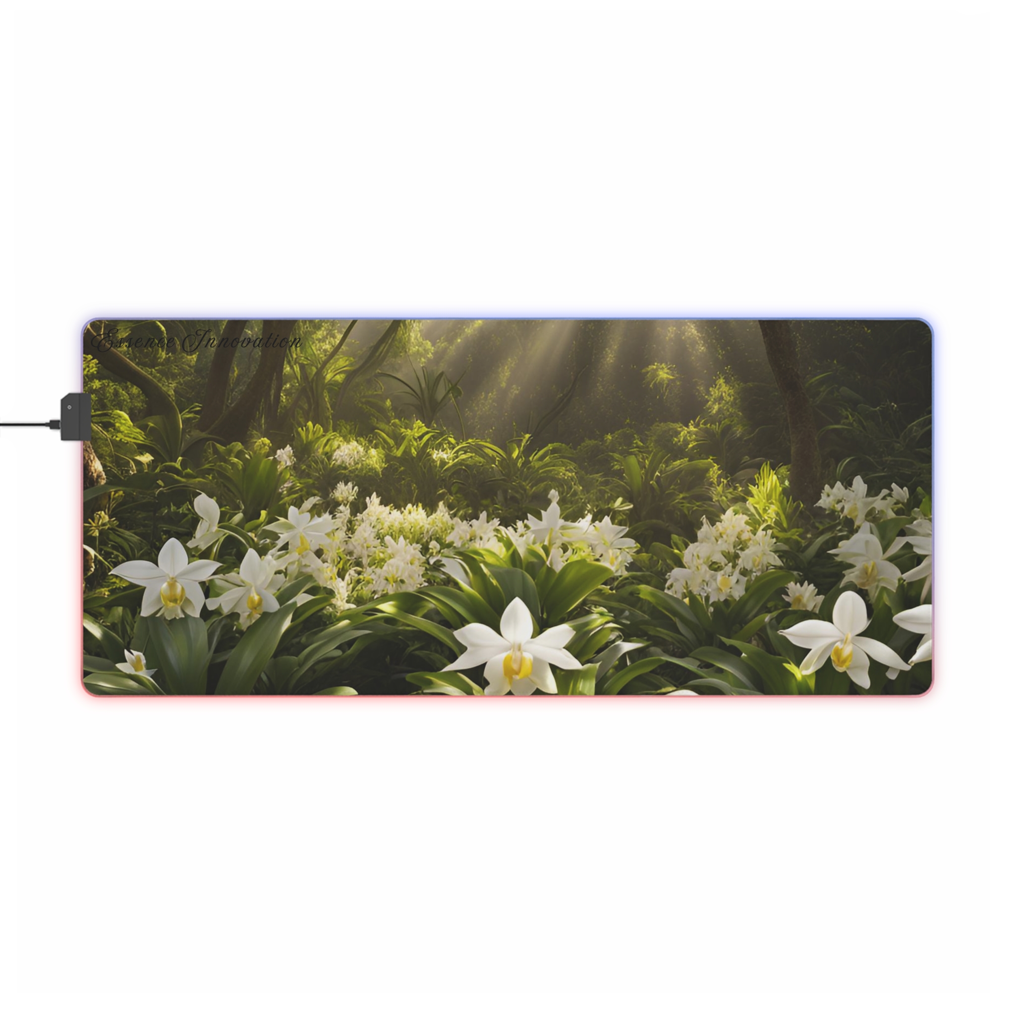 The Orchid Grove LED gaming mouse pad features elegant orchid artwork, RGB edge lighting, non-slip base, and smooth surface in 4 sizes.