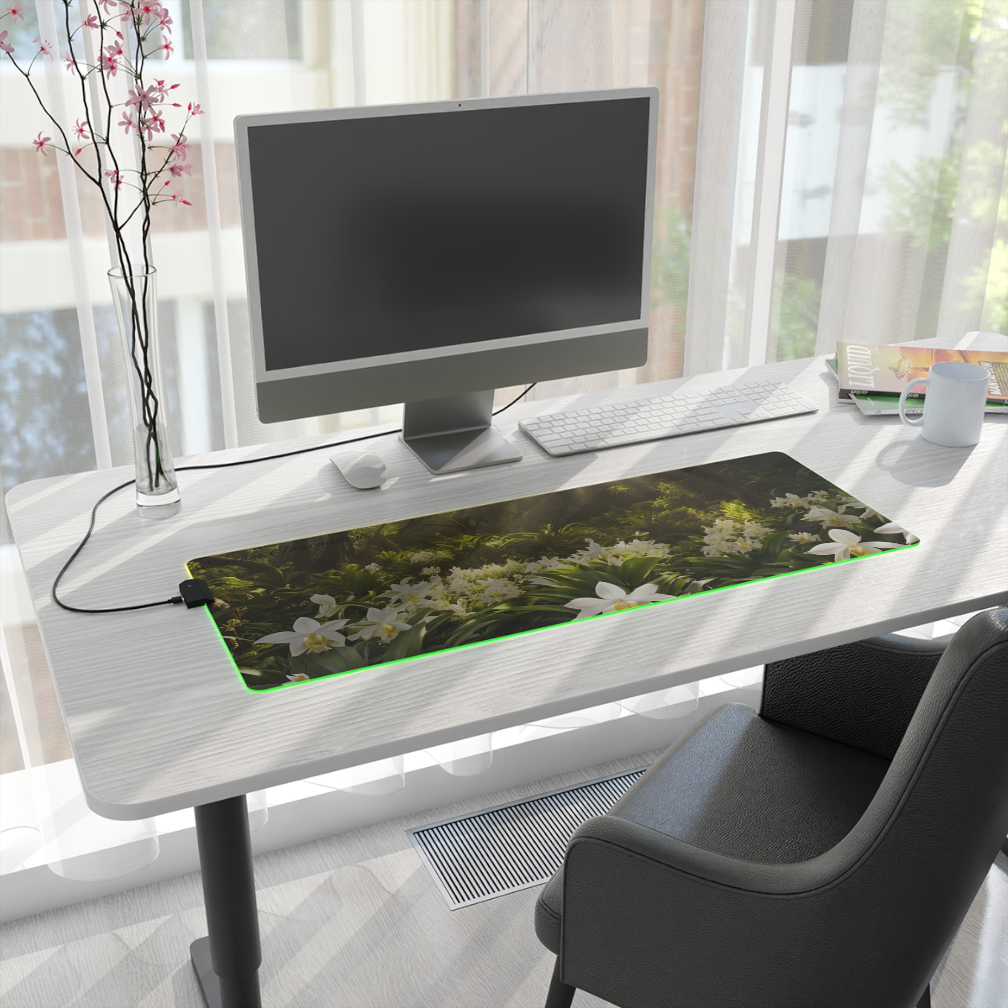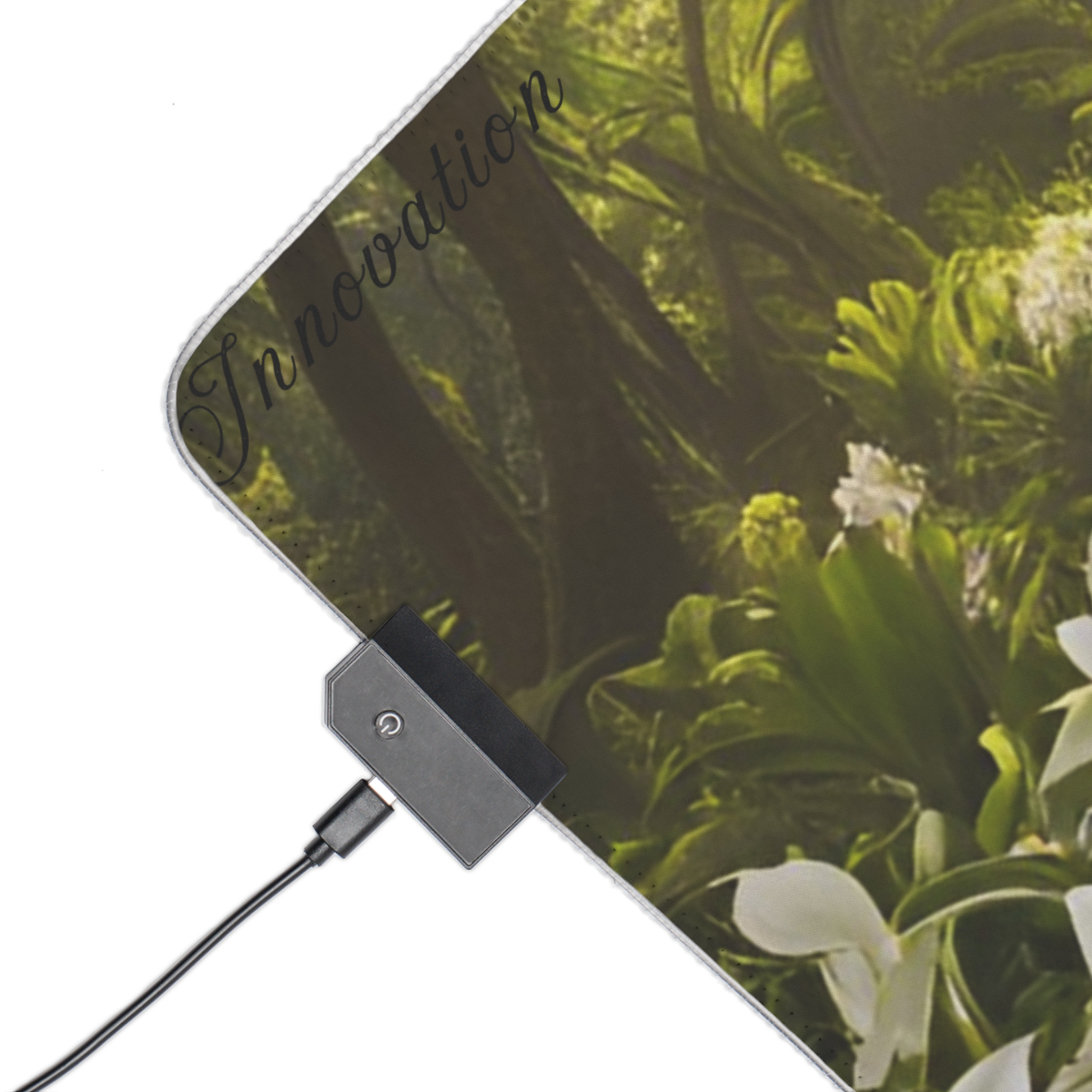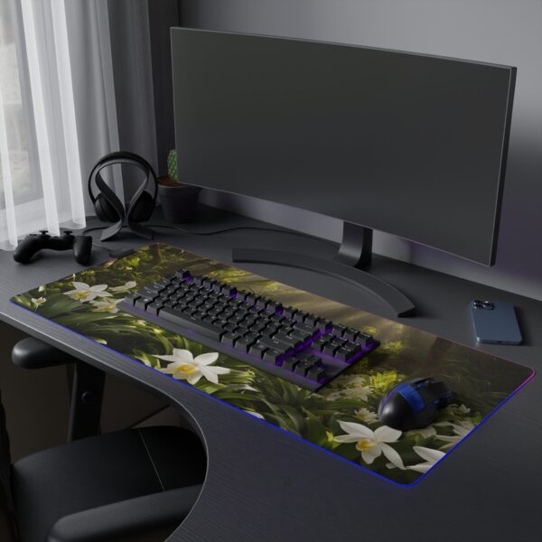 The Orchid Grove LED gaming mouse pad features elegant orchid artwork, RGB edge lighting, non-slip base, and smooth surface in 4 sizes.