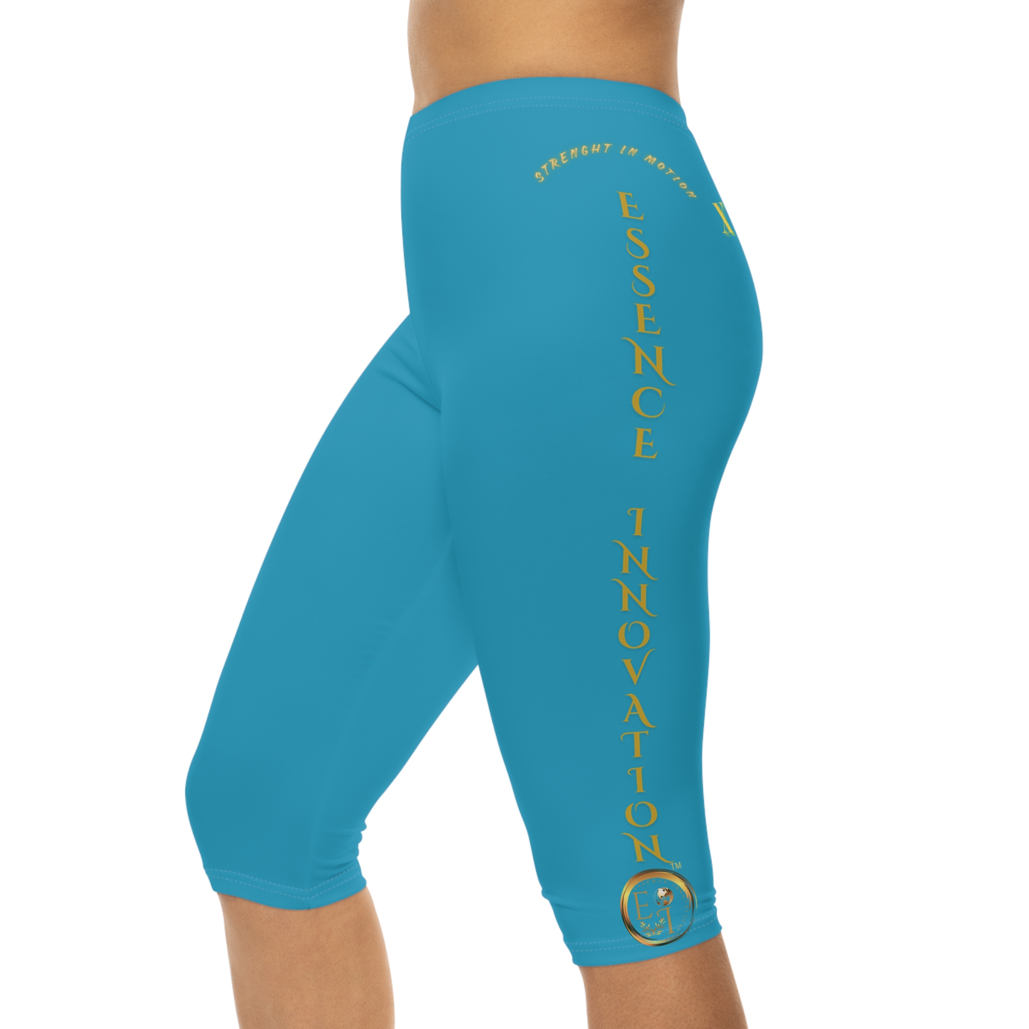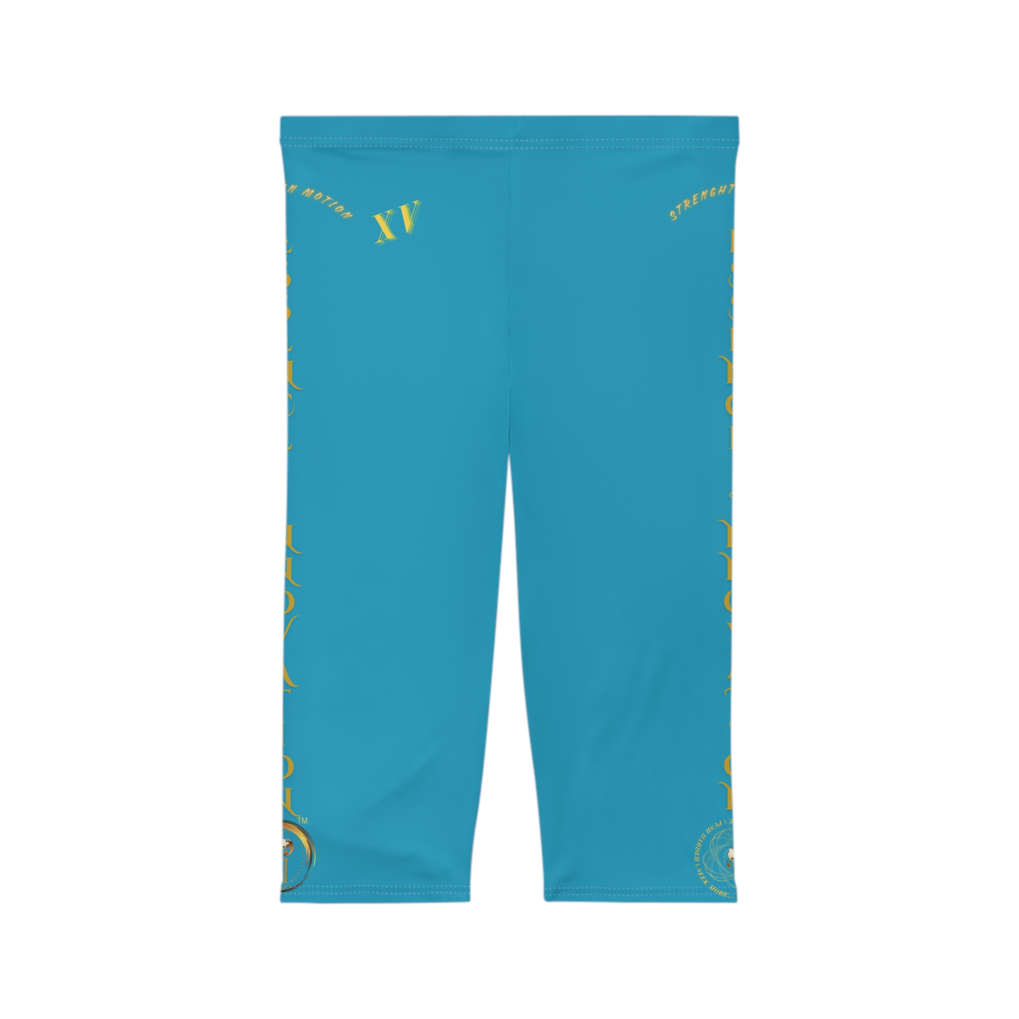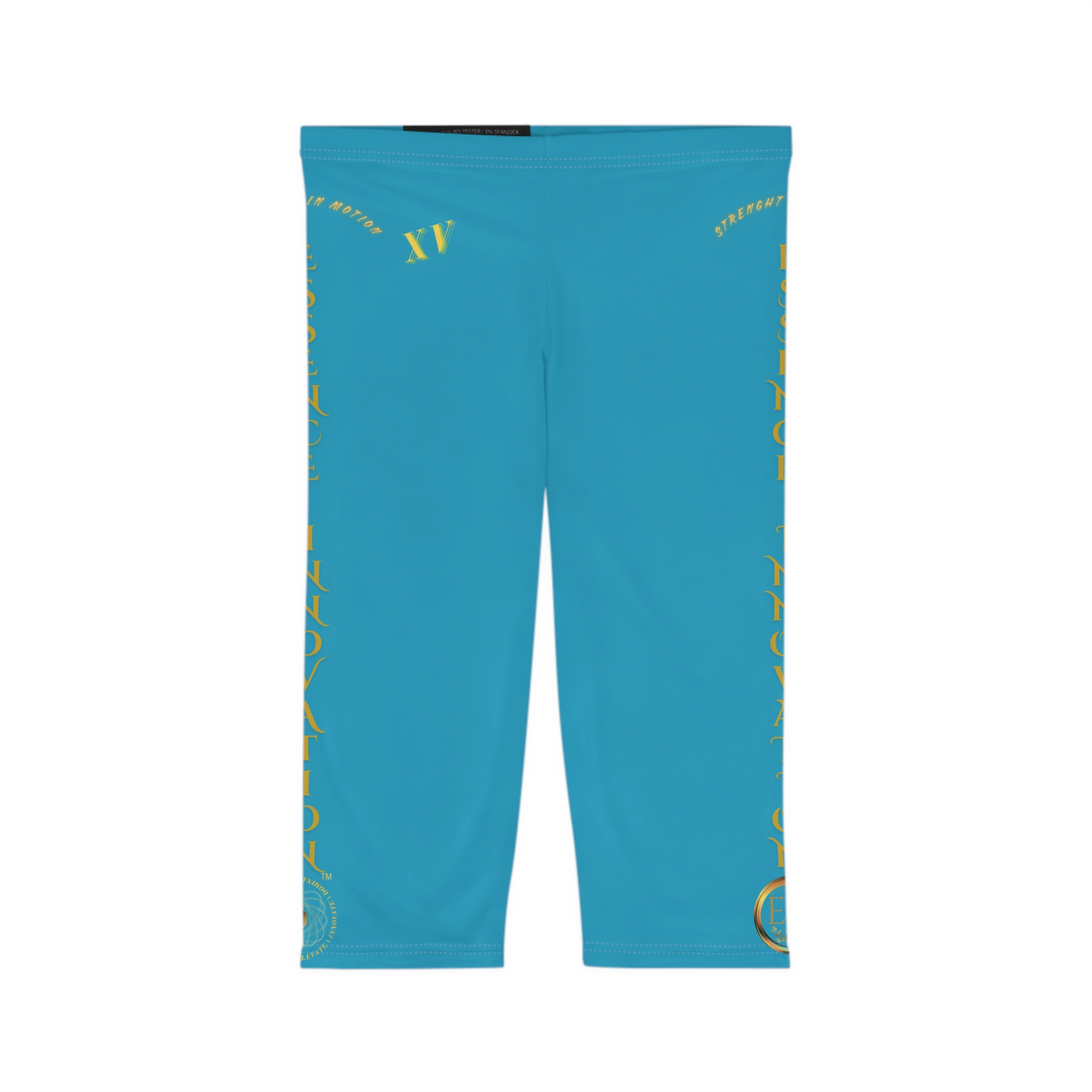 Seek More CL XV in turquoise offers skinny fit, breathable fabric, and bold elegance. A Roman Numeral ladies capri legging symbolizing creativity, vitality, and balance in motion.
