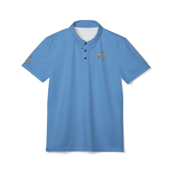 Light blue performance polo with black stitching. Breathable polyester, classic collar, and versatile style for active or casual wear.