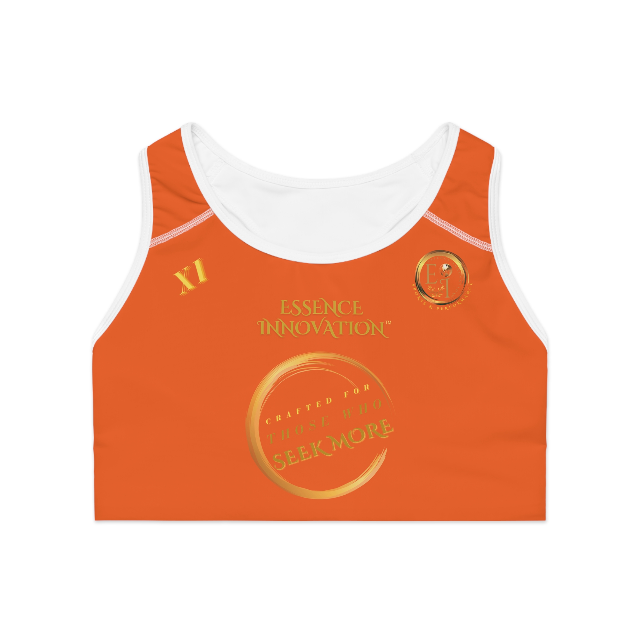 Seek More SB XI in orange delivers compression support, breathable fabric, and sleek design. A Roman Numeral ladies sports bra symbolizing energy, optimism, and confidence.