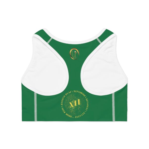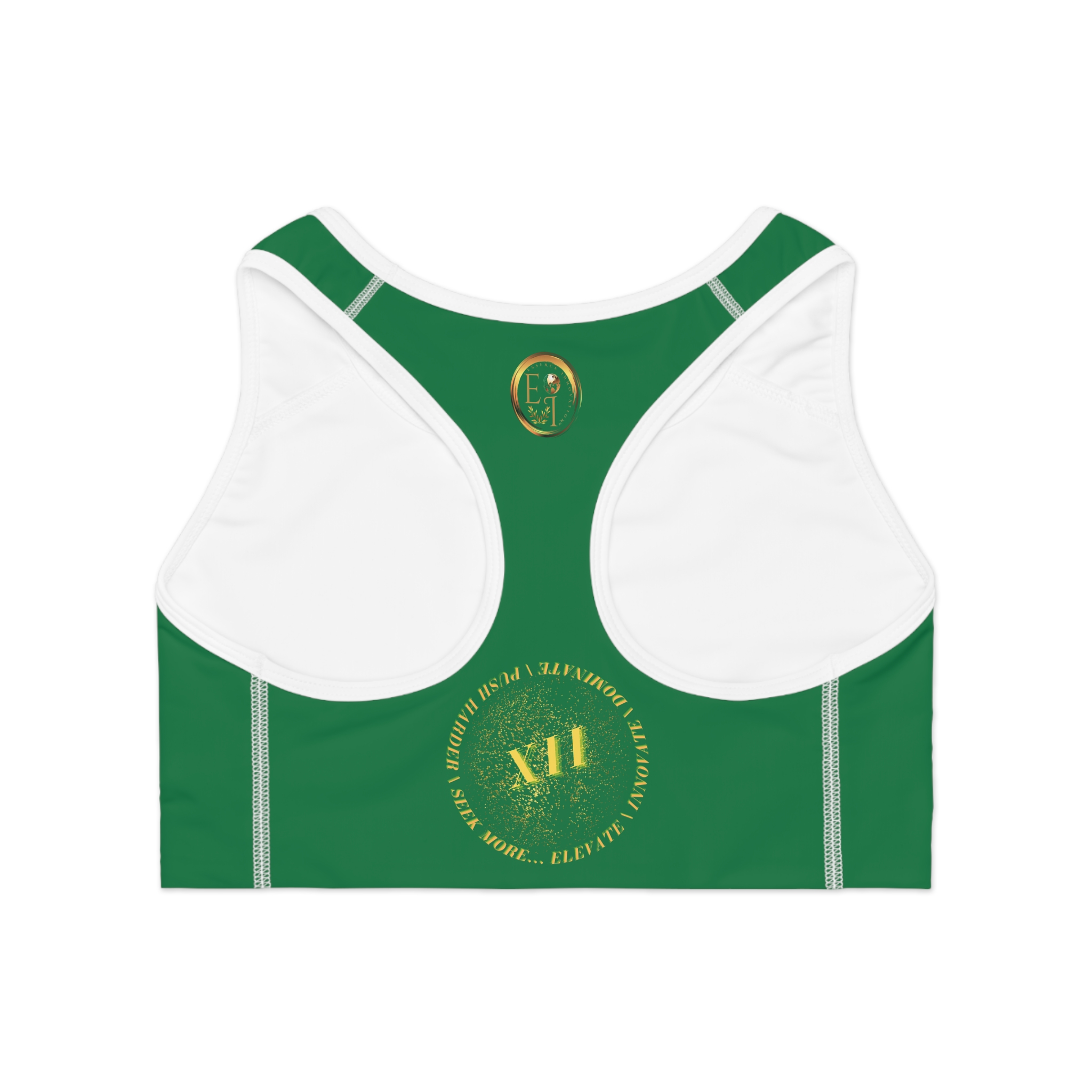 Seek More SB XII in dark green combines compression support, moisture-wicking fabric, and sleek style. A Roman Numeral ladies sports bra symbolizing balance and resilience.