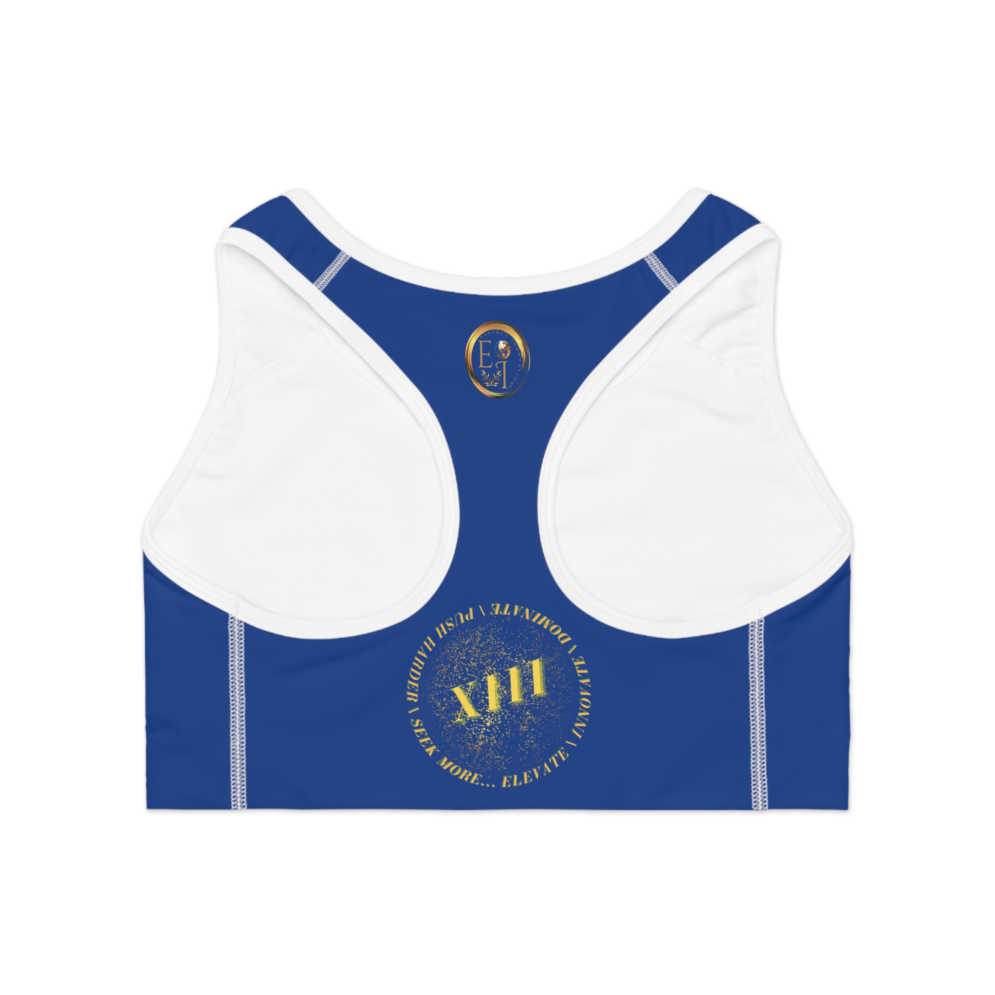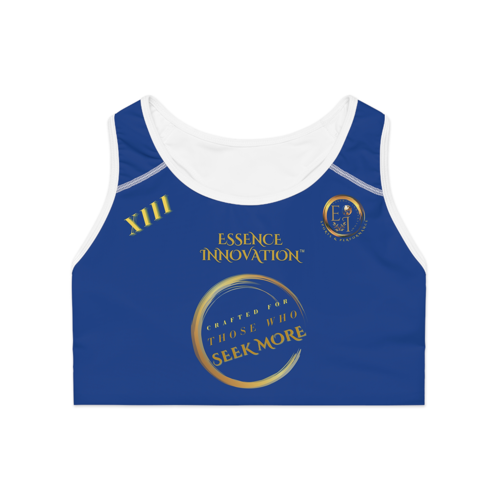 Seek More SB XIII in dark blue delivers compression support, breathable fabric, and timeless design. A Roman Numeral ladies sports bra symbolizing focus and calm strength.