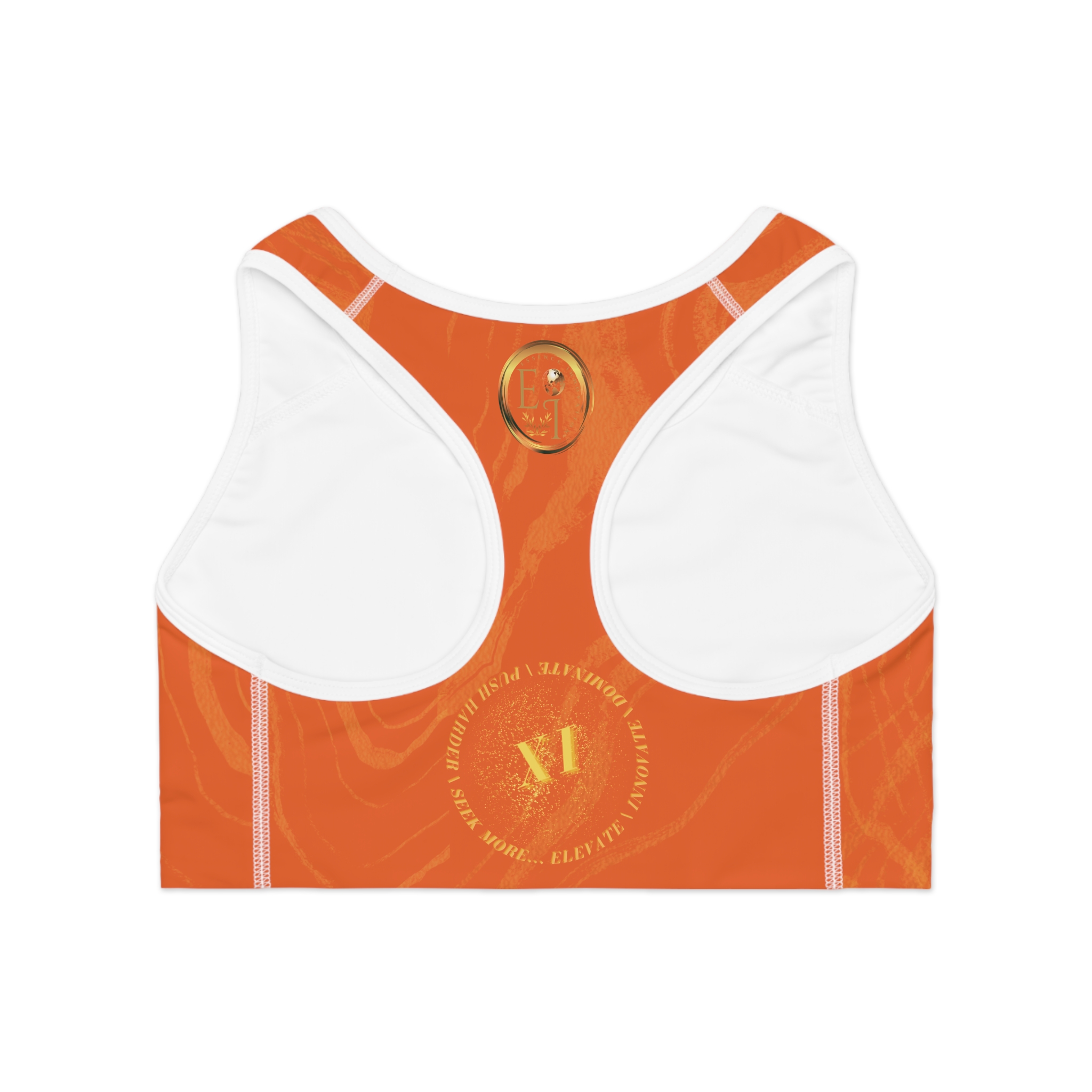 Seek More SBS XI in orange striped design delivers compression fit, breathable fabric, and bold style. A Roman Numeral ladies sports bra symbolizing optimism and strength.