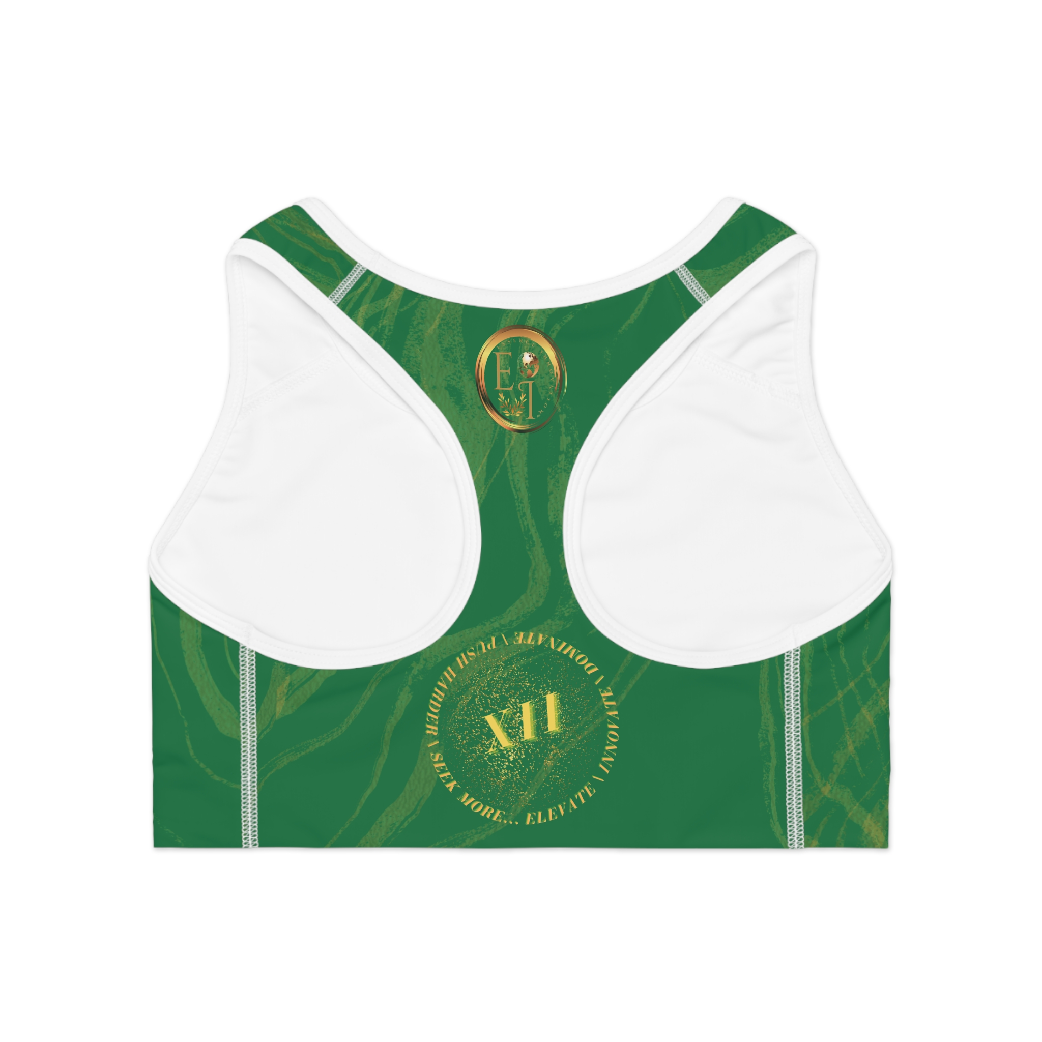 Seek More SBS XII in dark green striped blends compression fit, breathable fabric, and bold elegance. A Roman Numeral ladies sports bra symbolizing balance, growth, and resilience.