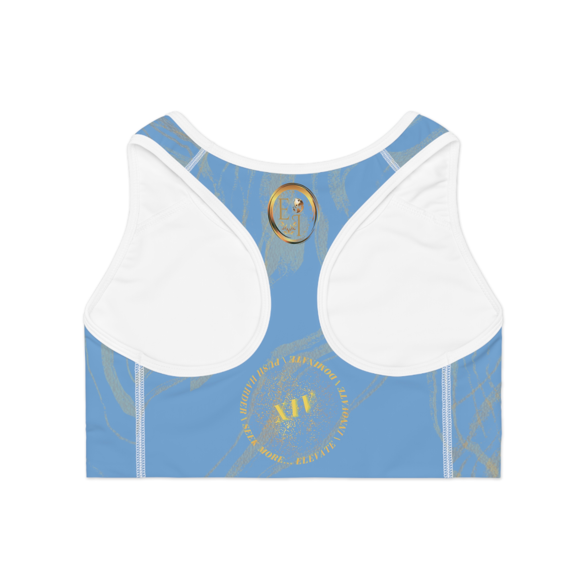 Seek More SBS XIV in light blue striped blends compression fit, breathable fabric, and elegant style. A Roman Numeral ladies sports bra symbolizing clarity, harmony, and balance.