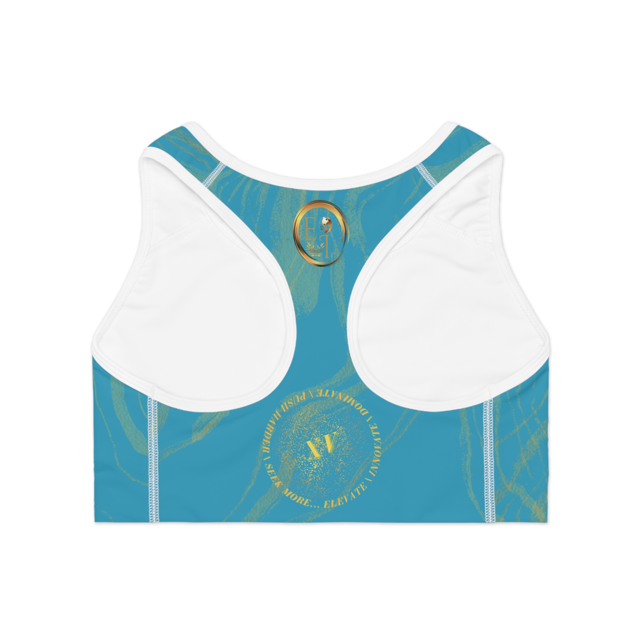 Seek More SBS XV in turquoise striped design blends compression support, breathable fabric, and vibrant elegance. A Roman Numeral ladies sports bra symbolizing creativity and balance.