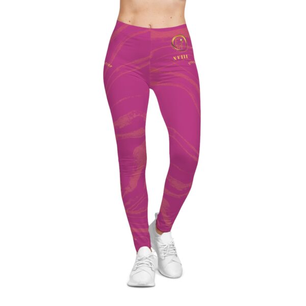 Seek More Striped XVIII Women’s Casual Leggings in pink — silky, sleek, and versatile. Roman Numeral XVIII design reflects love, joy, and graceful energy.