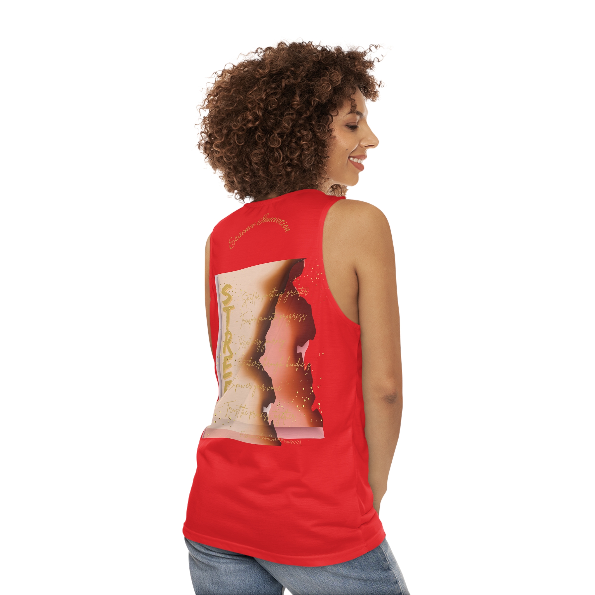 The STREET Gold Graffiti IX | Unisex Tank Top | Red is more than apparel—it’s conviction you can wear. Part of the STREET Collection, this Humanity’s Values design calls out six guiding principles: Stand. Transform. Respect. Elevate. Empower. Trust. On the front, distressed gold graffiti spells out “STREET” with raw urgency. On the back, a burned-scroll visual stands as a reminder that these values are tested daily, but they will never burn away completely.