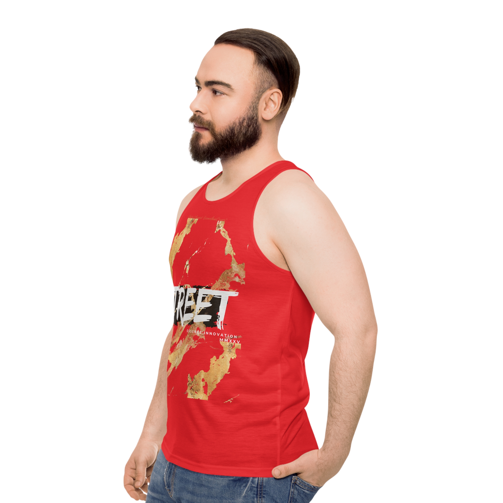 The STREET Gold Graffiti IX Red Tank Top combines bold gold graffiti with fiery red energy—built on six timeless values: Stand. Transform. Respect. Elevate. Empower. Trust.