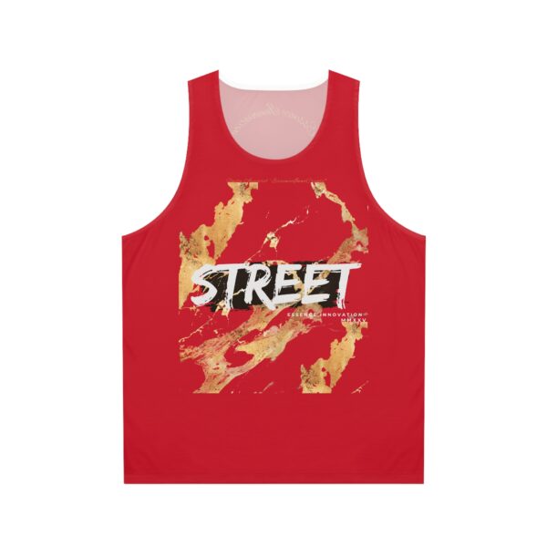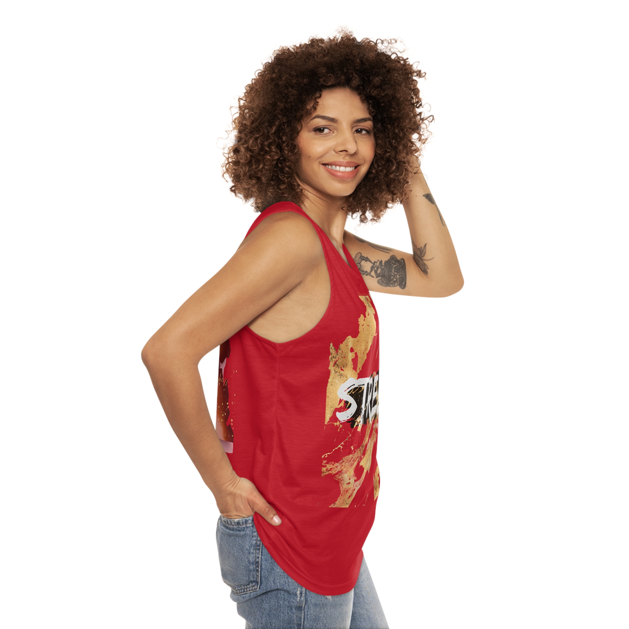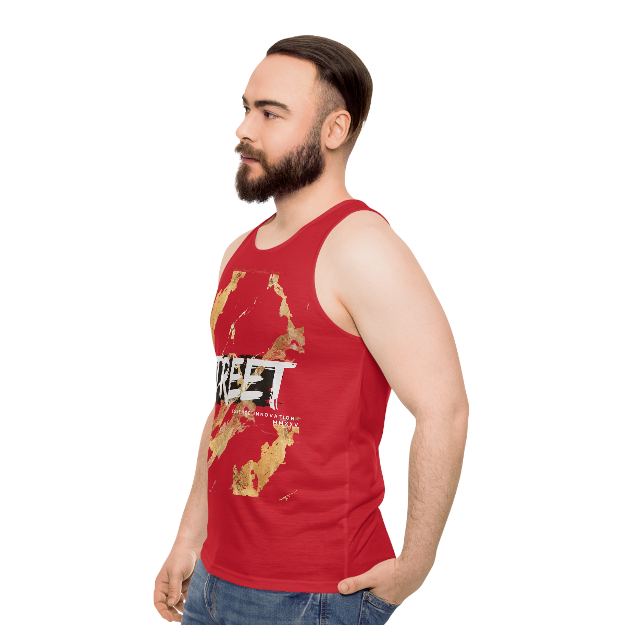 The STREET Gold Graffiti X Dark Red Tank Top delivers bold graffiti art and six timeless values: Stand. Transform. Respect. Elevate. Empower. Trust.