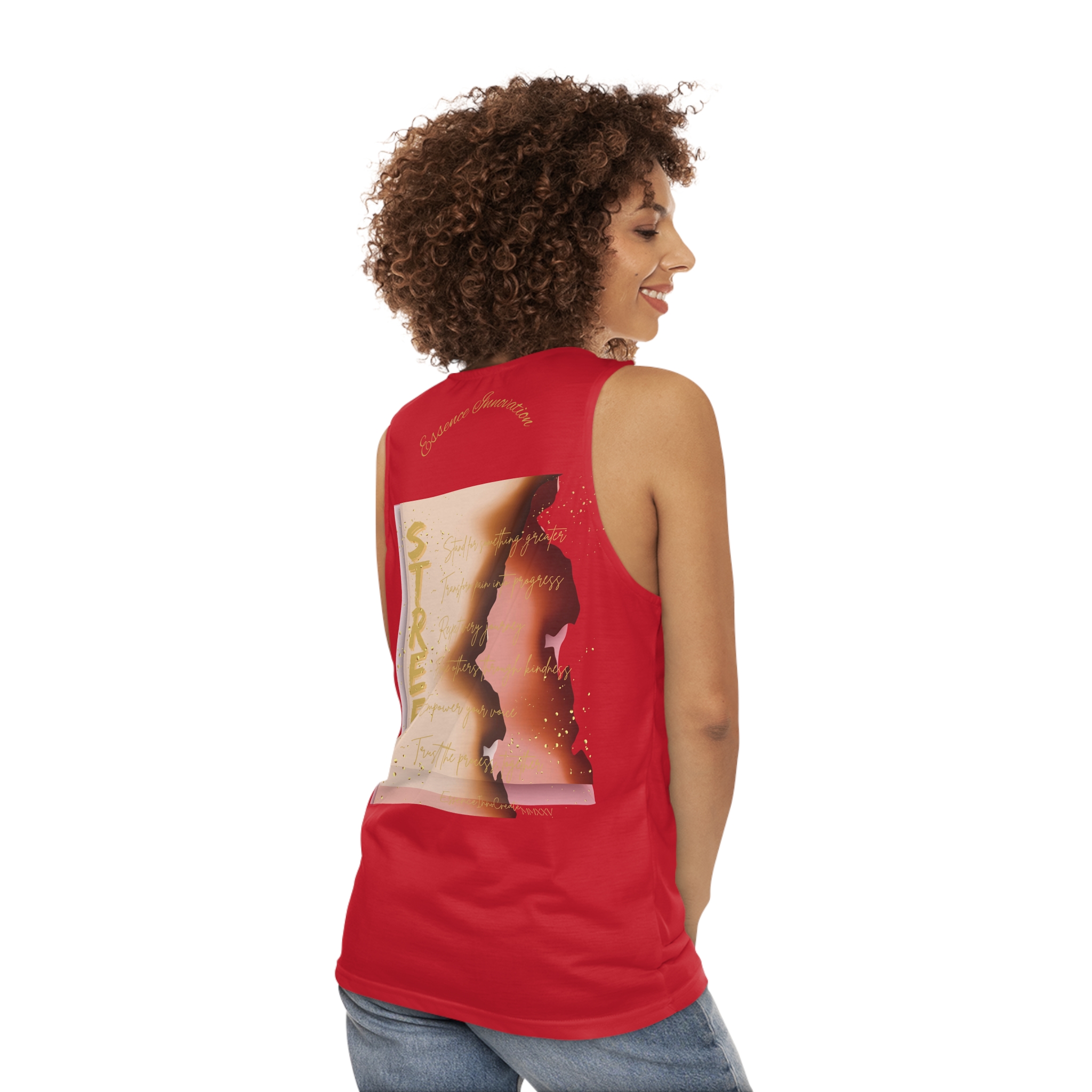 The STREET Gold Graffiti X | Unisex Tank Top | Dark Red is more than a streetwear essential—it’s a message carved into fabric. As part of the STREET Collection, this Humanity’s Values design celebrates six core principles: Stand. Transform. Respect. Elevate. Empower. Trust. Distressed gold graffiti blazes across the front with unfiltered intensity, while a burned-scroll artwork on the back reminds us that these values may be scarred by indifference, but they endure through those who choose to wear and live them.