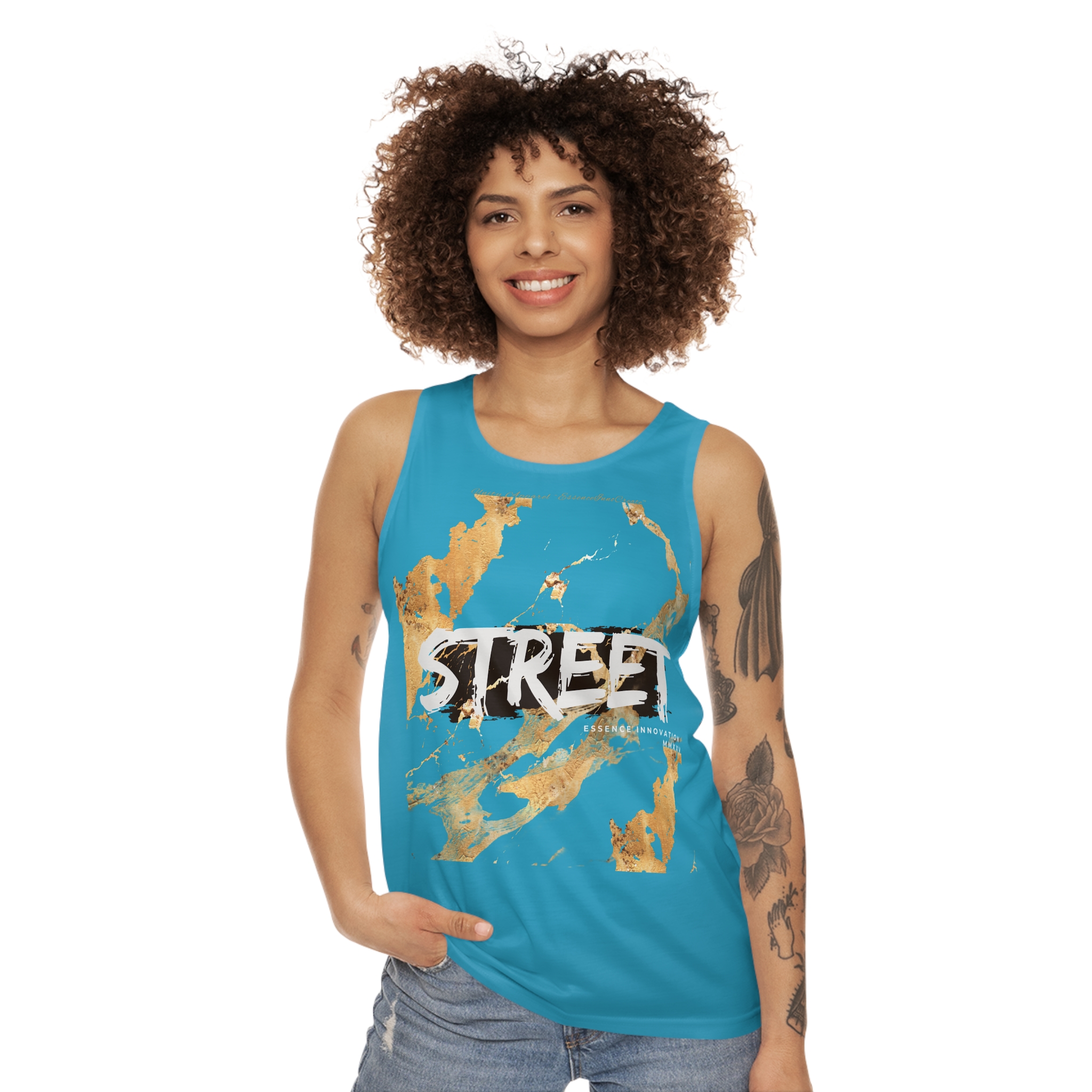 The STREET Gold Graffiti XV | Unisex Tank Top | Turquoise radiates fresh energy and creative strength. As part of the STREET Collection, this Humanity’s Values piece carries six principles: Stand. Transform. Respect. Elevate. Empower. Trust. On the front, distressed gold graffiti makes “STREET” pop against turquoise fabric. On the back, the burned-scroll artwork symbolizes the pressure these values face, yet also the resilience that keeps them alive.