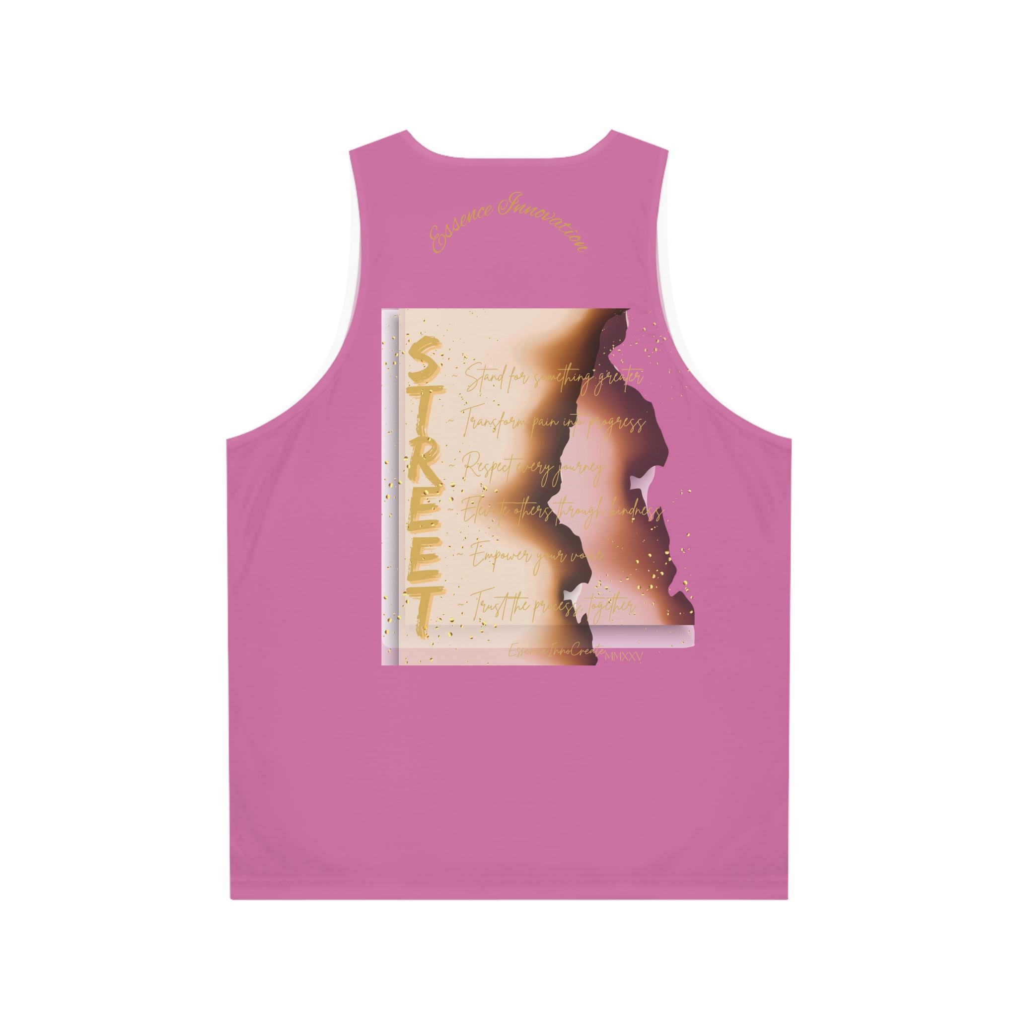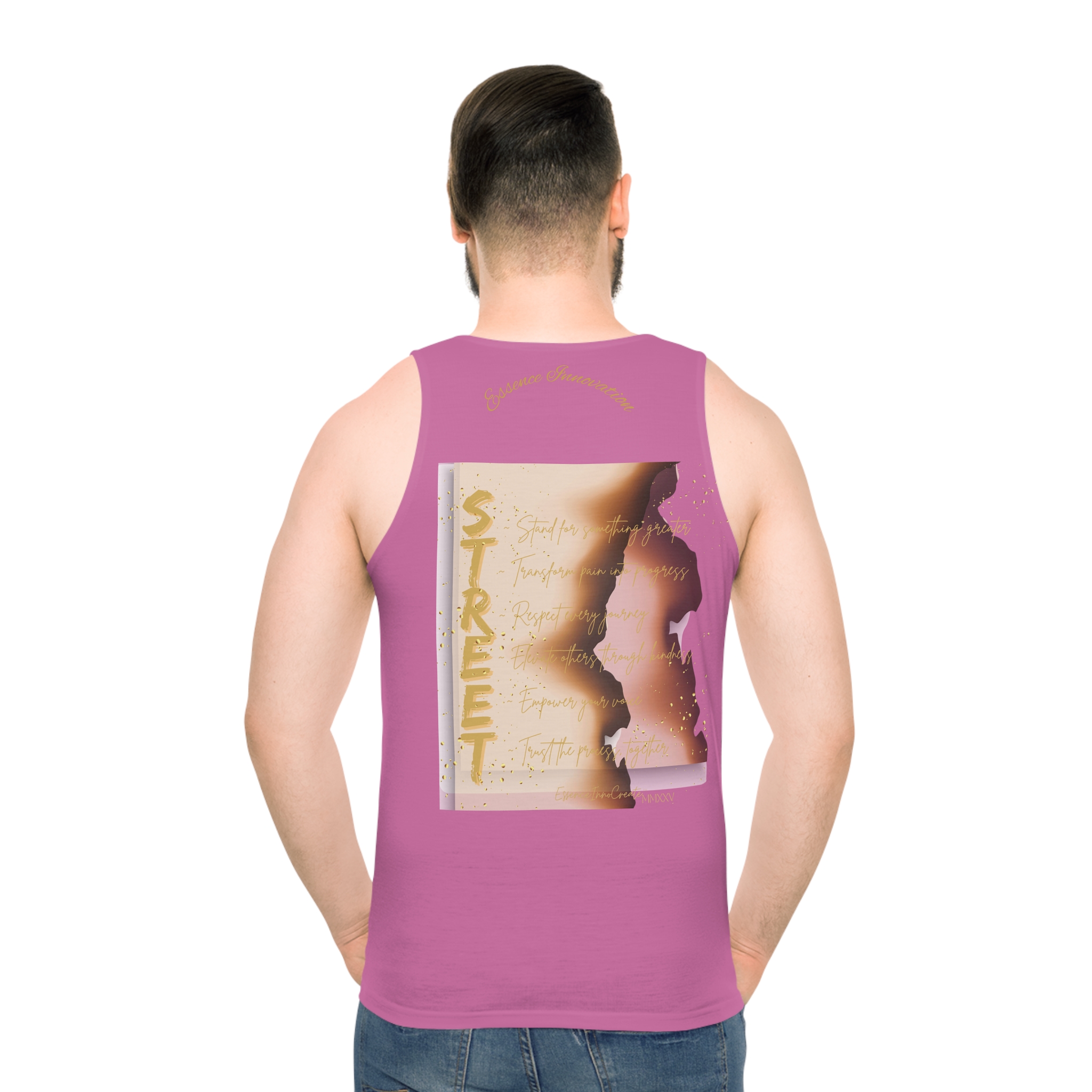 The STREET Gold Graffiti XVII | Unisex Tank Top | Light Pink embodies resilience with calm confidence. Part of the STREET Collection, this Humanity’s Values edition honors six guiding principles: Stand. Transform. Respect. Elevate. Empower. Trust. The front showcases distressed gold graffiti spelling out “STREET,” while the back carries a burned-scroll graphic—a visual reminder that though values may face fire, they endure through those who live them.