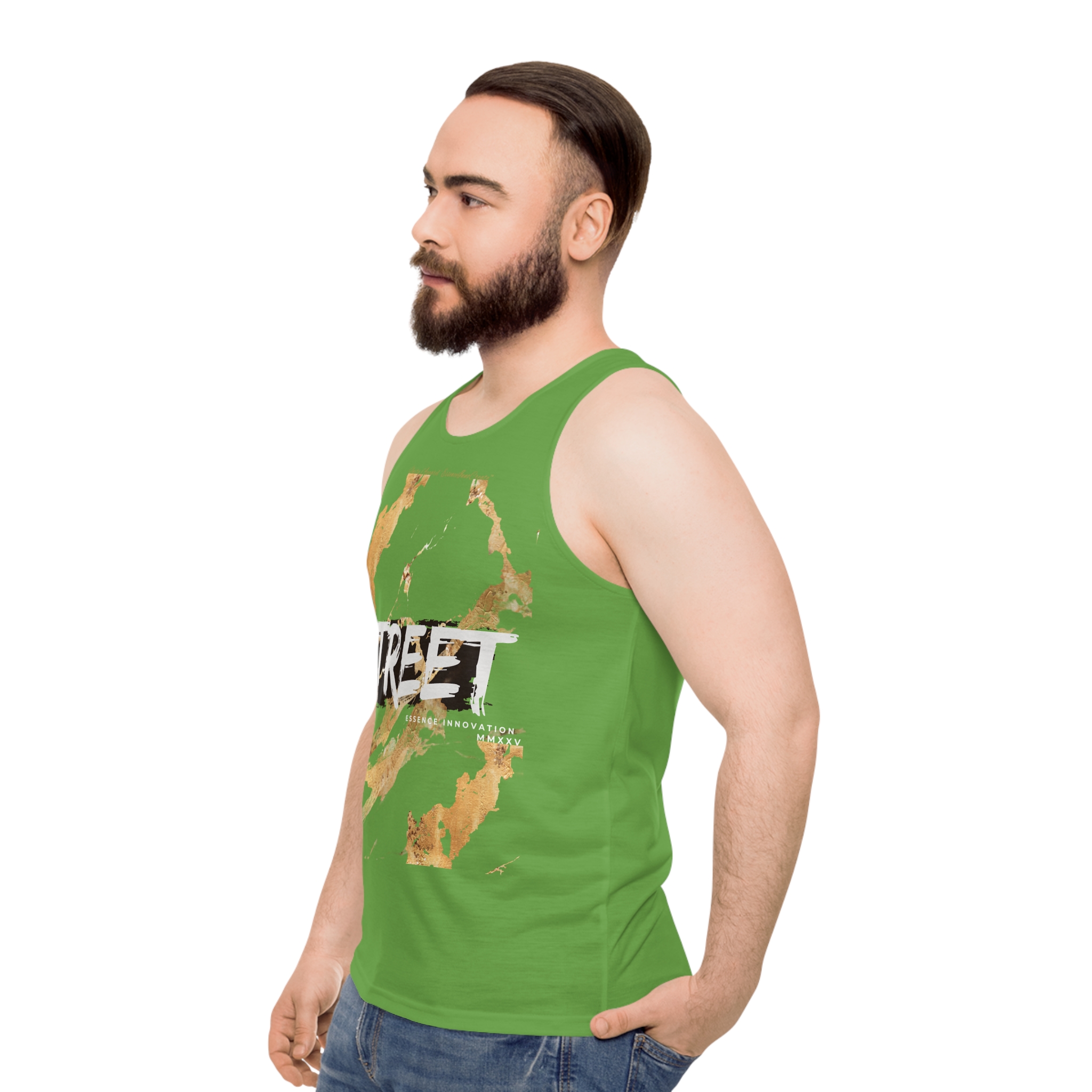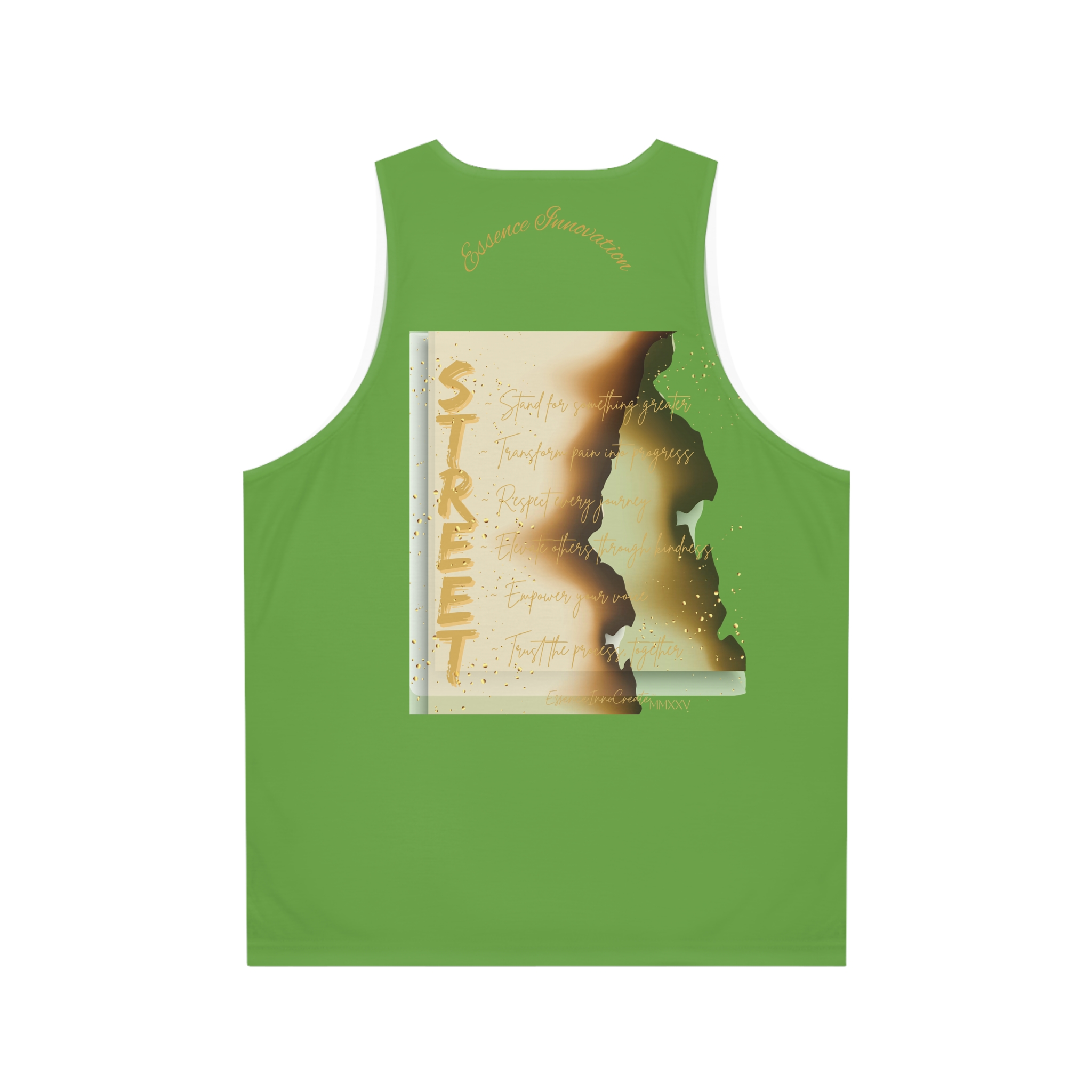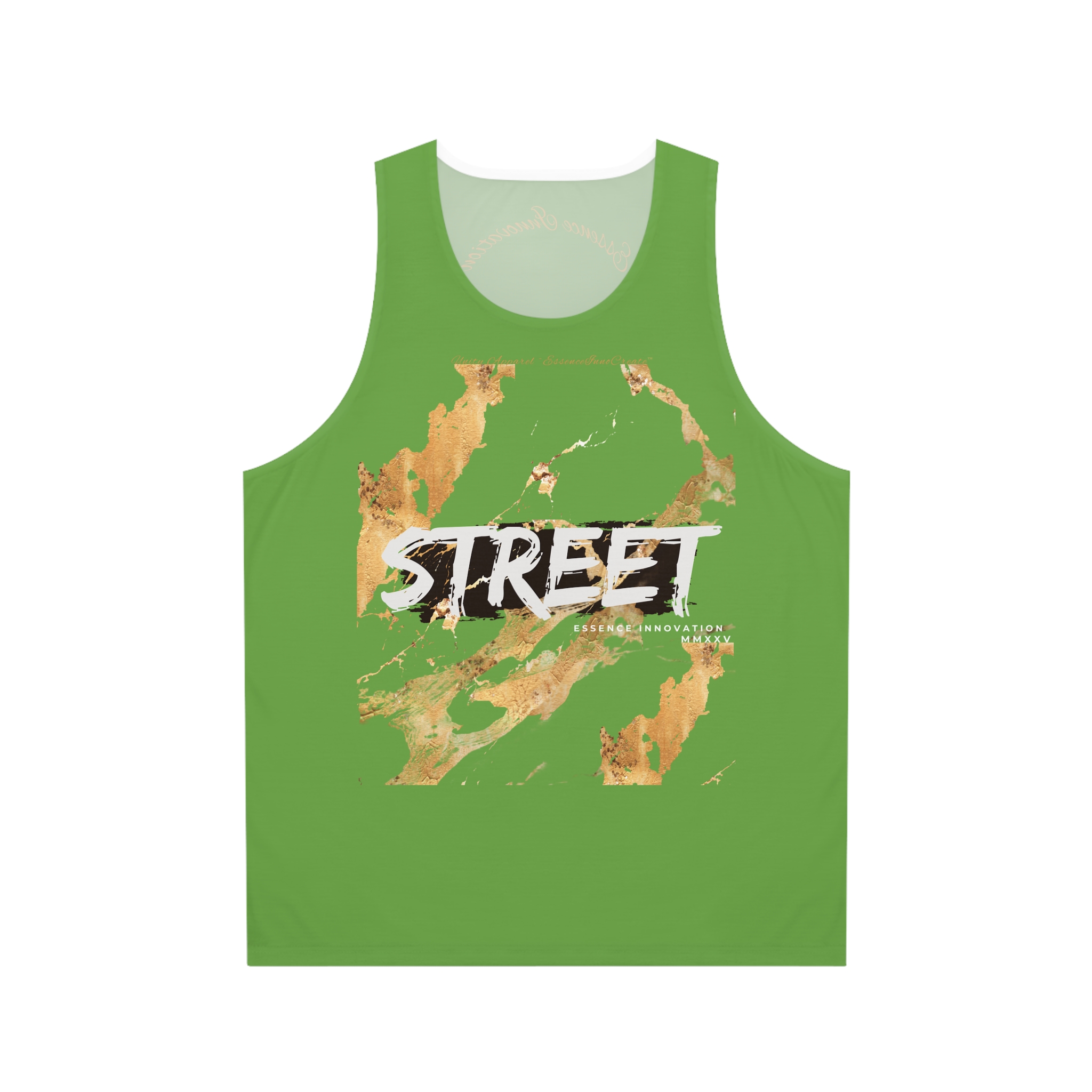 The STREET Gold Graffiti XXIV Light Green Tank Top unites refreshing color with graffiti art and six values—Stand. Transform. Respect. Elevate. Empower. Trust.—for modern streetwear.