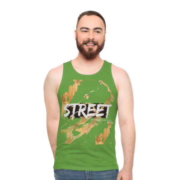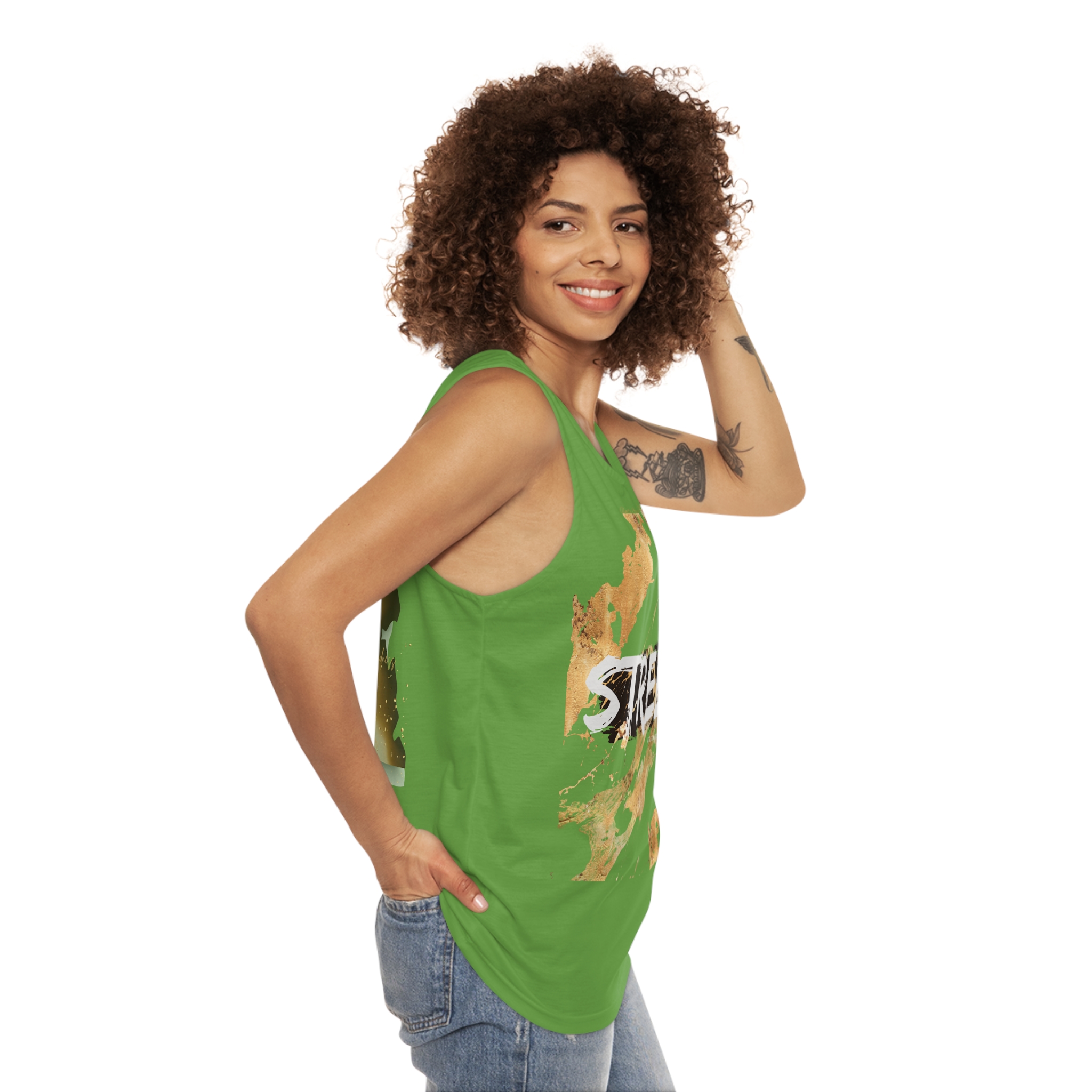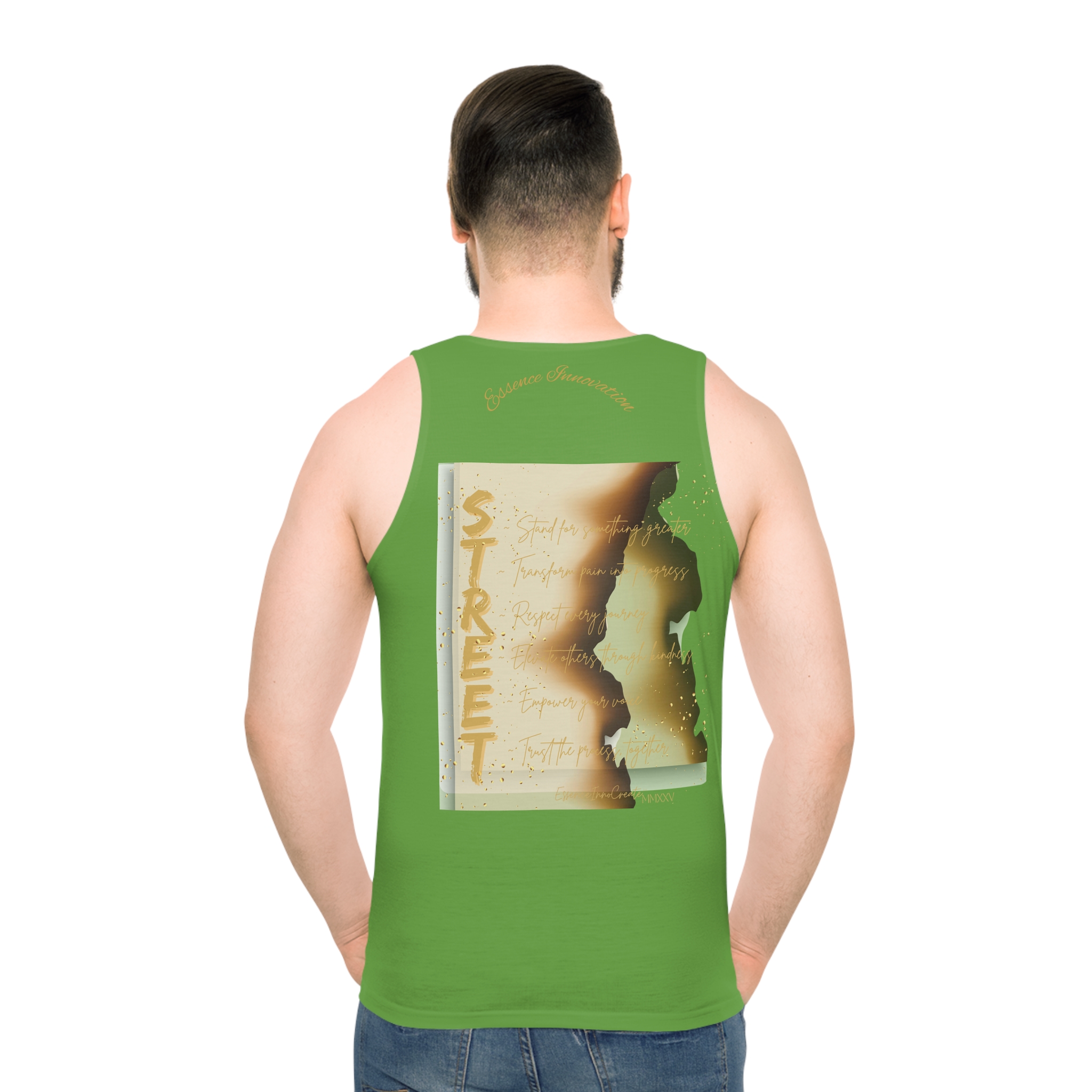 The STREET Gold Graffiti XXIV | Unisex Tank Top | Light Green captures vitality and resilience in one bold design. As part of the STREET Collection, this Humanity’s Values edition lifts up six timeless principles: Stand. Transform. Respect. Elevate. Empower. Trust. Distressed gold graffiti declares “STREET” across the front, while the burned-scroll design on the back reminds us that these values, though challenged, remain unbreakable.