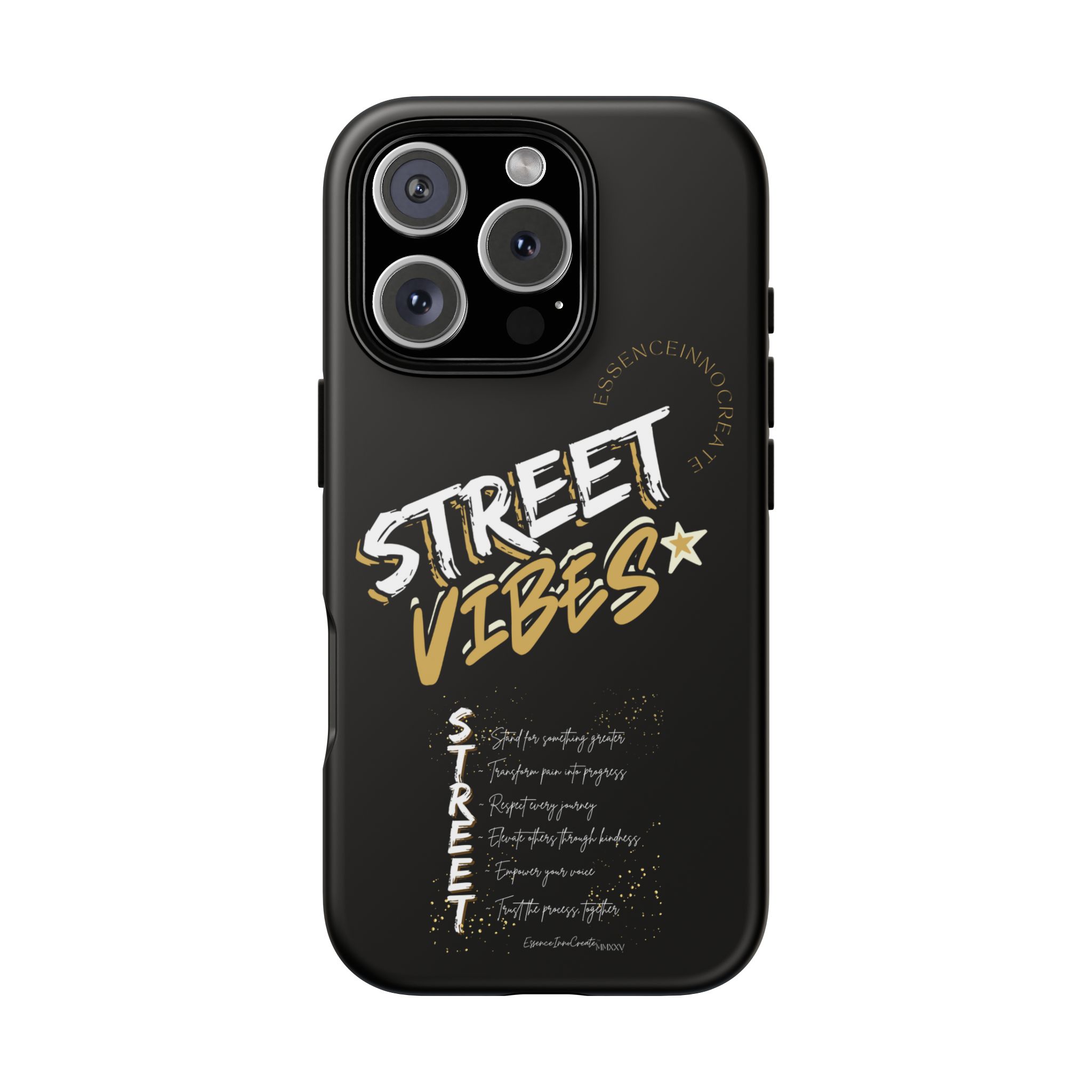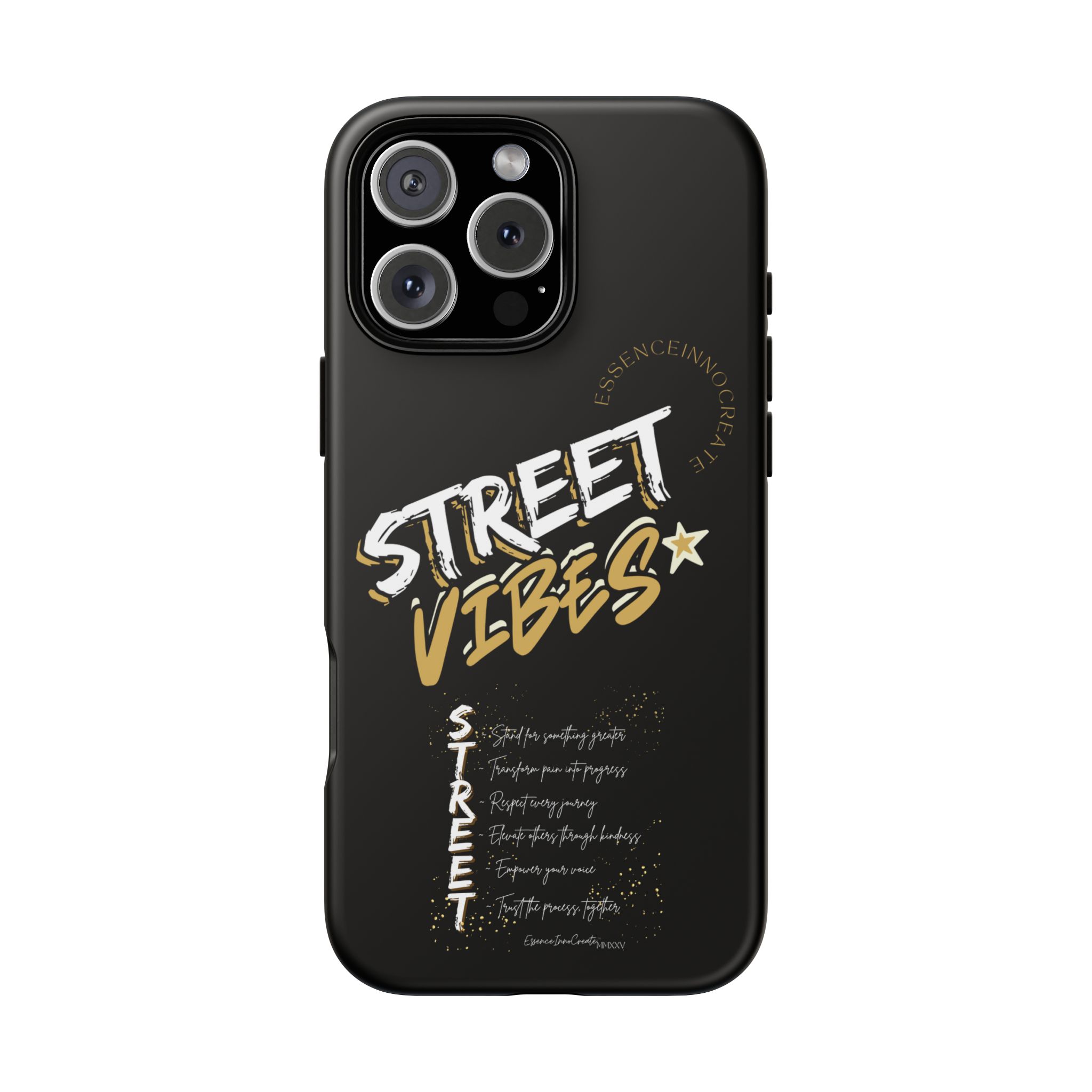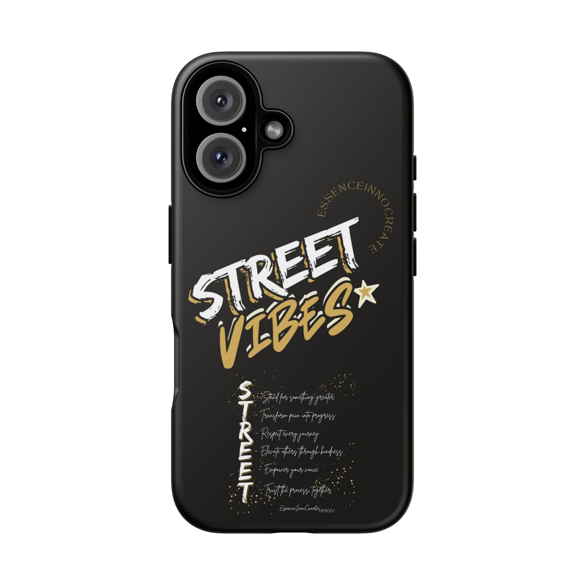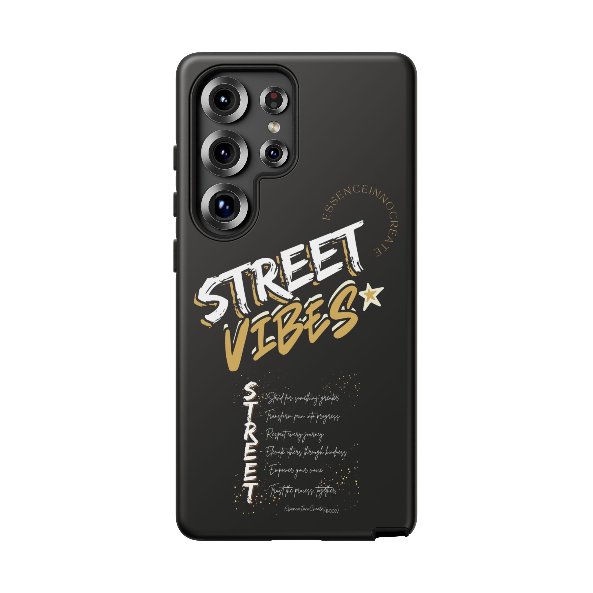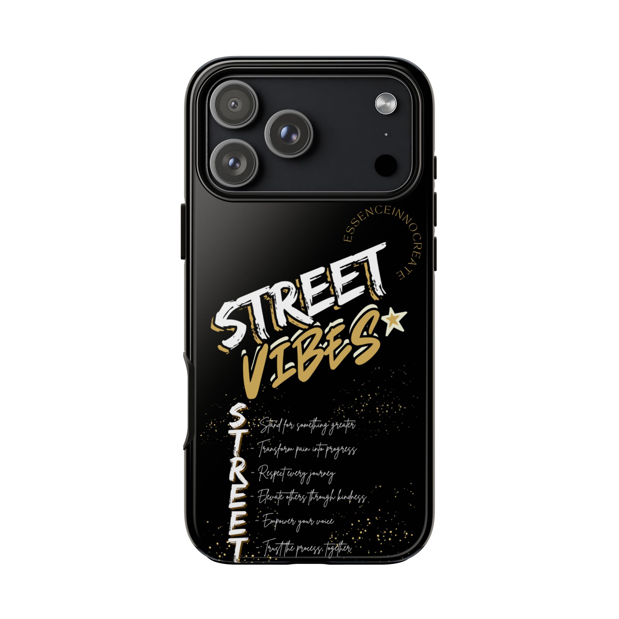 The Street Vibes Black phone case from EssenceInnoCreate is crafted for those who carry the pulse of the city in their hands. Designed with a matte black base and layered with bold, graphic street-style elements, this case becomes more than just protection—it becomes your mobile signature. From sidewalks to subways, it keeps up with your pace and keeps your phone looking sharp.