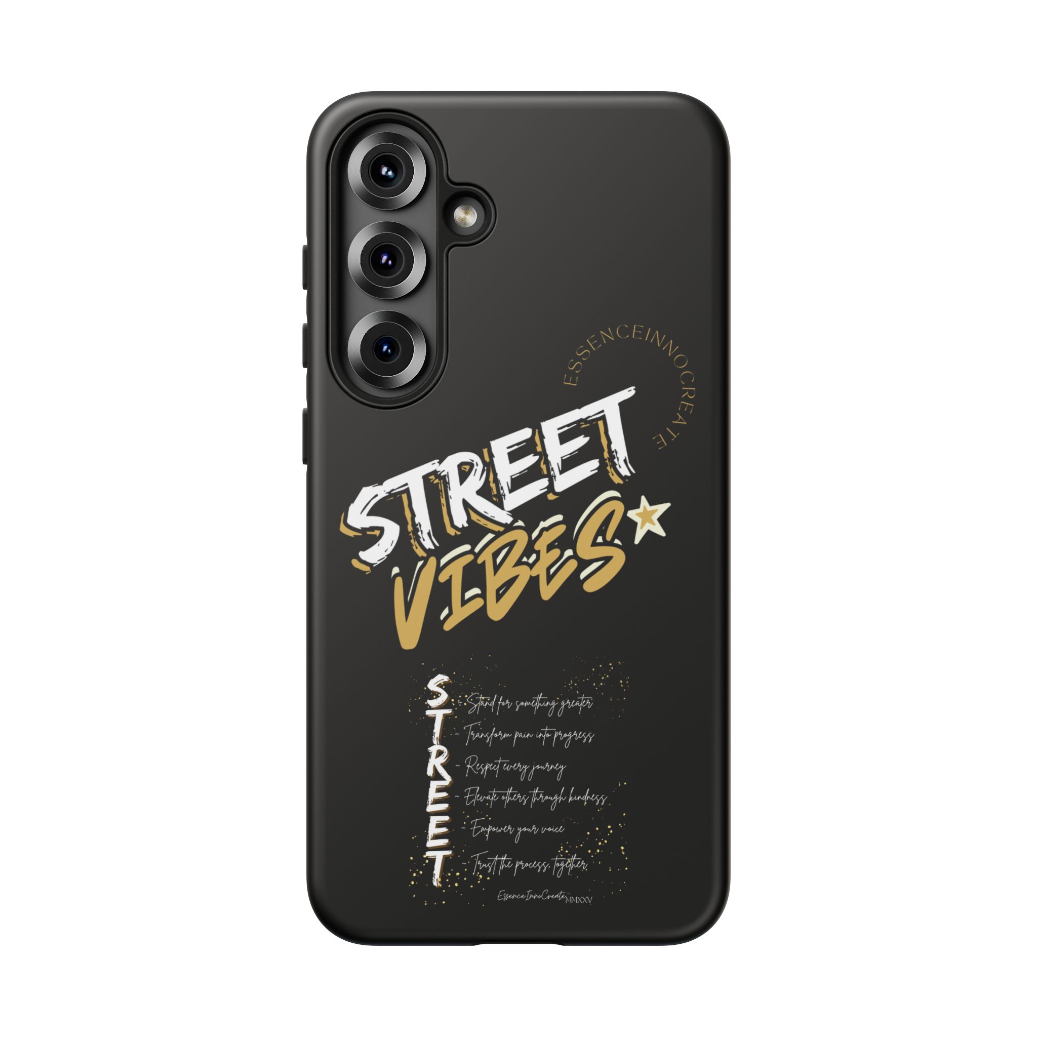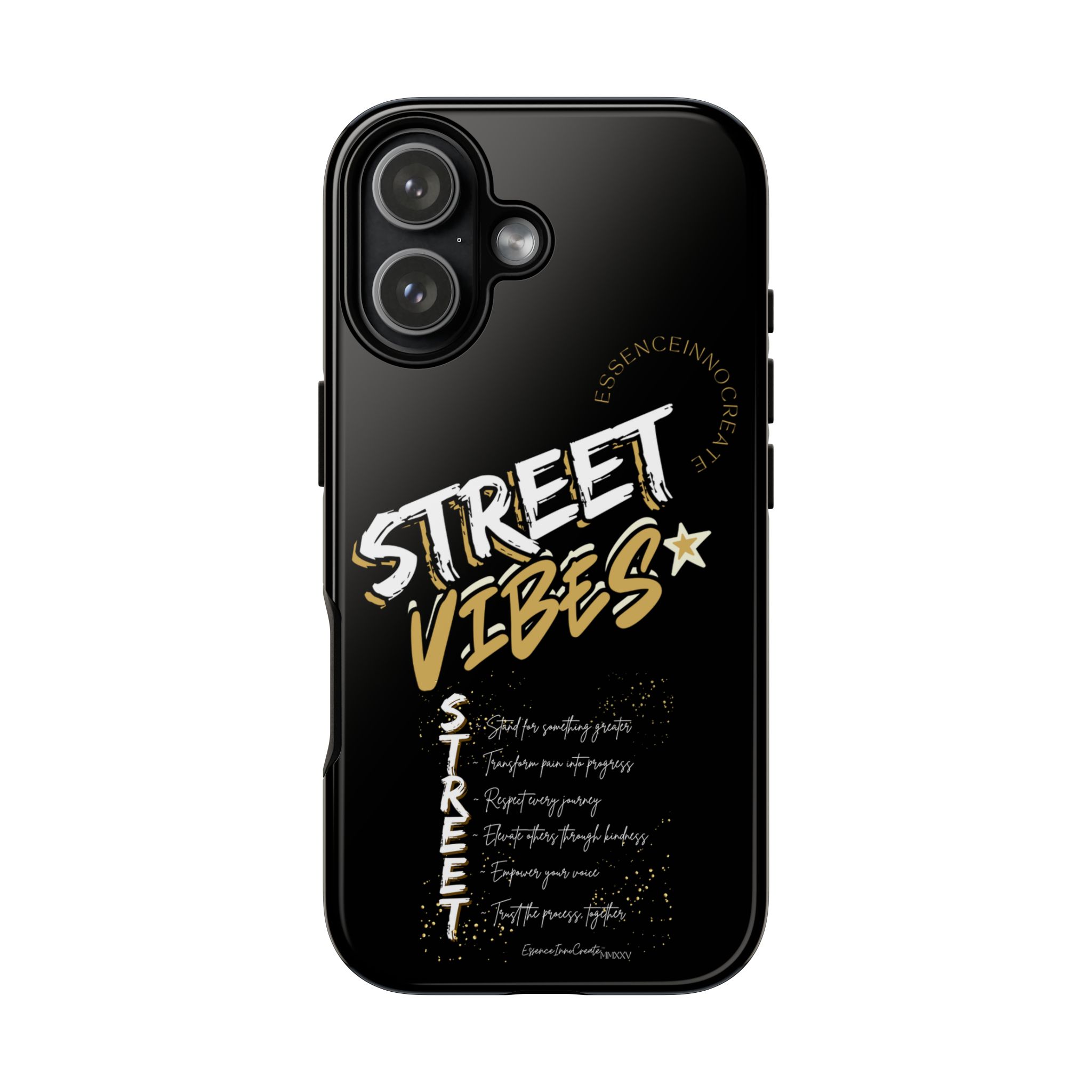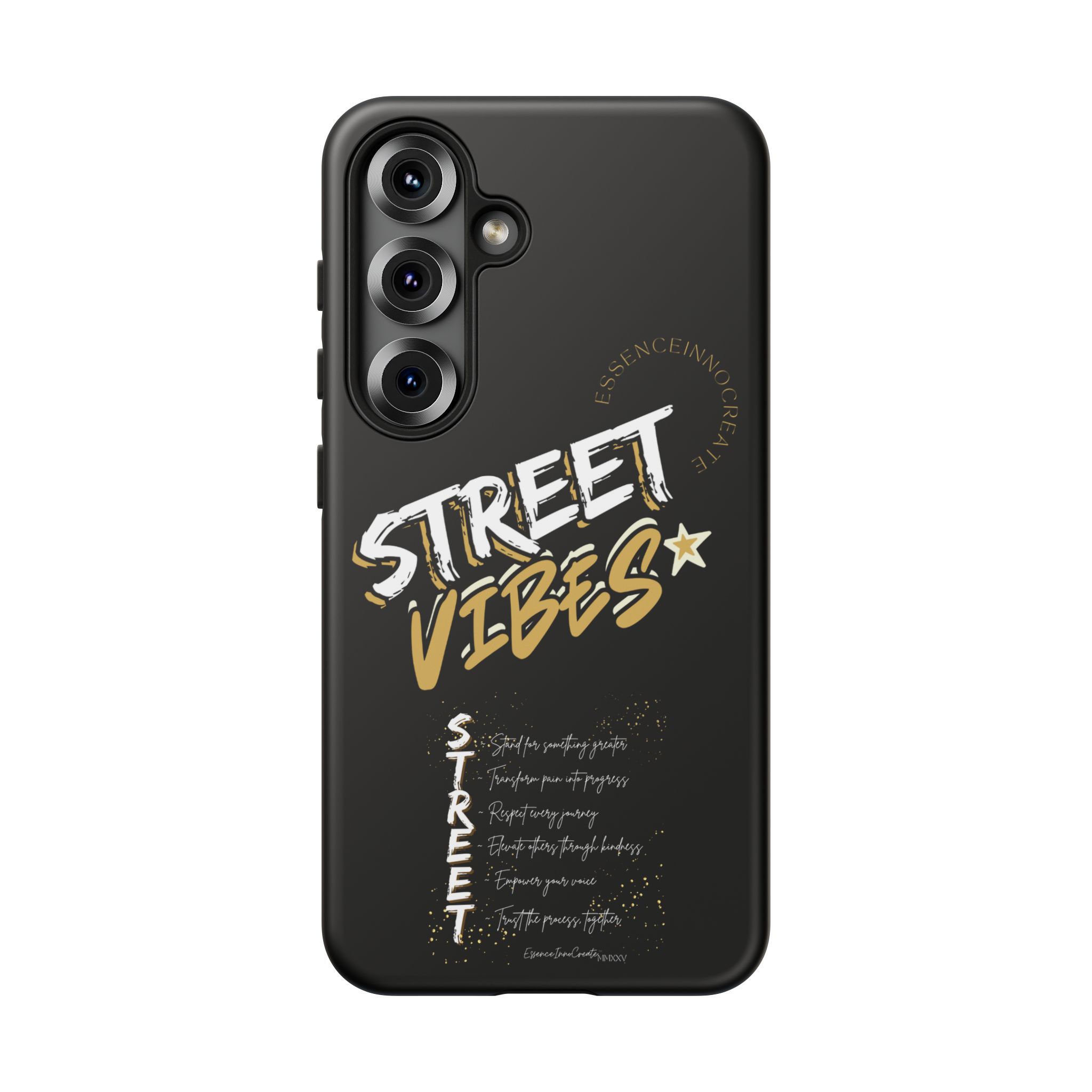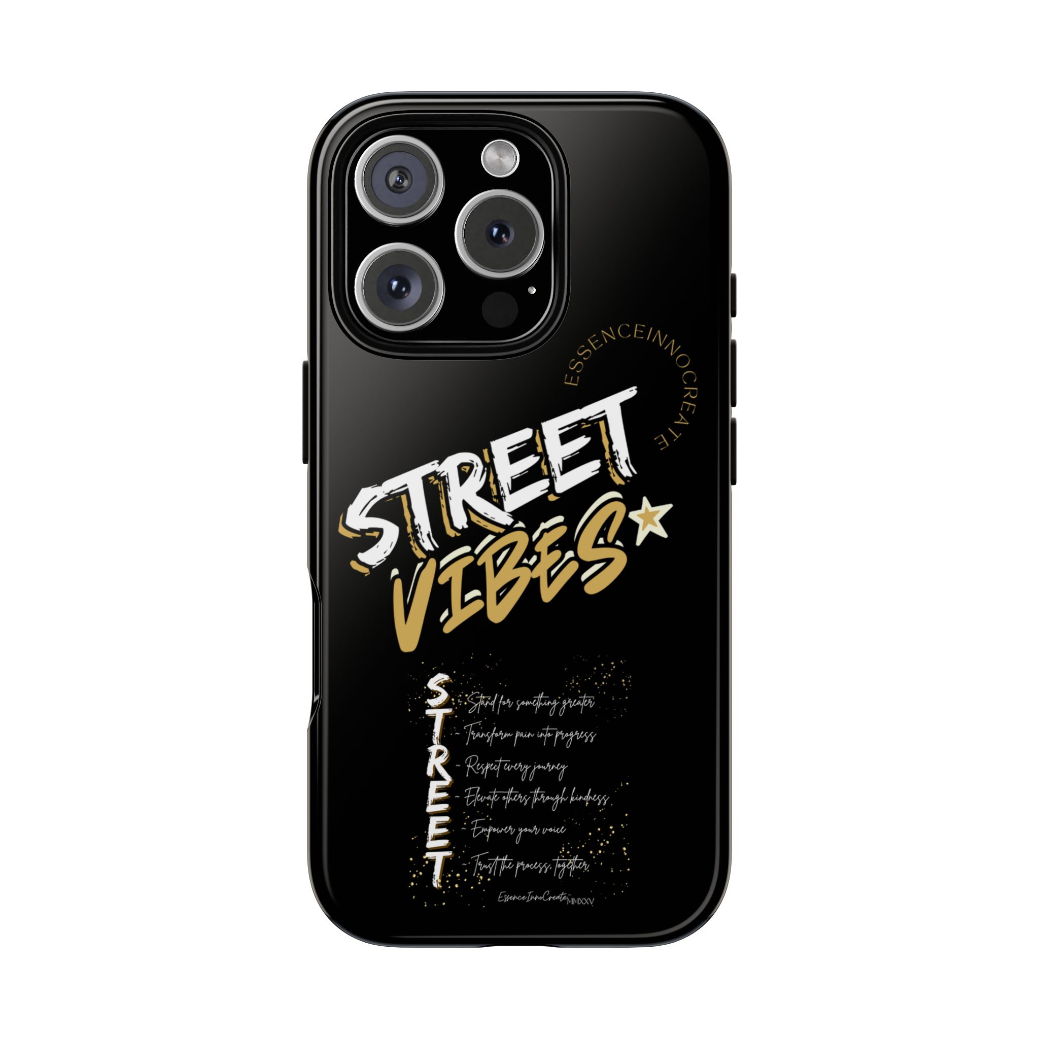 The Street Vibes Black phone case from EssenceInnoCreate is crafted for those who carry the pulse of the city in their hands. Designed with a matte black base and layered with bold, graphic street-style elements, this case becomes more than just protection—it becomes your mobile signature. From sidewalks to subways, it keeps up with your pace and keeps your phone looking sharp.