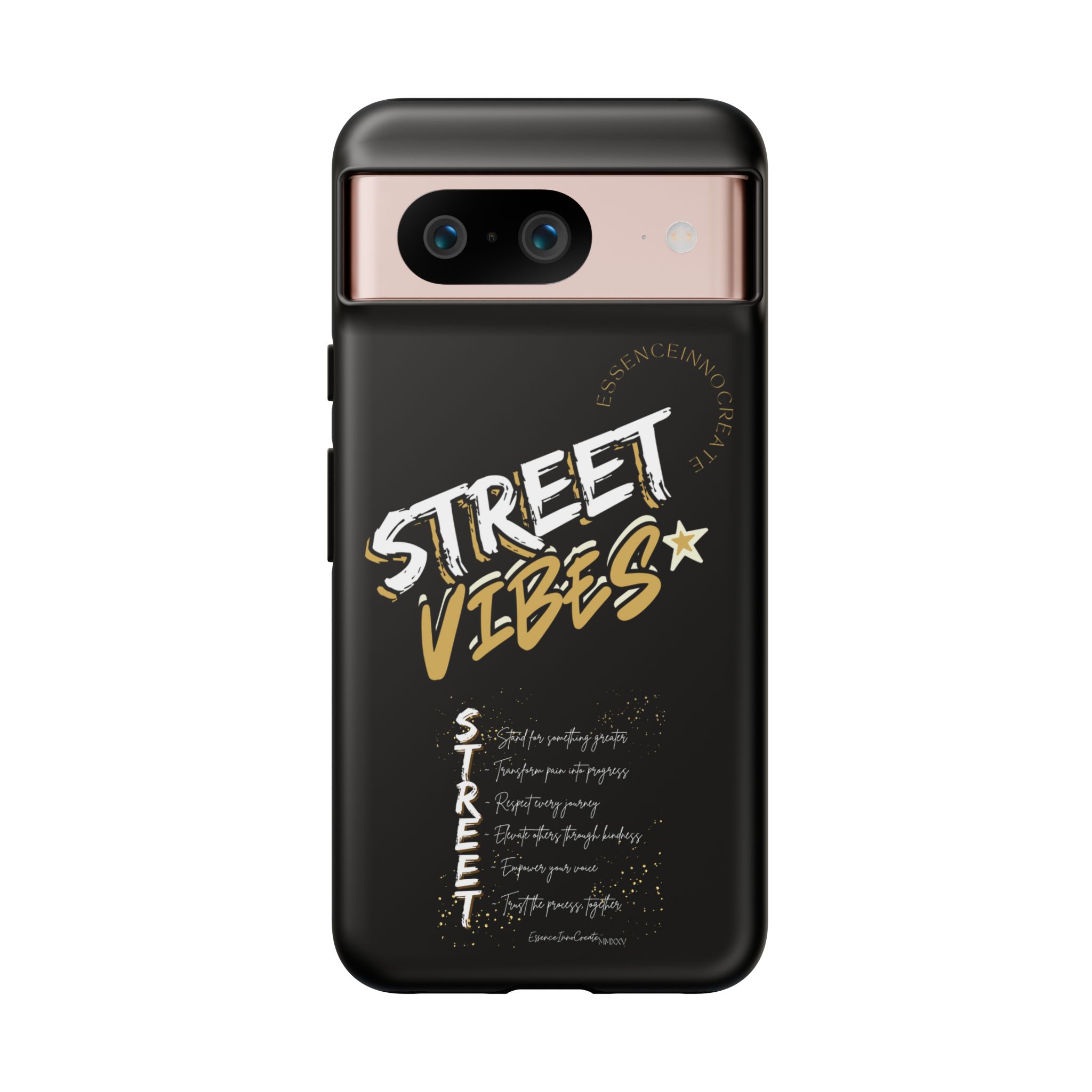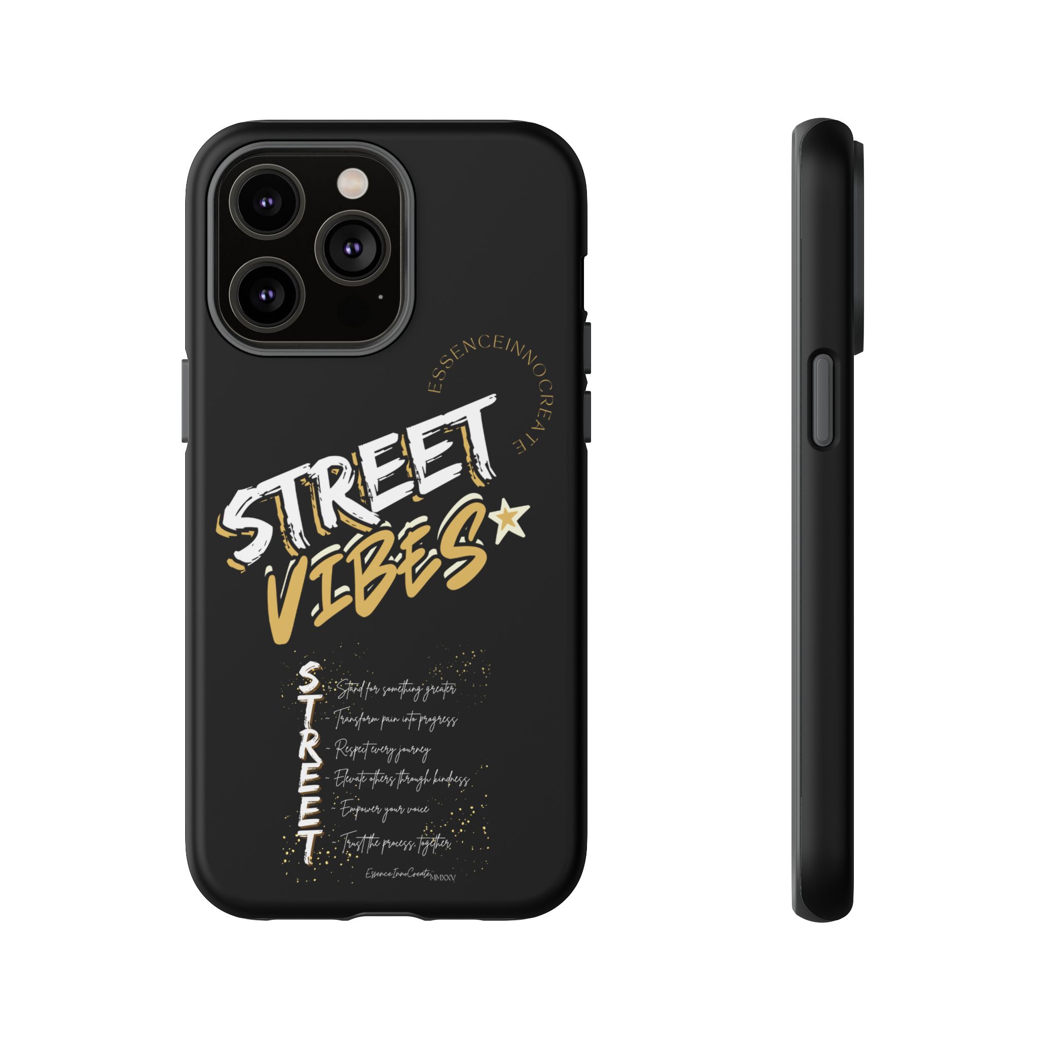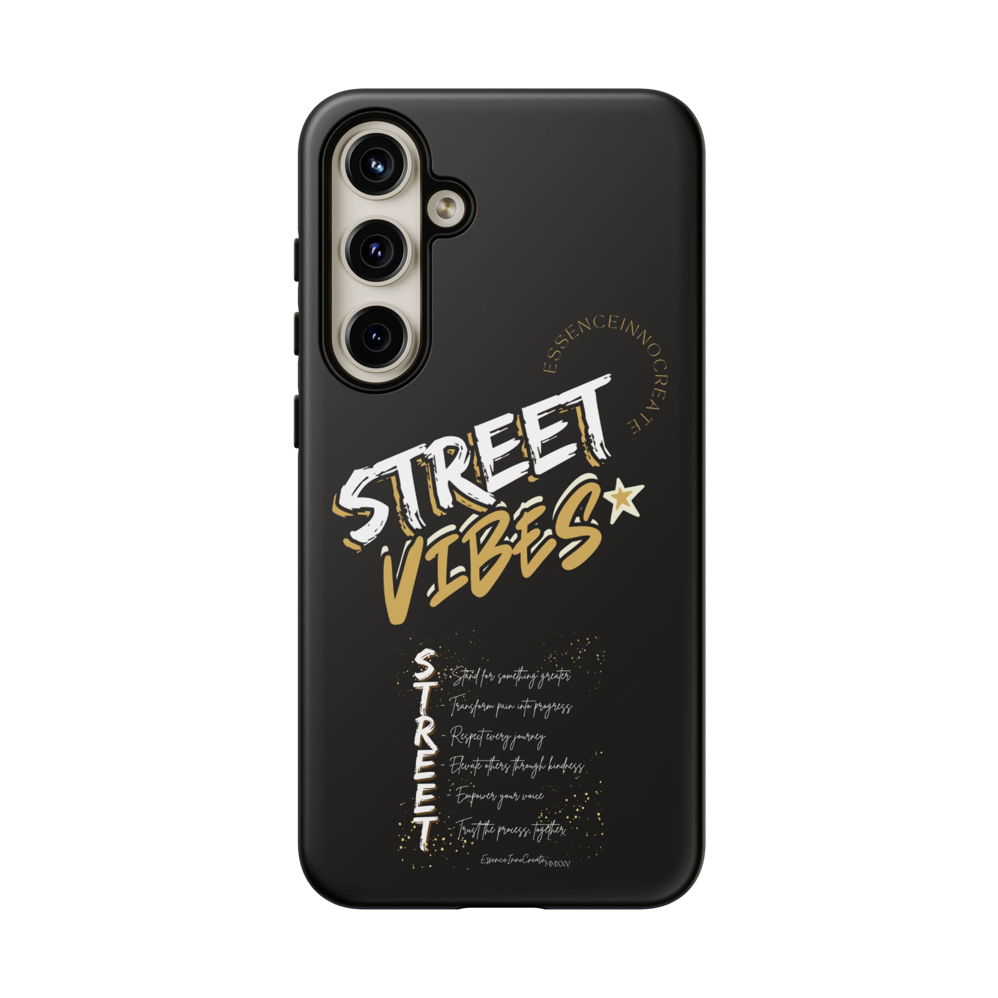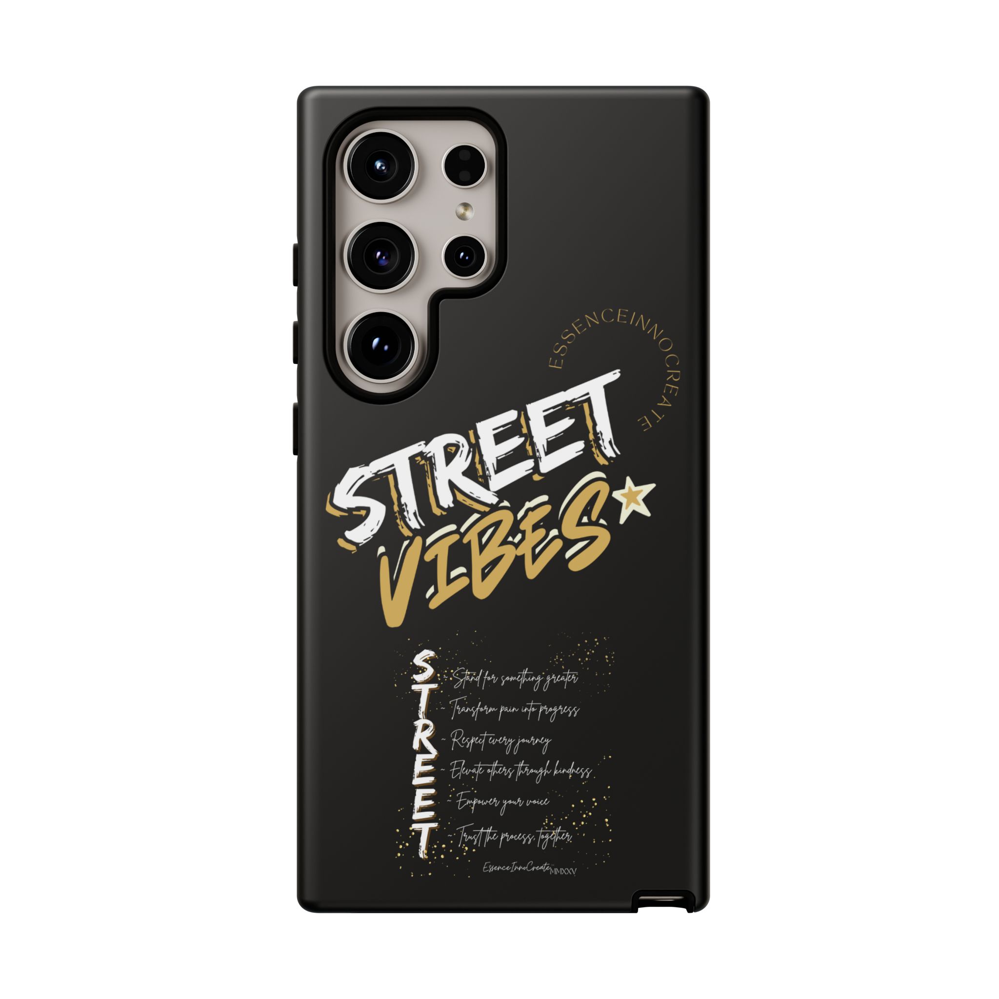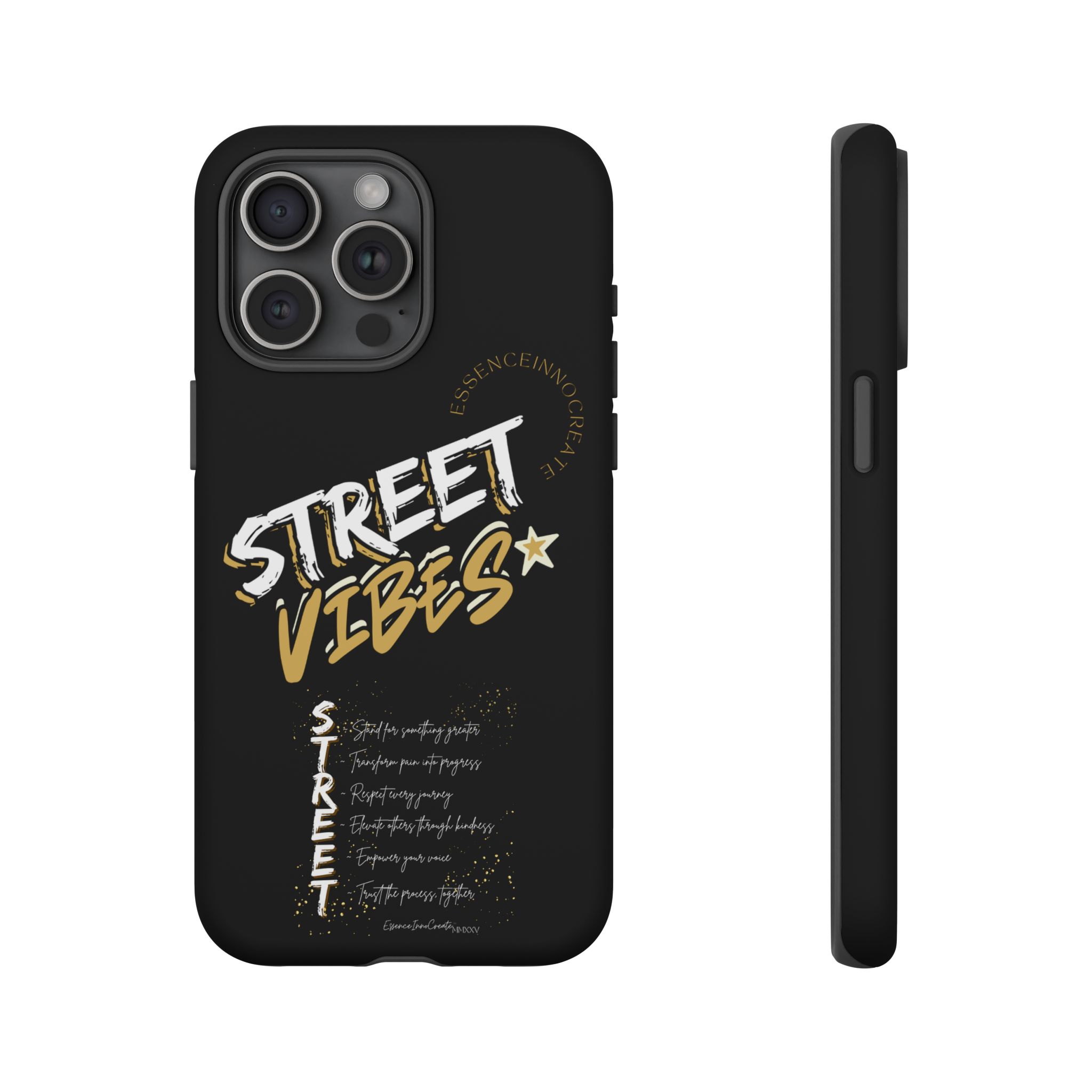 The Street Vibes Black phone case from EssenceInnoCreate is crafted for those who carry the pulse of the city in their hands. Designed with a matte black base and layered with bold, graphic street-style elements, this case becomes more than just protection—it becomes your mobile signature. From sidewalks to subways, it keeps up with your pace and keeps your phone looking sharp.