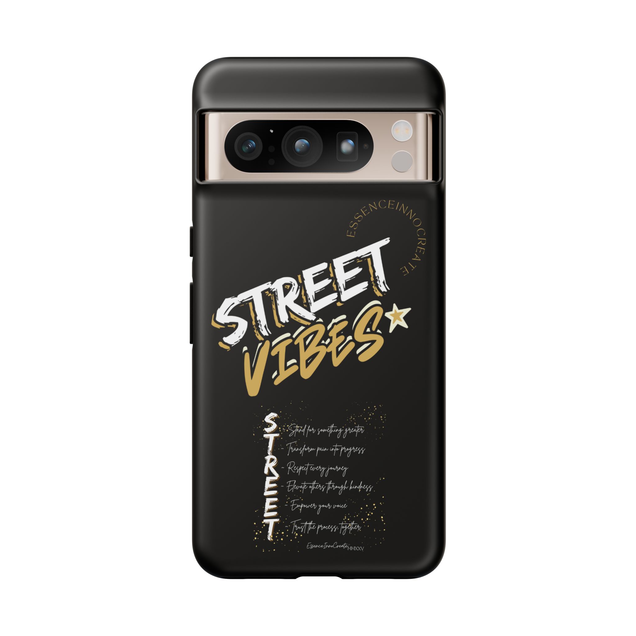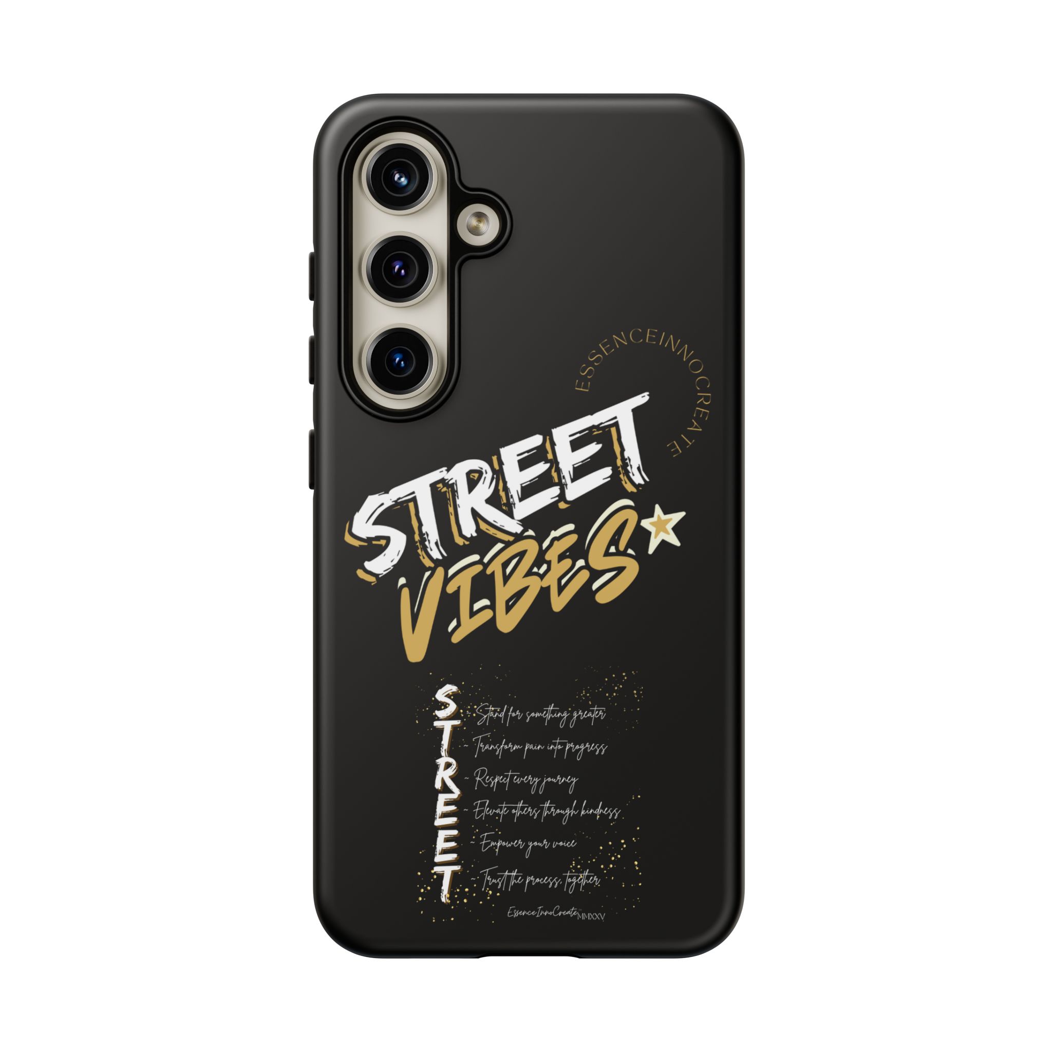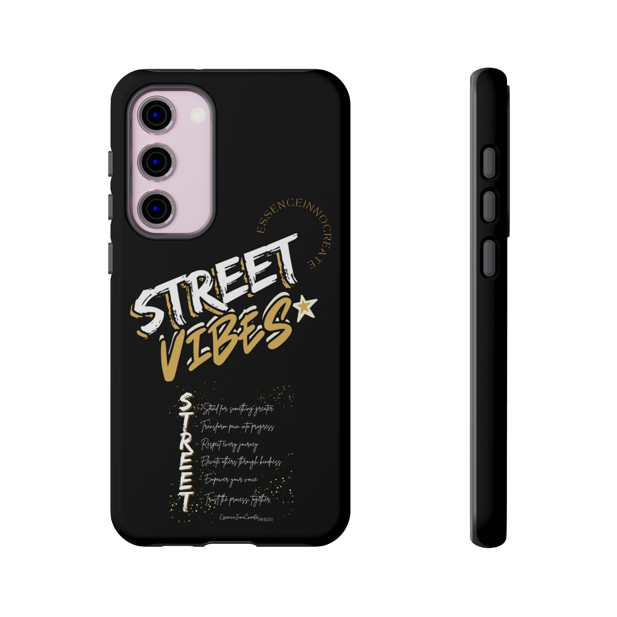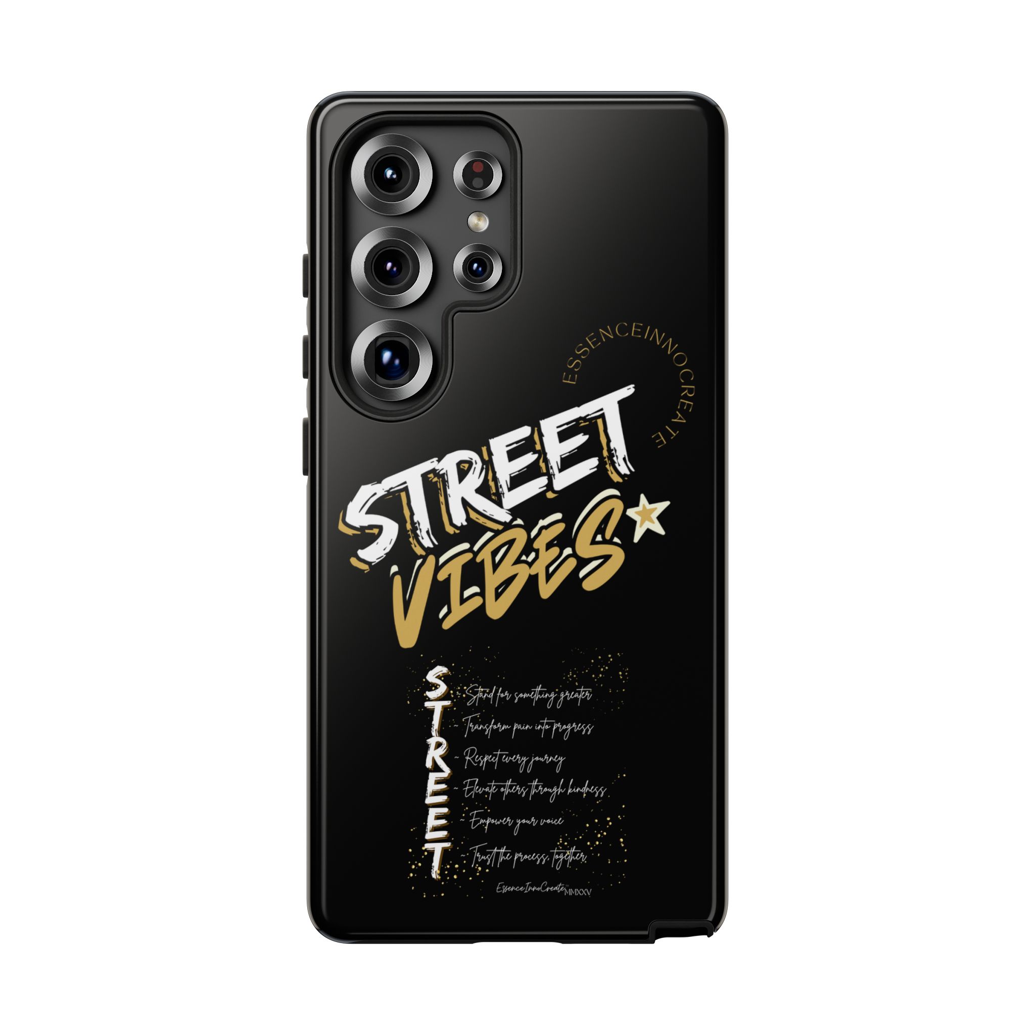 The Street Vibes Black phone case from EssenceInnoCreate is crafted for those who carry the pulse of the city in their hands. Designed with a matte black base and layered with bold, graphic street-style elements, this case becomes more than just protection—it becomes your mobile signature. From sidewalks to subways, it keeps up with your pace and keeps your phone looking sharp.