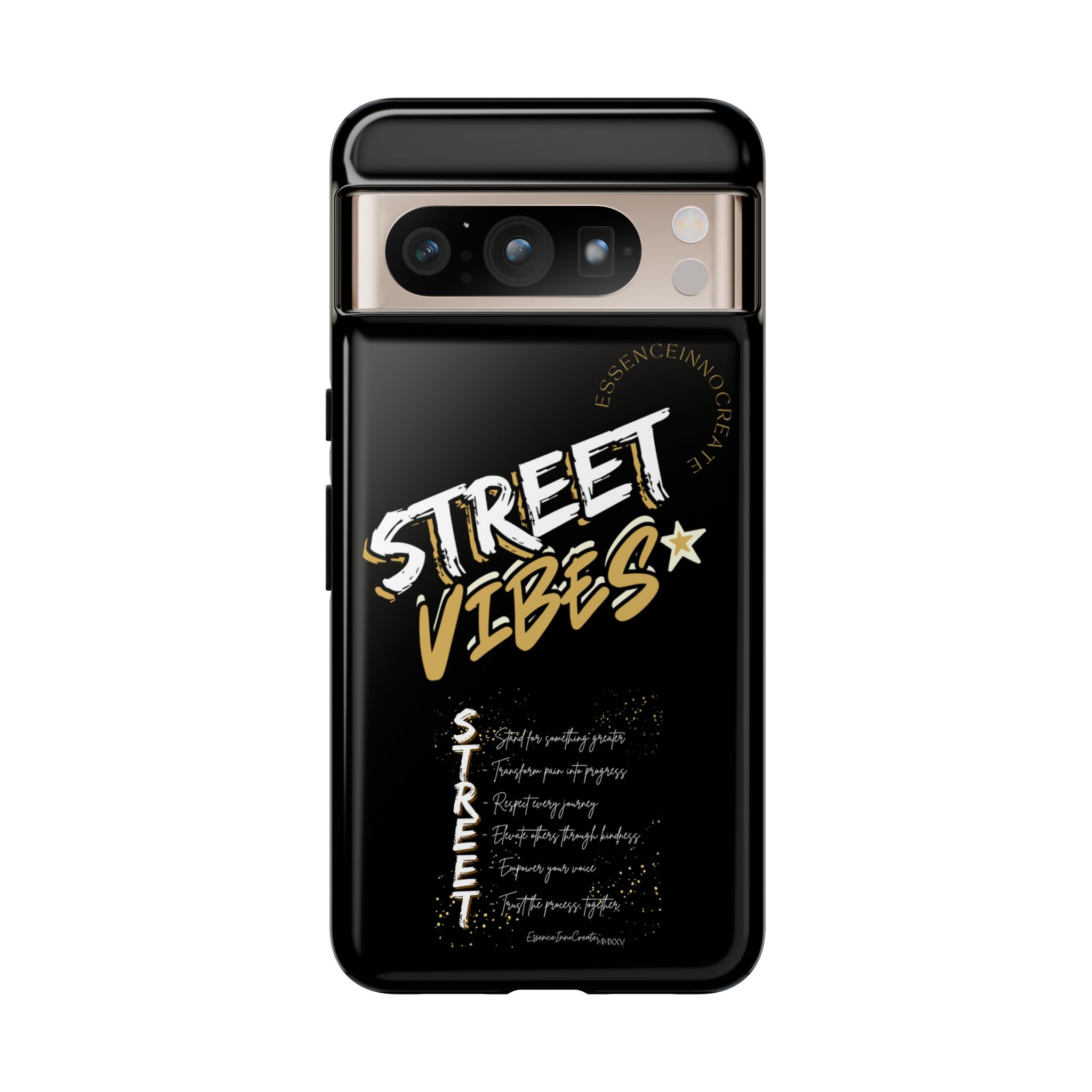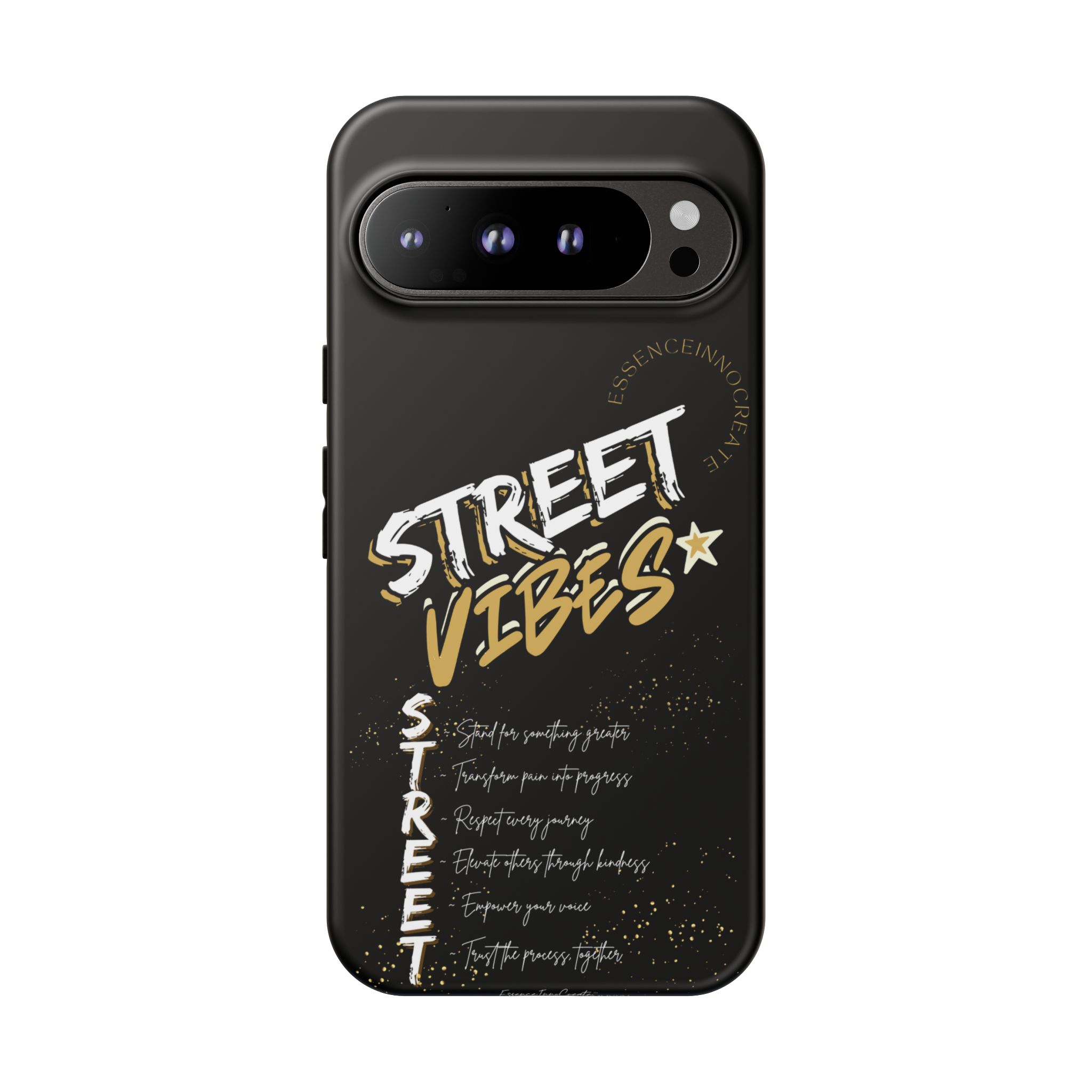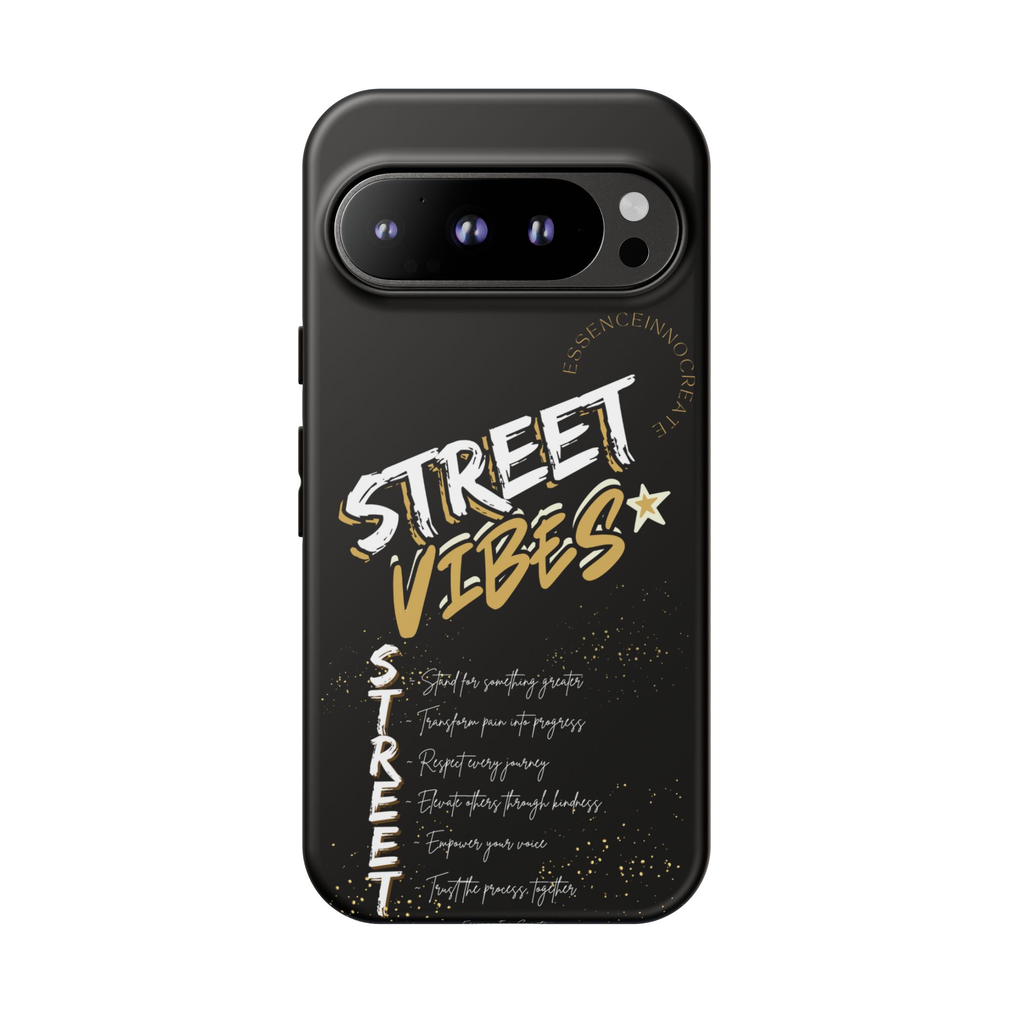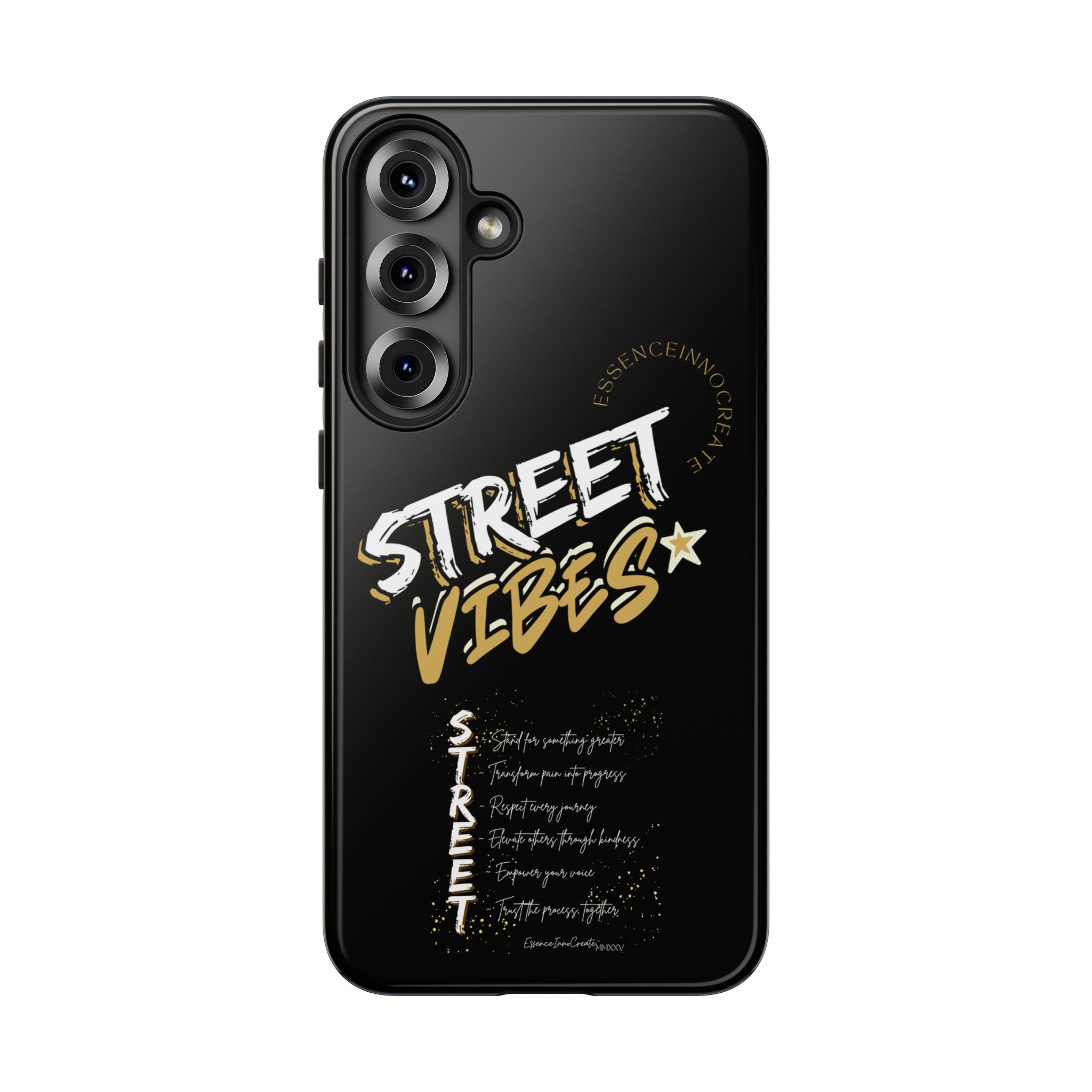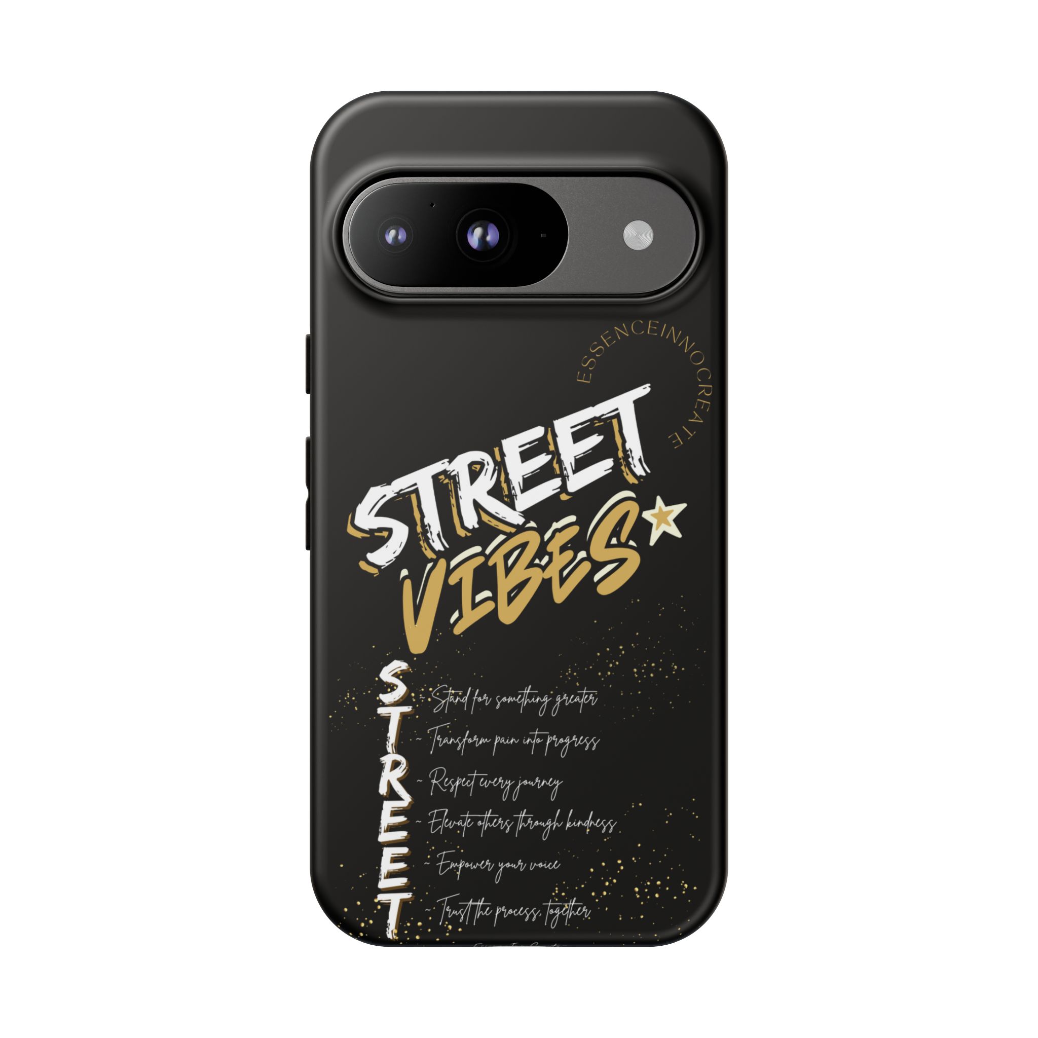 The Street Vibes Black phone case from EssenceInnoCreate is crafted for those who carry the pulse of the city in their hands. Designed with a matte black base and layered with bold, graphic street-style elements, this case becomes more than just protection—it becomes your mobile signature. From sidewalks to subways, it keeps up with your pace and keeps your phone looking sharp.