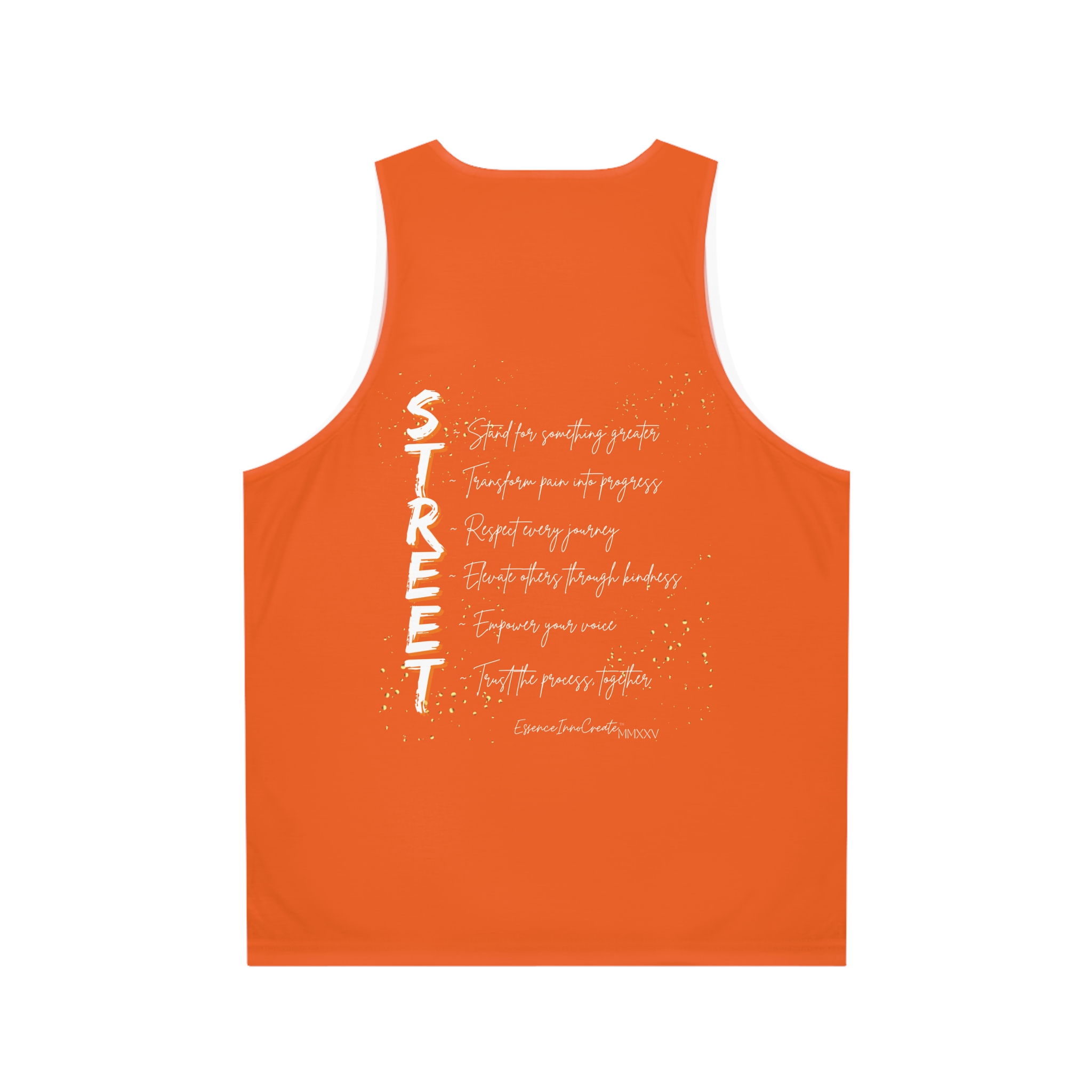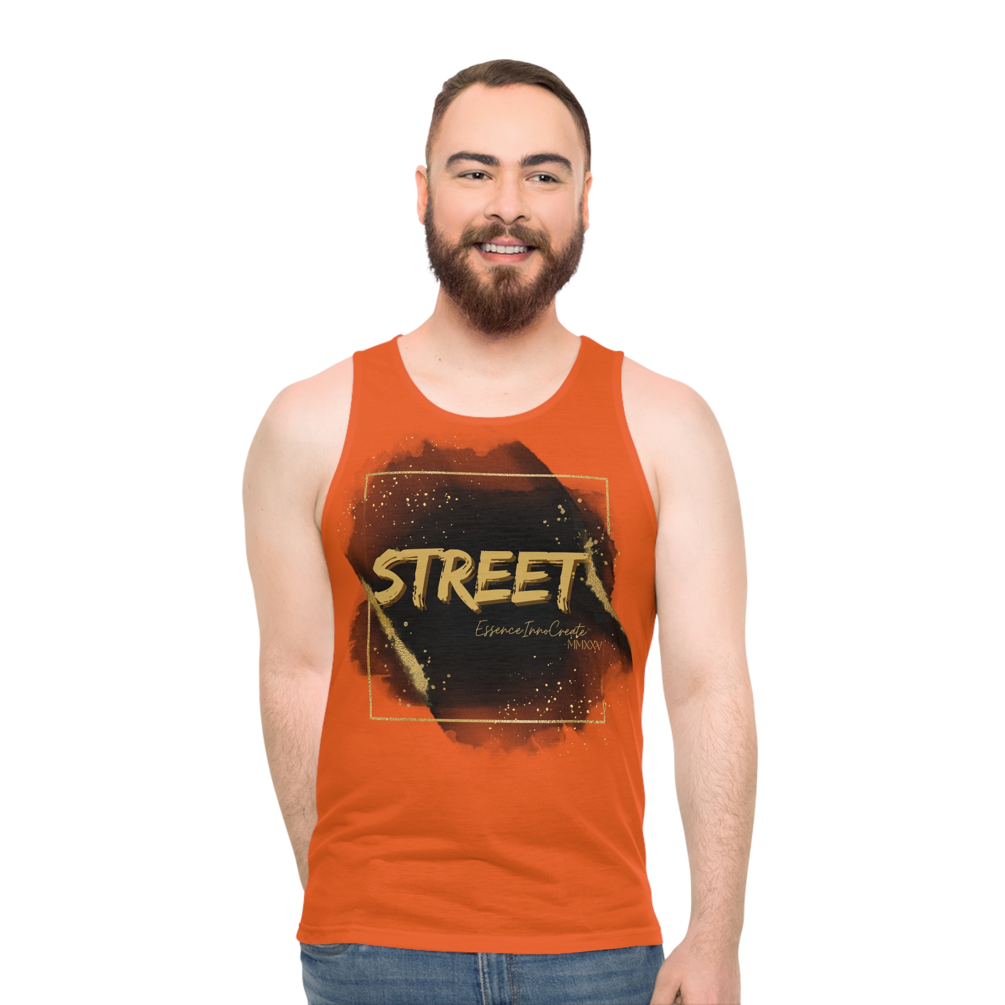 The Street Wear Tank XI | EssenceInnoCreate | Orange is built for those who want their style to radiate energy. With its bright orange base, this edition of the Street Wear series stands out instantly. On the front, the graffiti-style STREET graphic bursts in distressed gold and deep contrast. On the back, the STREET values design makes the message clear: