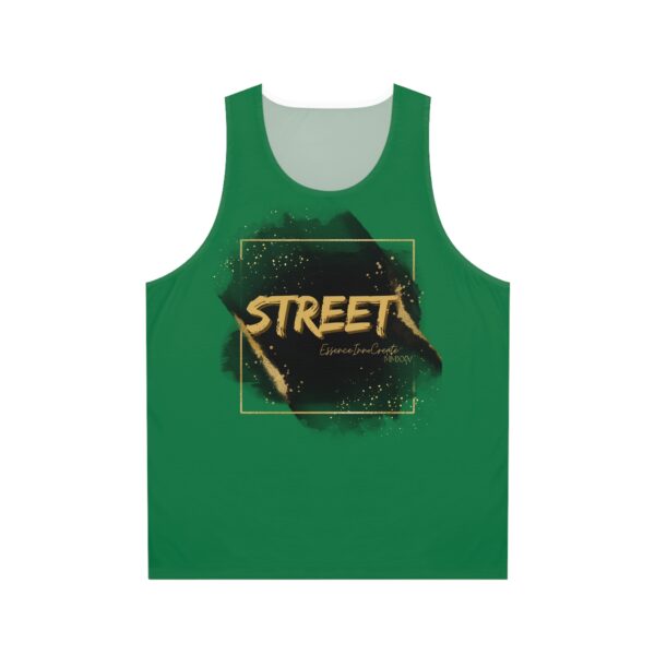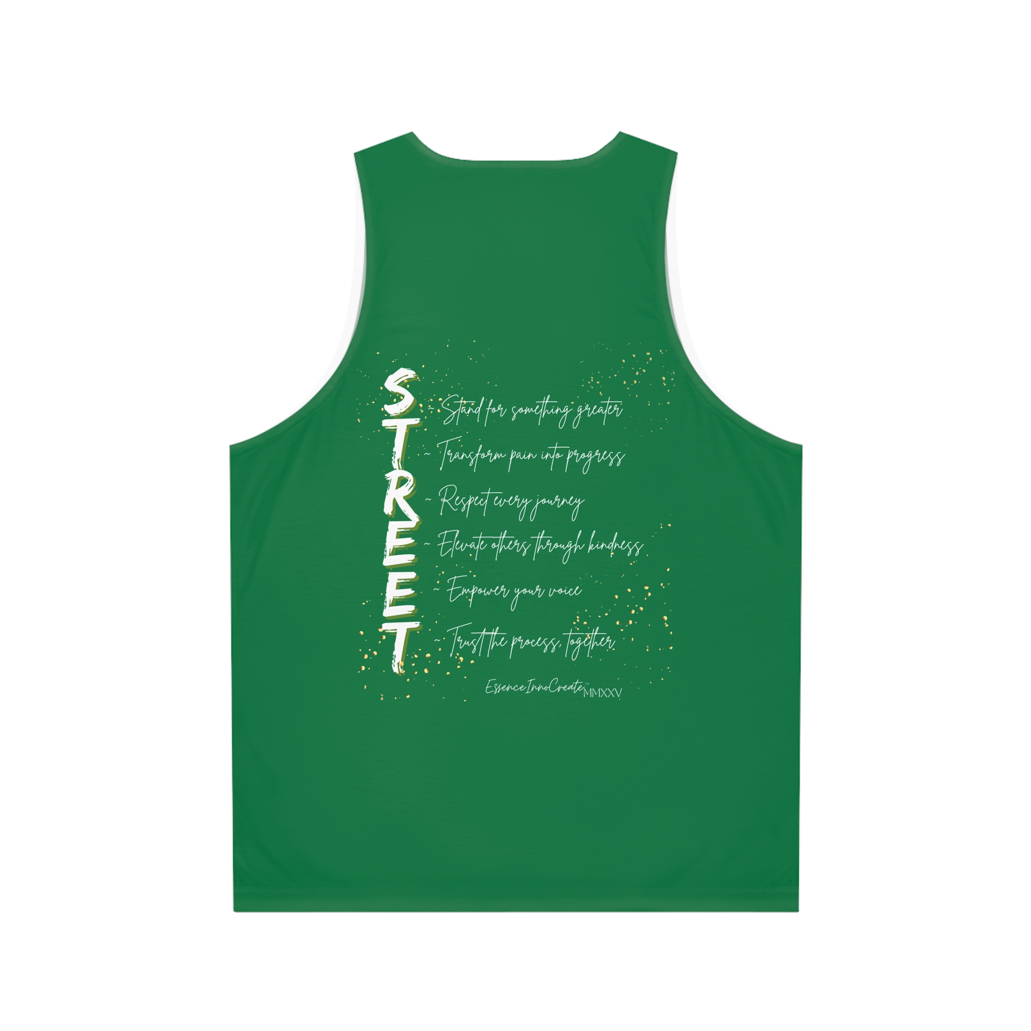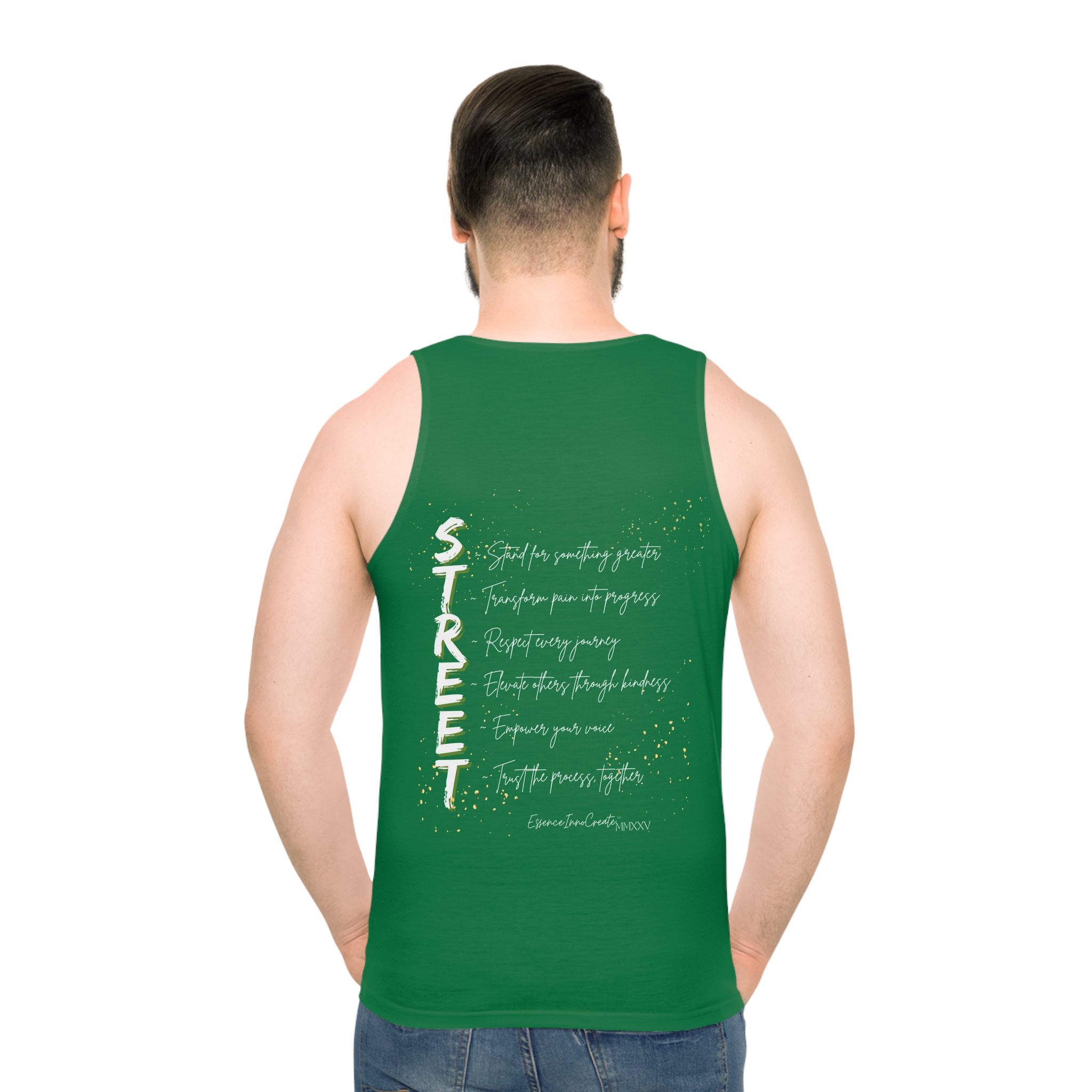 The Street Wear Tank XII | EssenceInnoCreate | Dark Green is a statement of balance and resilience. Its deep green base symbolizes grounded energy and quiet strength, making it one of the most versatile tones in the Street Wear series. On the front, the graffiti-style STREET graphic pops in distressed gold against the rich backdrop. On the back, the STREET values design carries its timeless reminder: