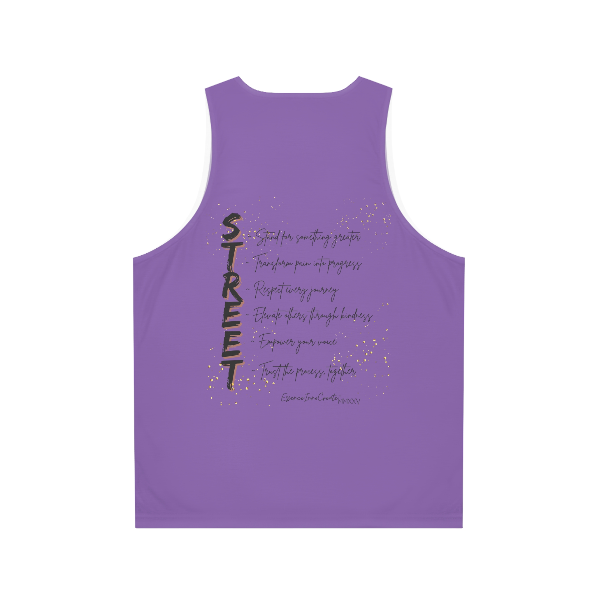 The Street Wear Tank XIX | EssenceInnoCreate | Soft Purple balances quiet elegance with undeniable purpose. Its soft purple base provides a muted yet refined tone, making the distressed gold graffiti STREET graphic on the front stand out with texture and power. On the back, the STREET values design—printed in deep charcoal with gold flakes—delivers its timeless reminder: