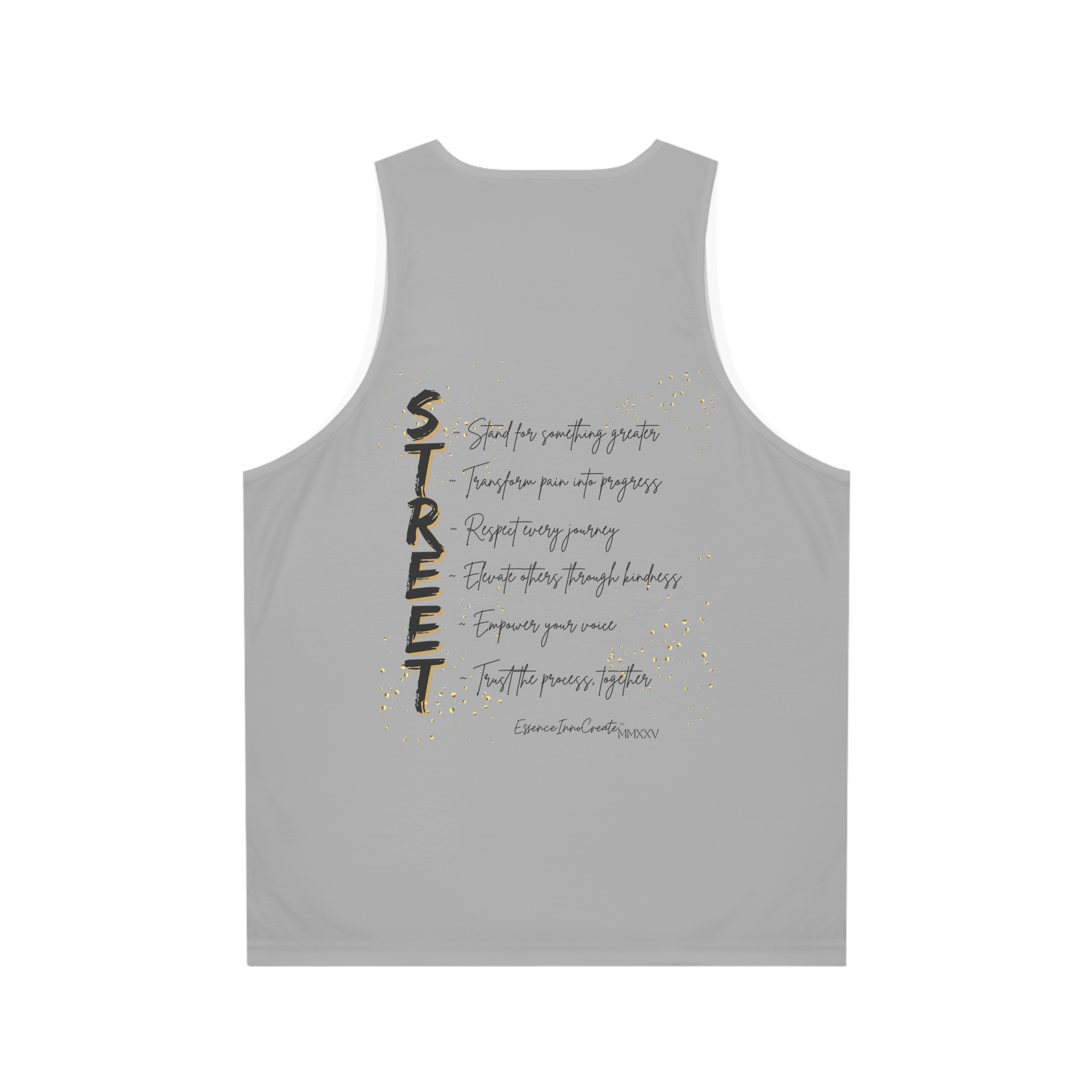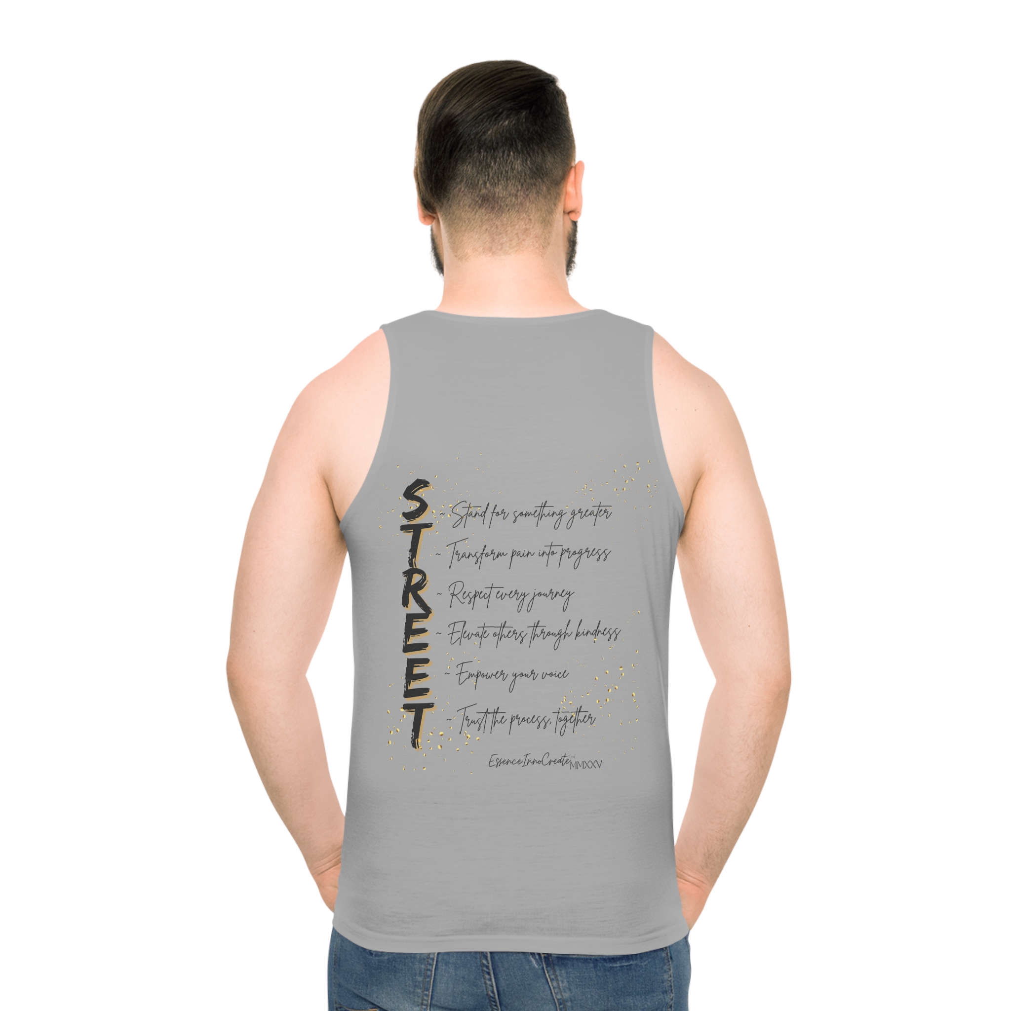 The Street Wear Tank XXVI | EssenceInnoCreate | Light Grey delivers understated strength and adaptability. Its light grey base offers a neutral foundation, letting the distressed gold graffiti STREET graphic on the front stand out with depth and texture. On the back, the STREET values design—lettered in deep charcoal with gold flakes—reinforces the principles that define the collection: