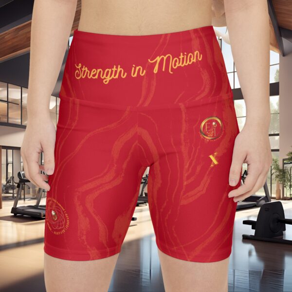 Stripes In Motion X dark red workout shorts. High-waisted, moisture-wicking women’s shorts with compression support and sleek striped design.