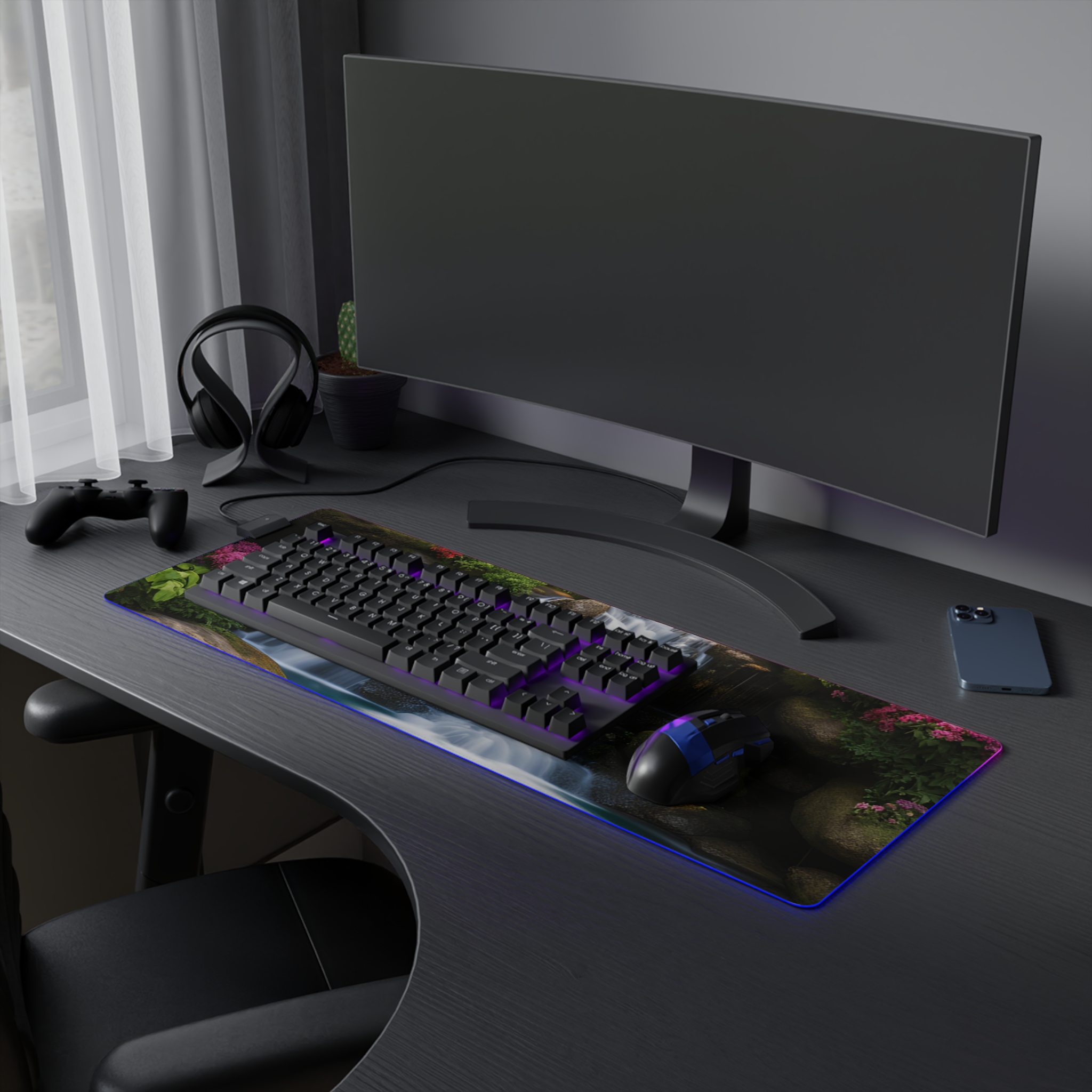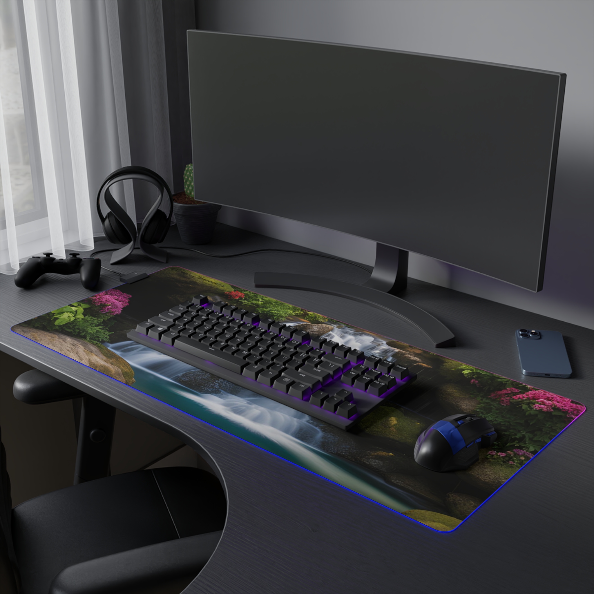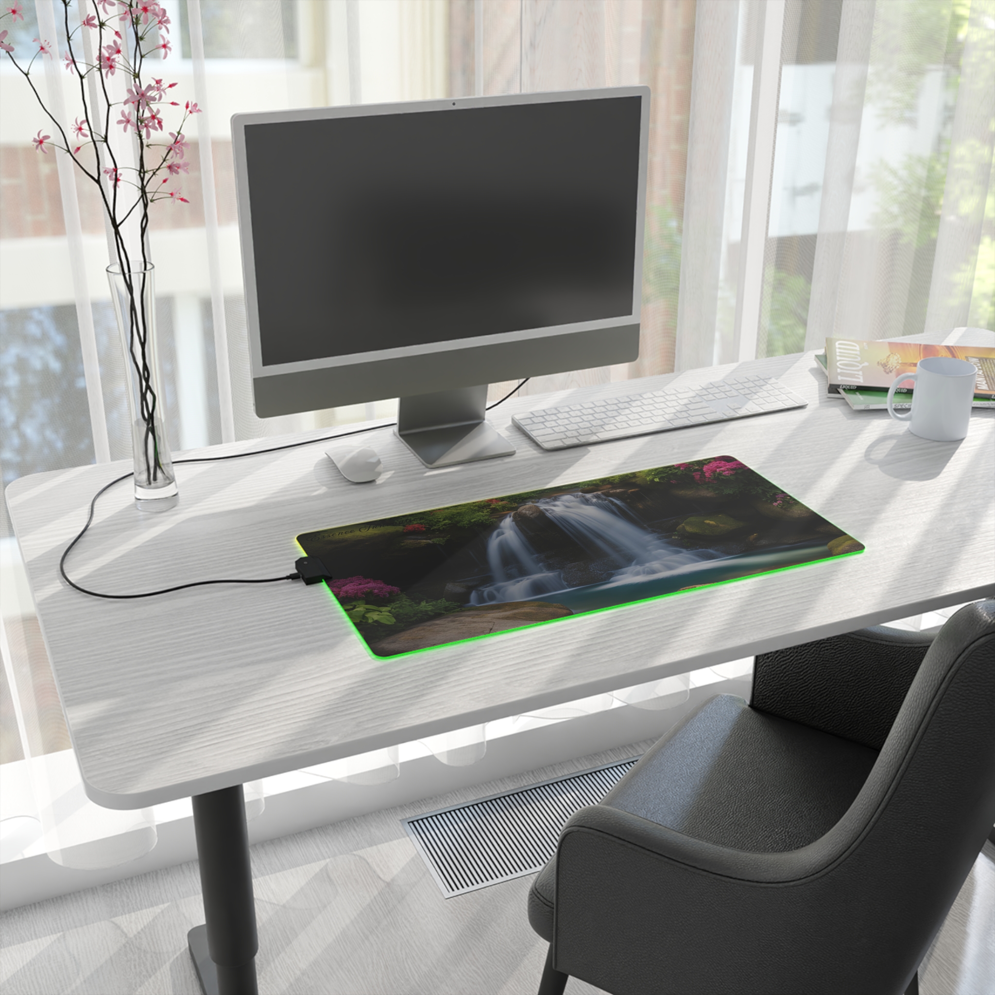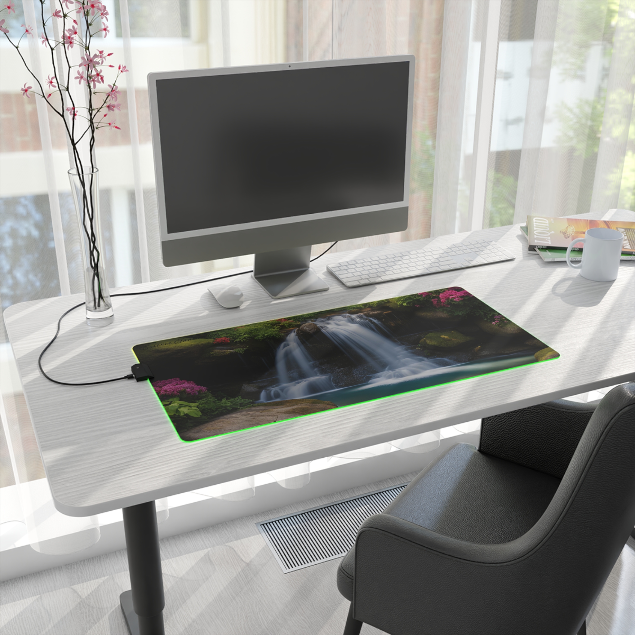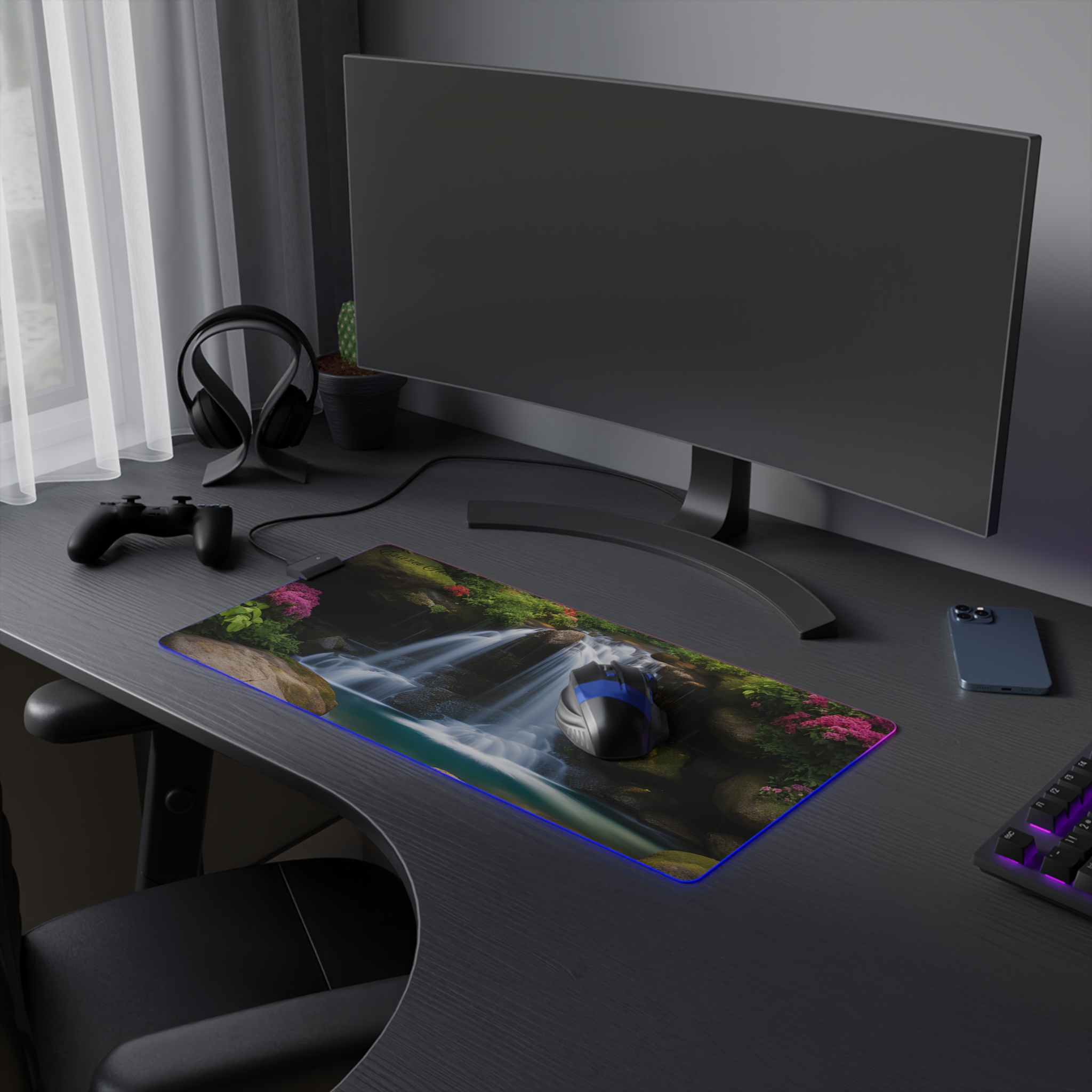 The Tranquil Falls LED gaming mouse pad features a serene waterfall design, RGB edge lighting, and a smooth precision surface in 4 sizes.