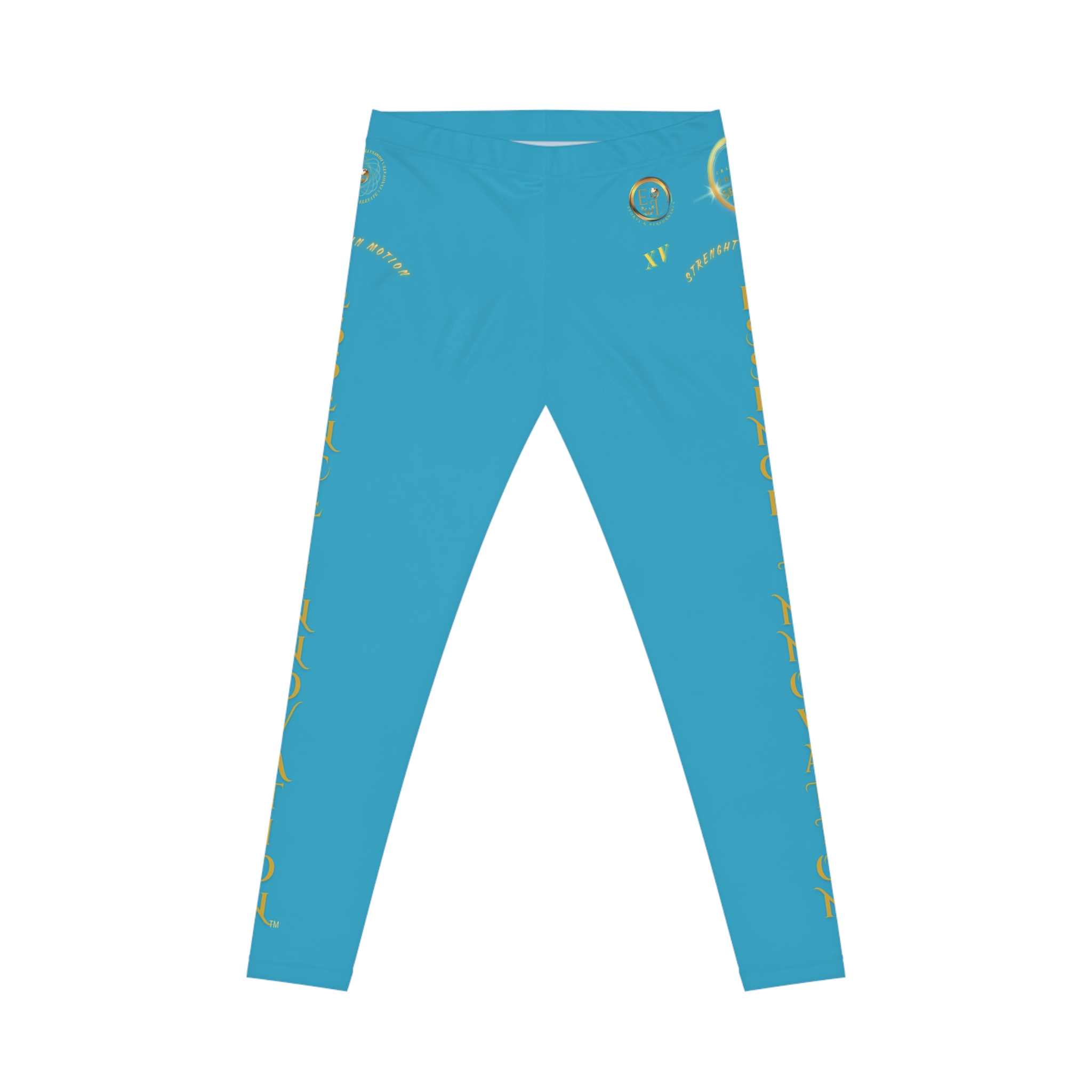 Women’s Casual Leggings XV in turquoise — silky, sleek, and versatile. Roman Numeral XV design reflects vitality, balance, and refreshing strength.